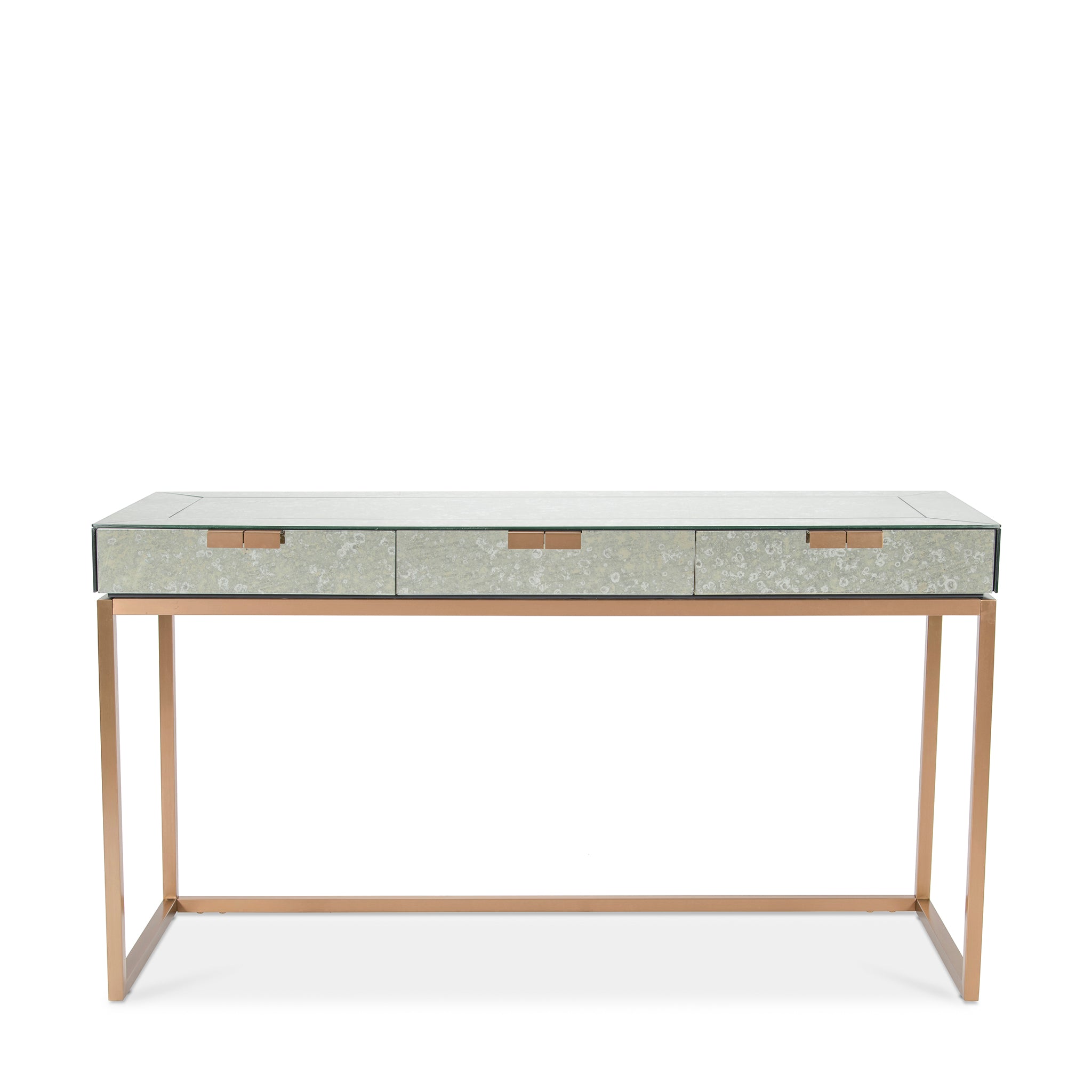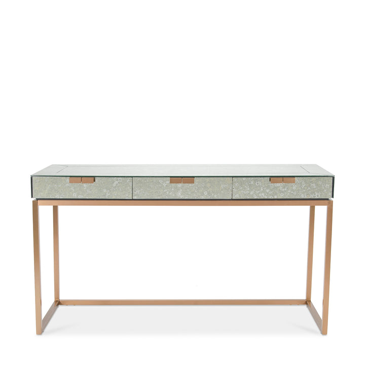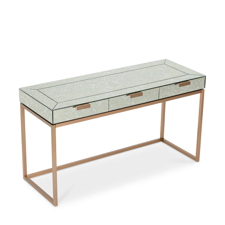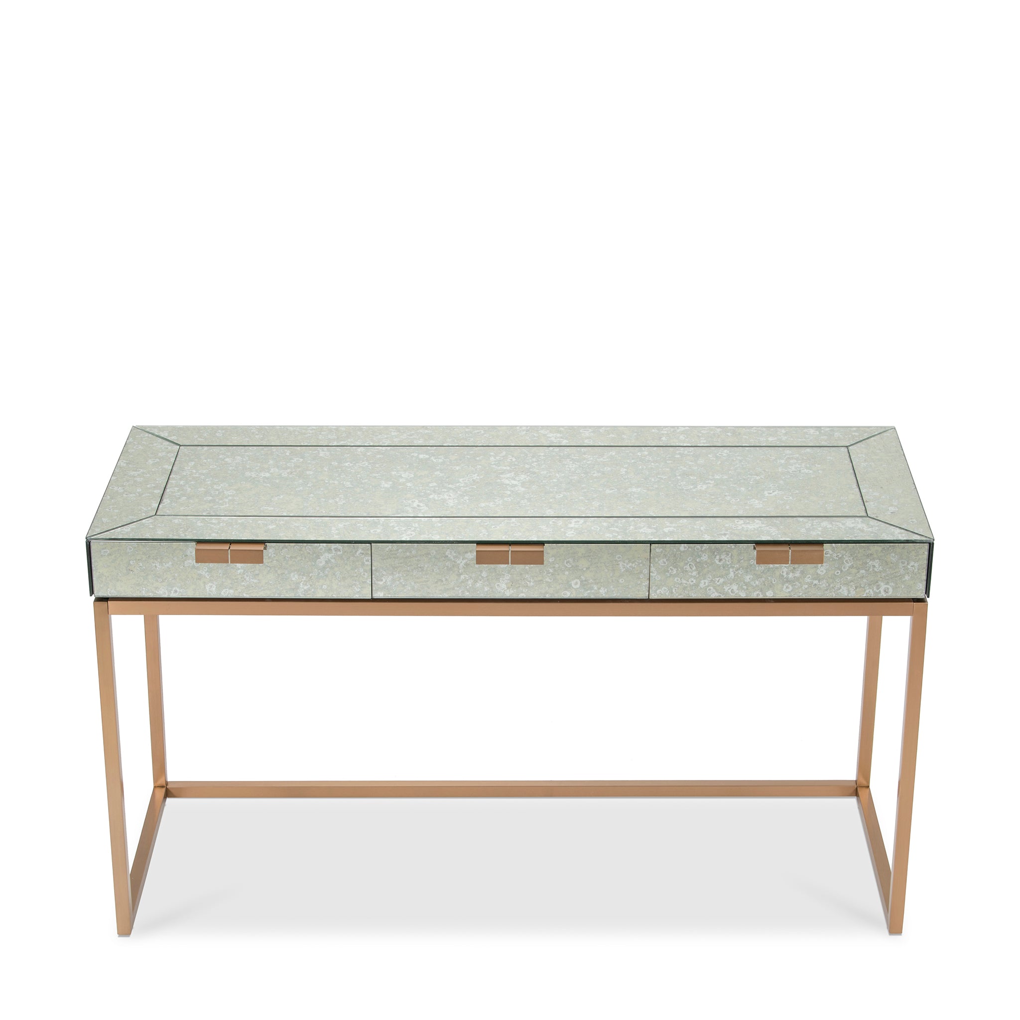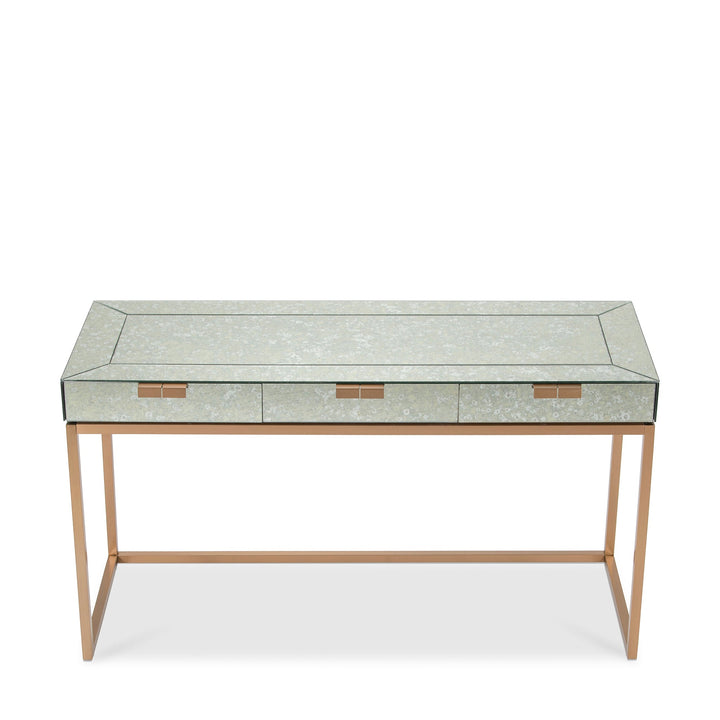 The Gallagher II Desk embodies an Antique Mirror cladding on top and overall sides. It has three soft-closing drawers in a Light Beige Lacquered finish, lending a spacious and contrasting aesthetic. The Stainless Steel legs matching the hardware knobs are finished in a delicate electroplating technique, which results in a Brushed Brass look. Being adaptable, it can be used on a float or against a wall.