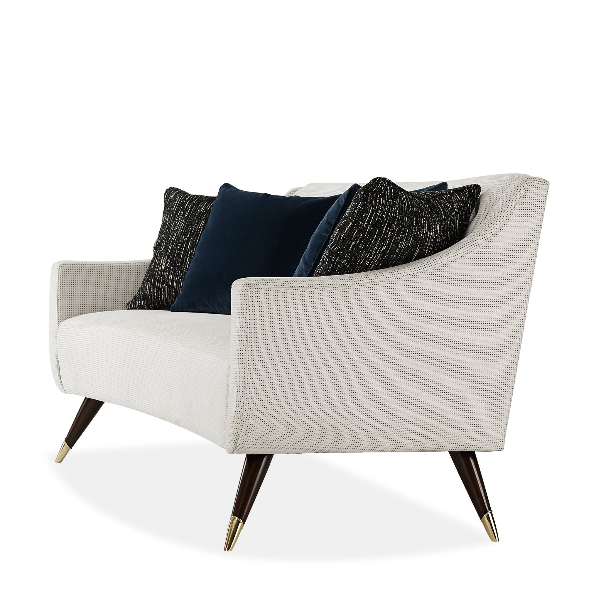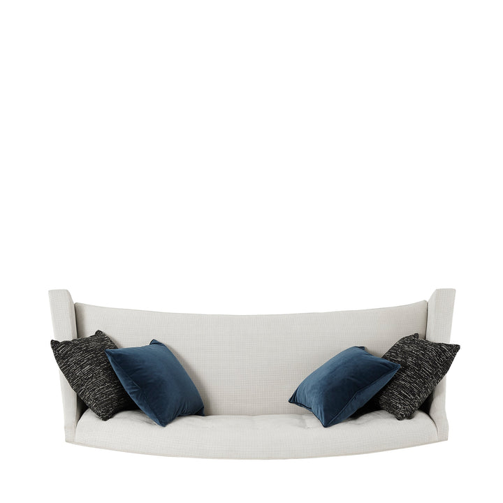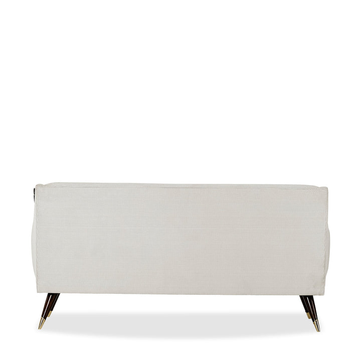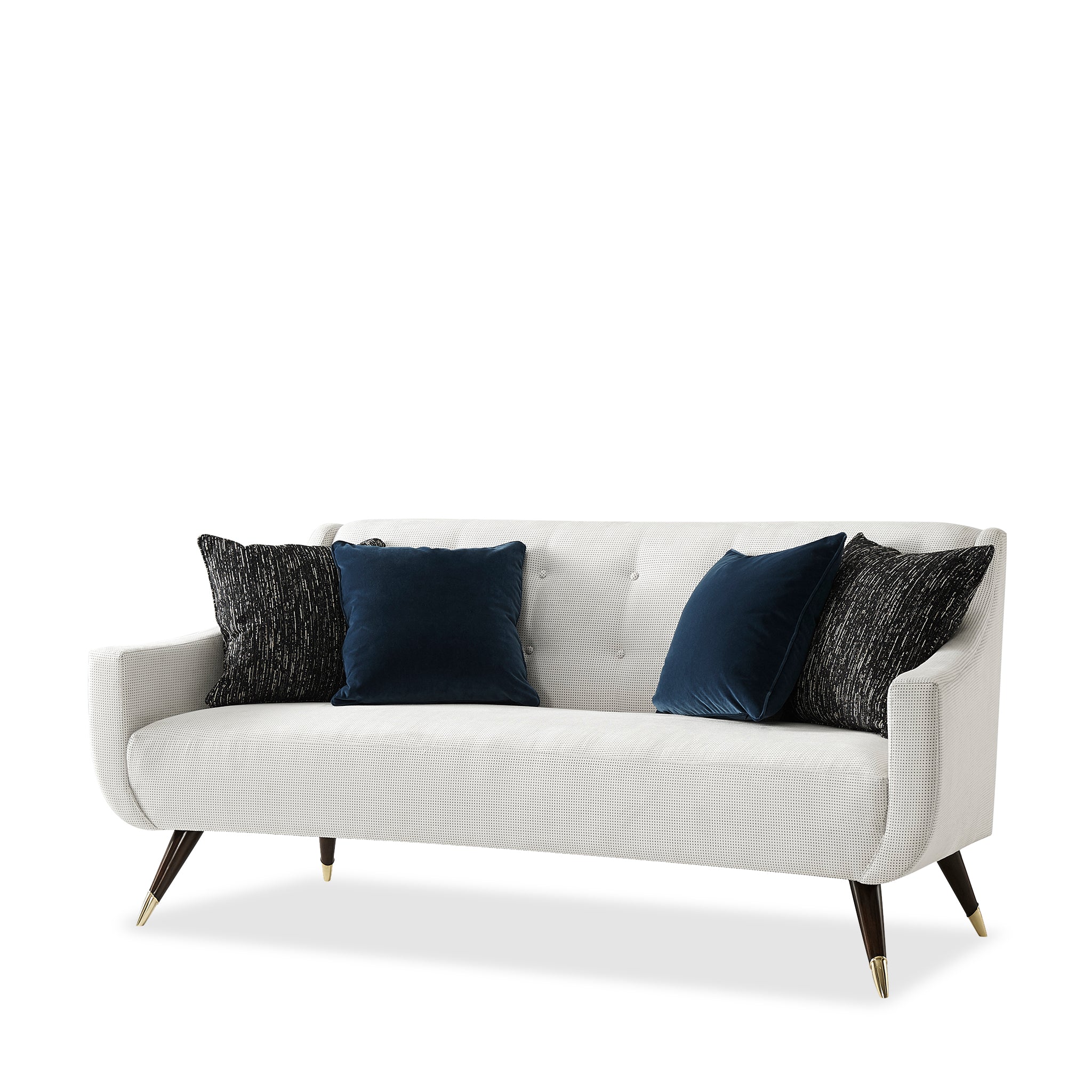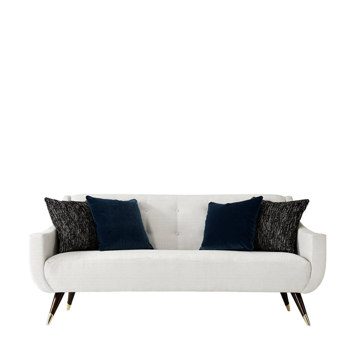 Whether entertaining guests or enjoying moments of solitude, this sofa exudes an aura of grandeur. The modern curved silhouette of this premium piece features a buttoned tight back and seat and Mahogany Brass polish. Exuding fine glamour are the splayed legs, symbolizing grace and elegance. Four Throw pillows offer sheer comfort.