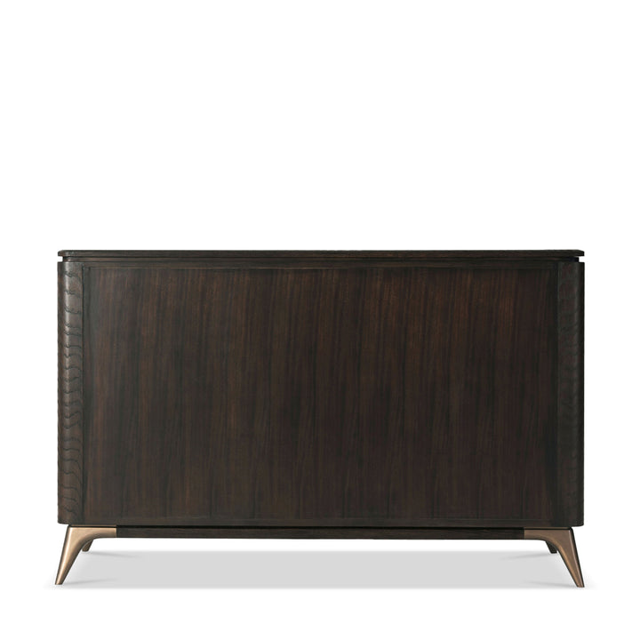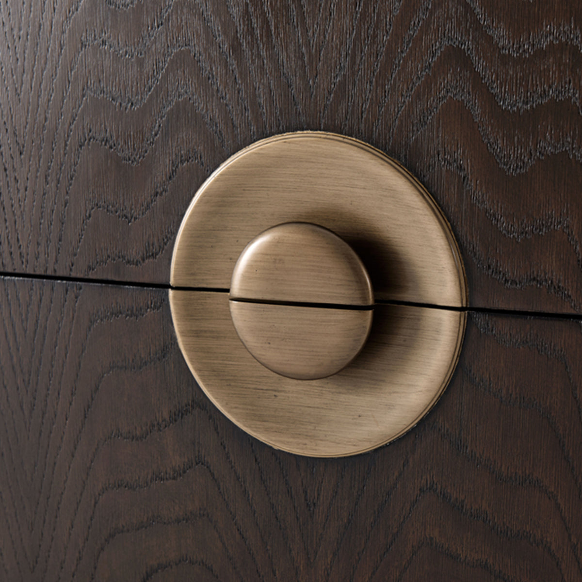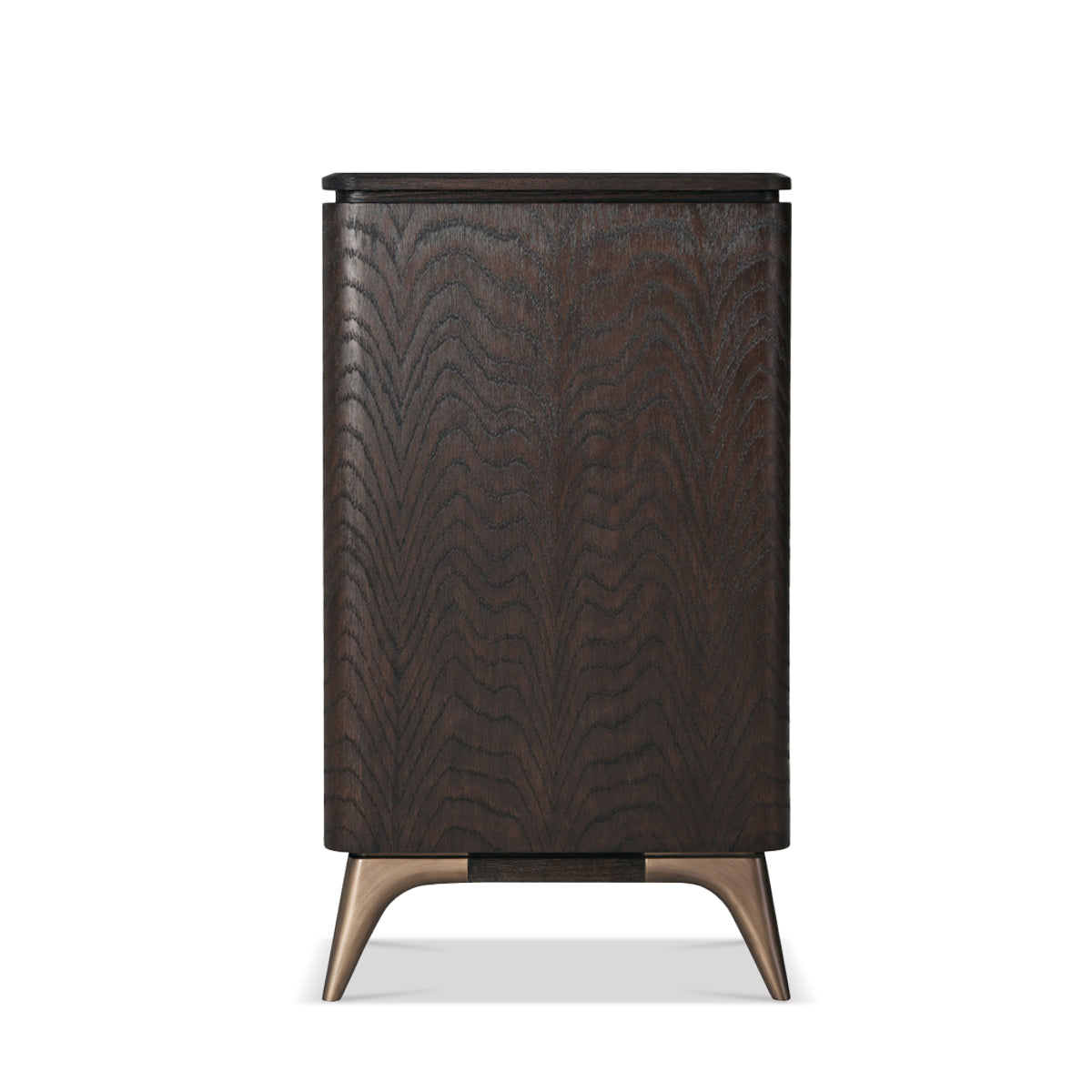 Artisan crafted British colonial-style chest of drawers to suit the eclectic living spaces. An Oak veneered with radial matched 'cigar club' finish is characteristic. Three compartments of drawers with overlapping 'relief roundel handles' are attached to the lower two drawers. Splayed leg pattern that gleams with a 'heritage bronze' finish is an unparalleled deco style.