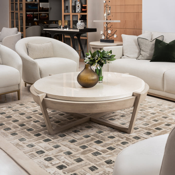 The AH Signature Cocktail Table is a one-of-a-kind handcrafted structure that deviates from the usual in terms of its contemporary and classic design. The top is made of Ivory Marble, and it is shaped like a circle. The legs have an angle intersection, giving them a sophisticated aspect. This artwork makes efficient use of space and is a beautiful addition to the aesthetic of any setting.