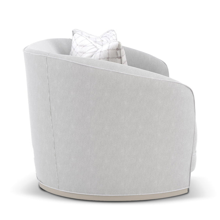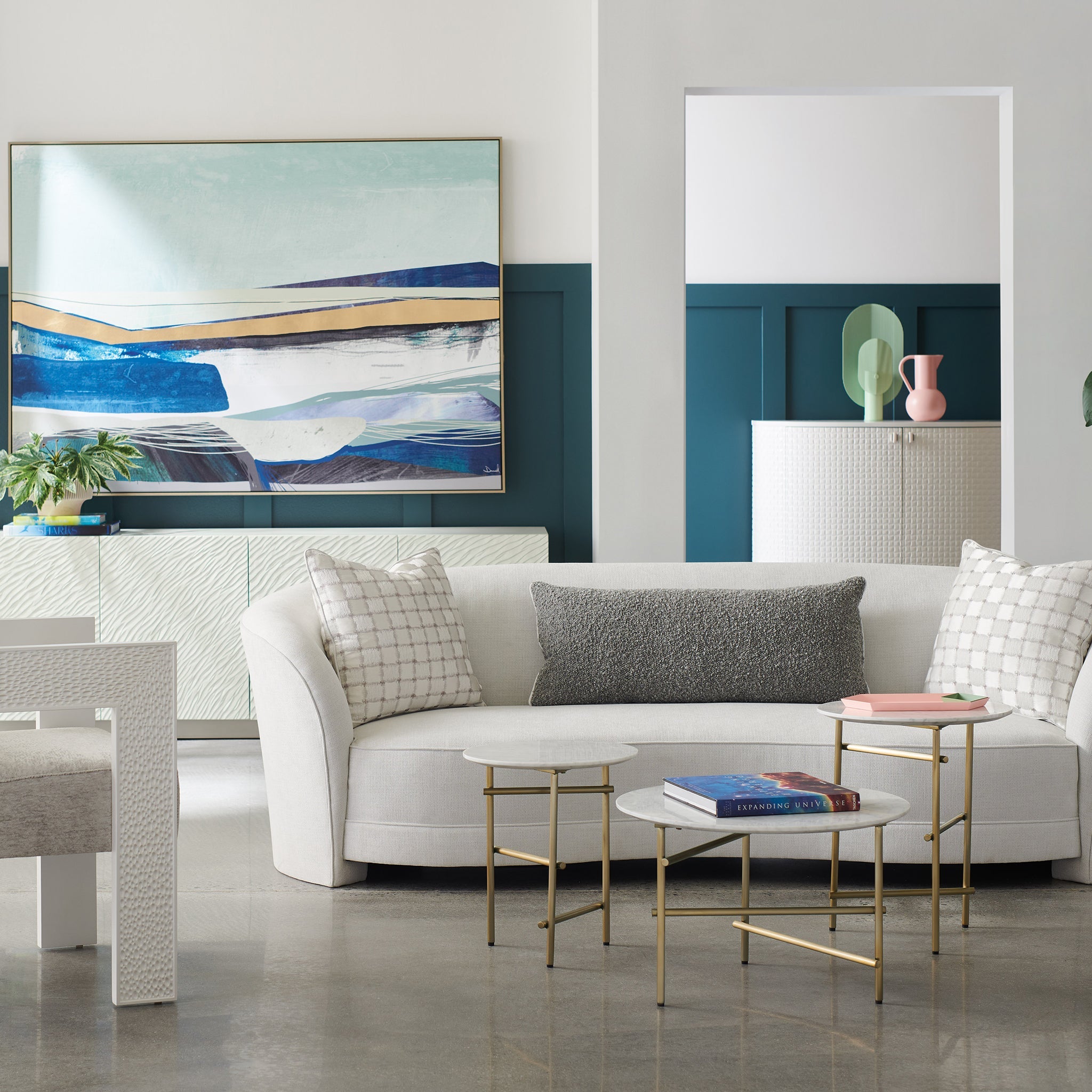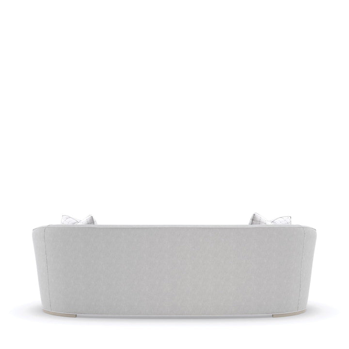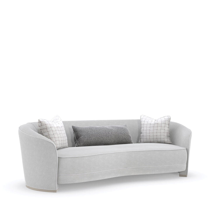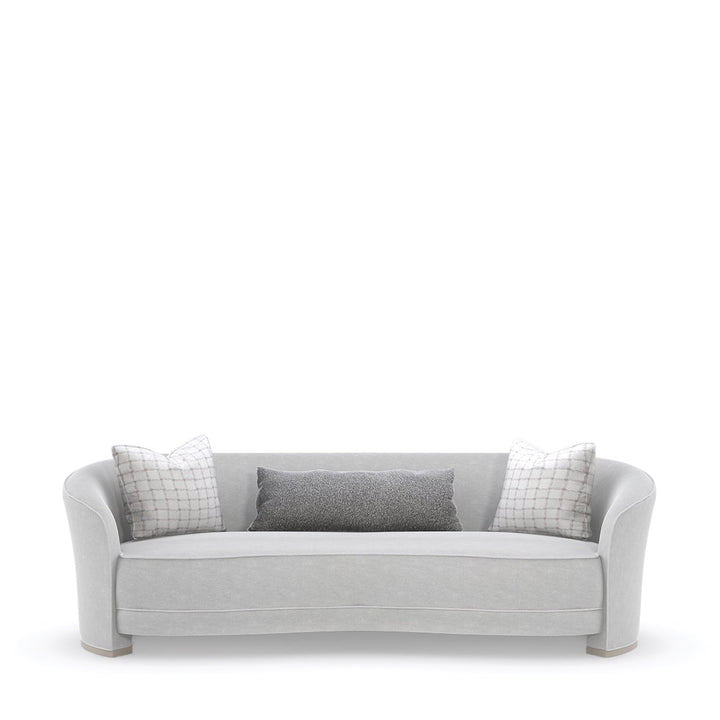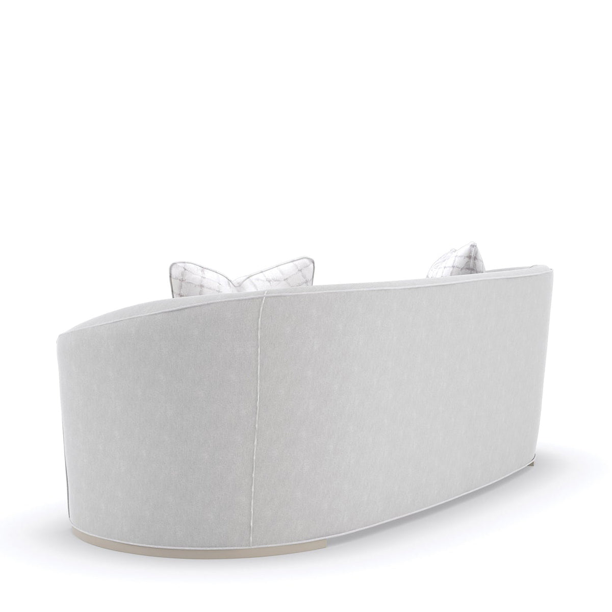 The Ahead Of The Curve Sofa will surround you with ease and comfort. Its curved backrest appeals as an ornamented silhouette discarding the conventional linear profile. The soft and cushy Micro-chenille fabric brings comfort and class altogether. Two Checkered accent pillows and an extra-long lumbar pillow in Faux Shearling create contrast and texture. Matte Pearl finish in the plinth base elevate its luxurious look.