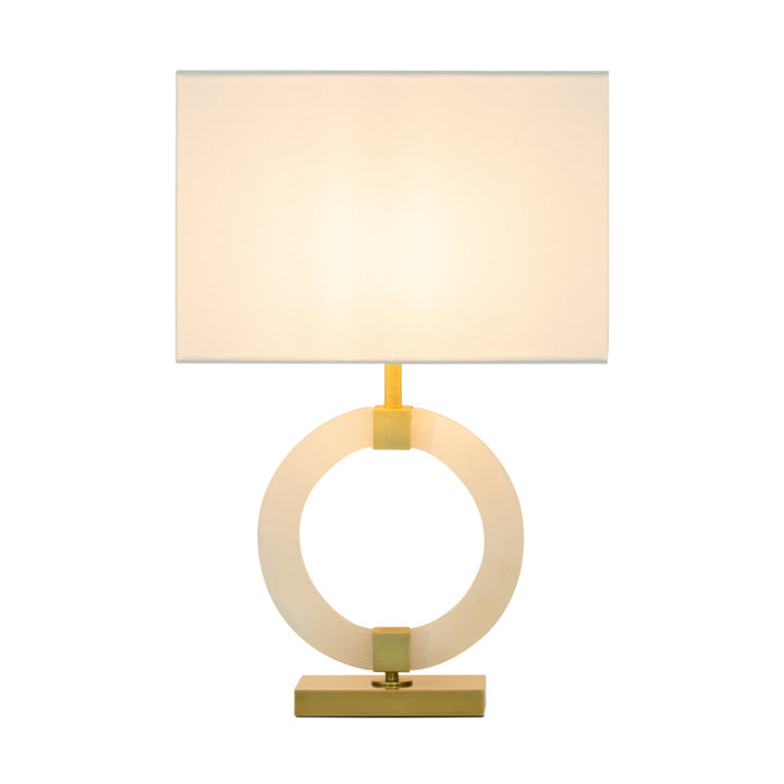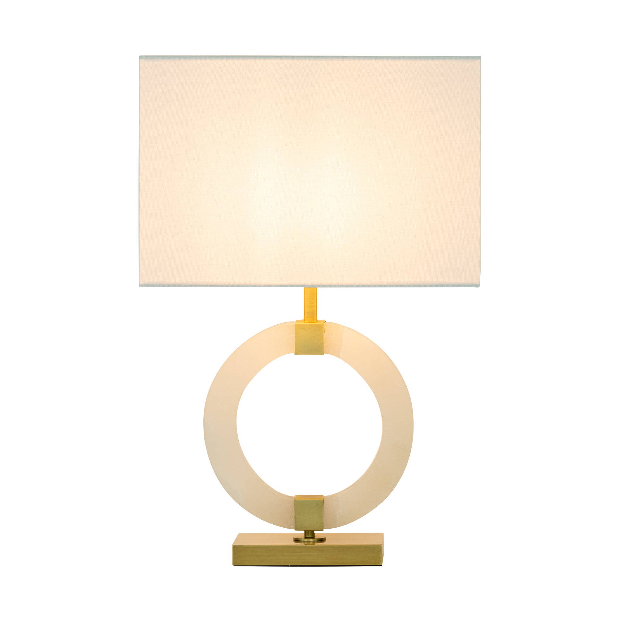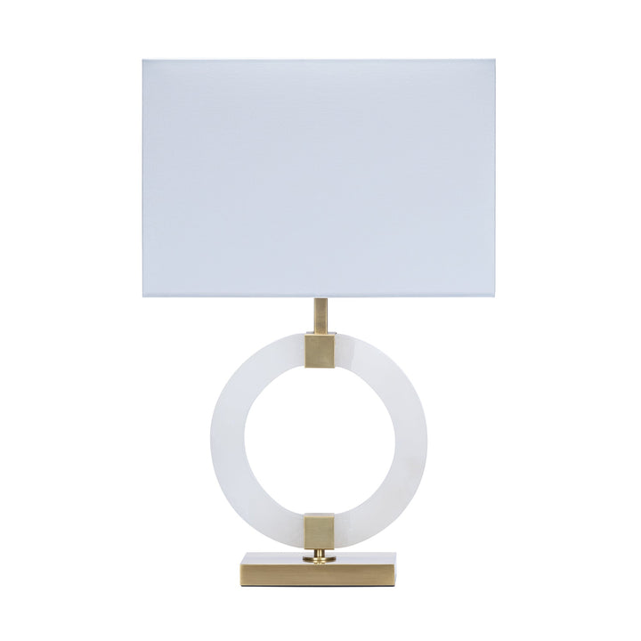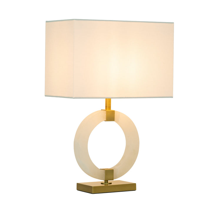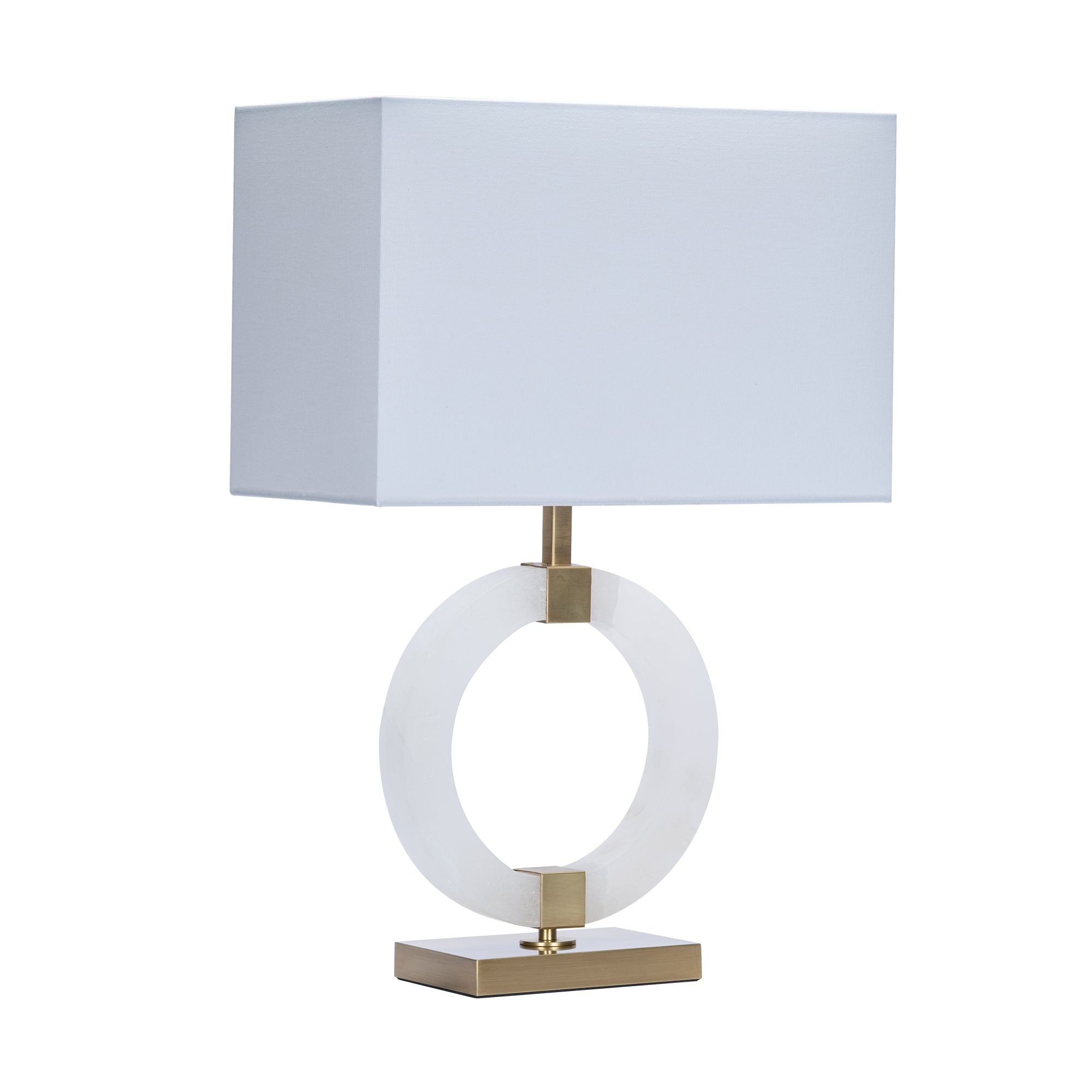 Bringing your interiors to life, the Alabaster Table Lamp flaunts a round-shaped frame in White Alabaster with Antique Brass-finished metal accent. The rectangular shade wrapped in Beige Linen fabric infuses comforting lighting, perfect in your bedroom.