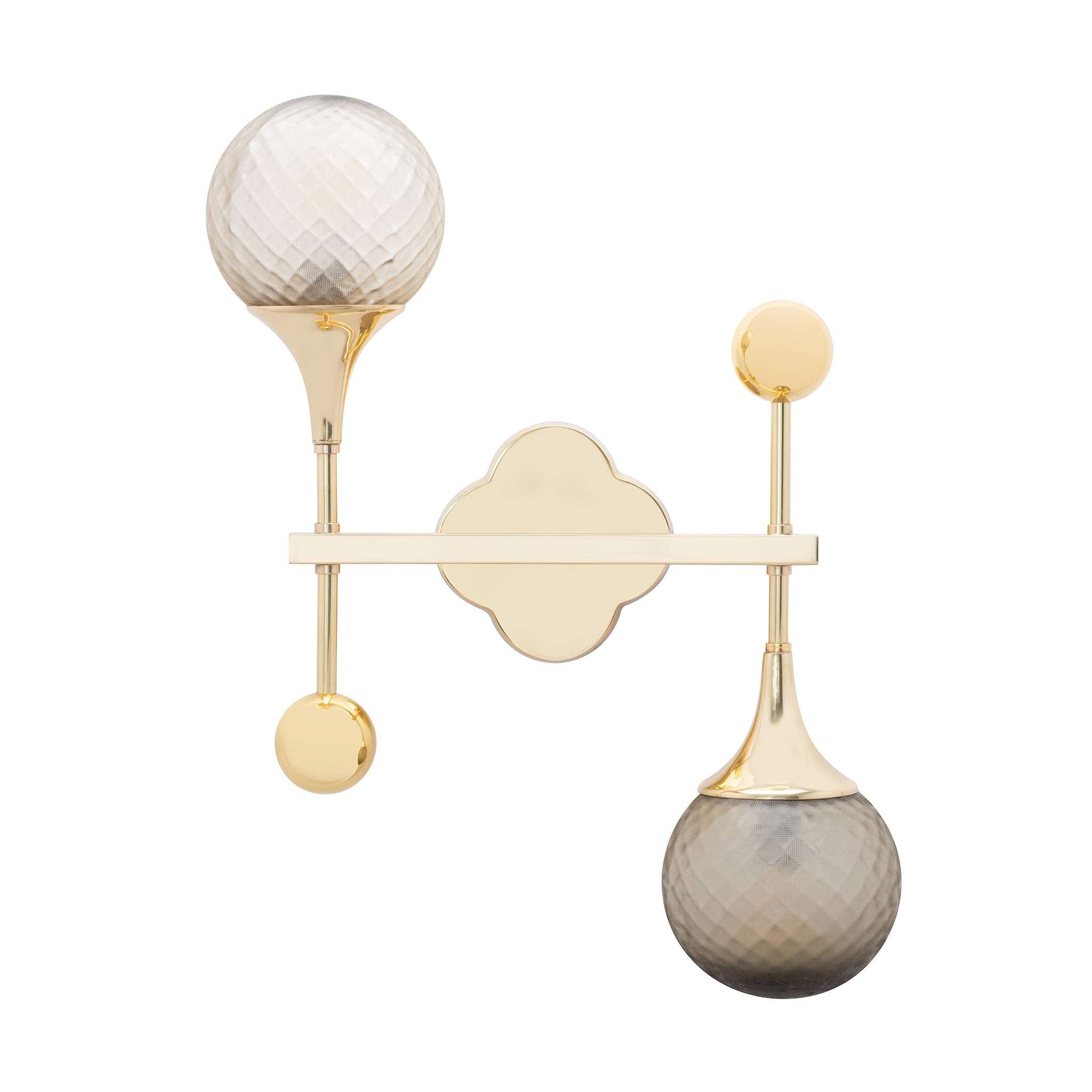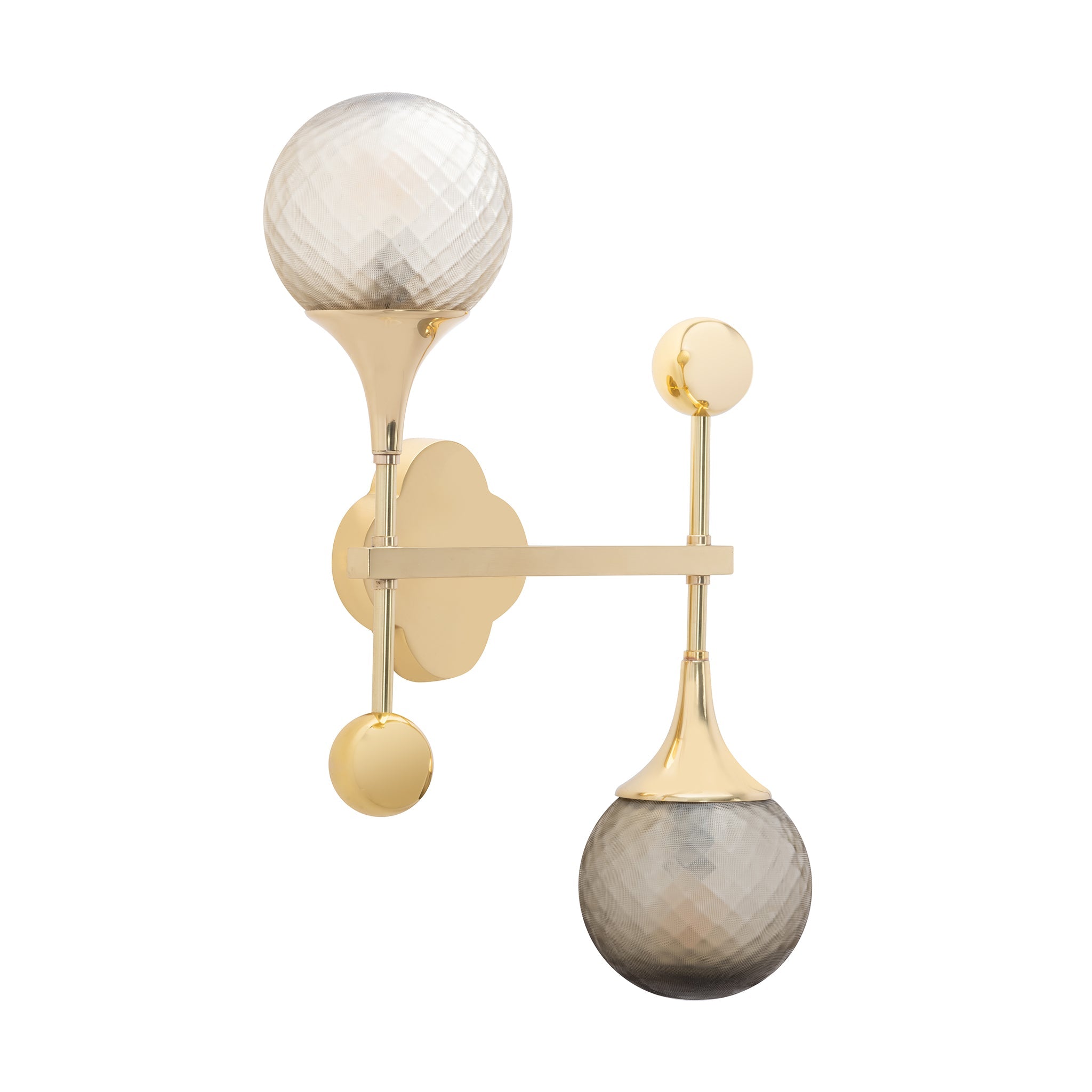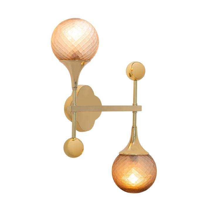 Light up your room while decorating the walls with the Alhambra Sconce. Its Polished Brass finish flaunts a gleaming look ideal for any lavish setting. Supported by two arms hanging in opposite directions, the Grey Glass shades diffuse ambient lighting, creating a relaxing ambiance.