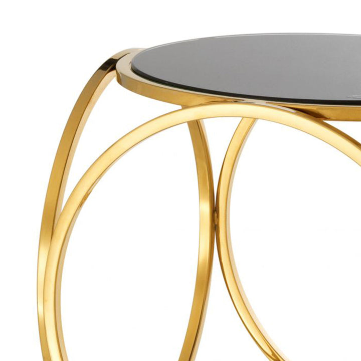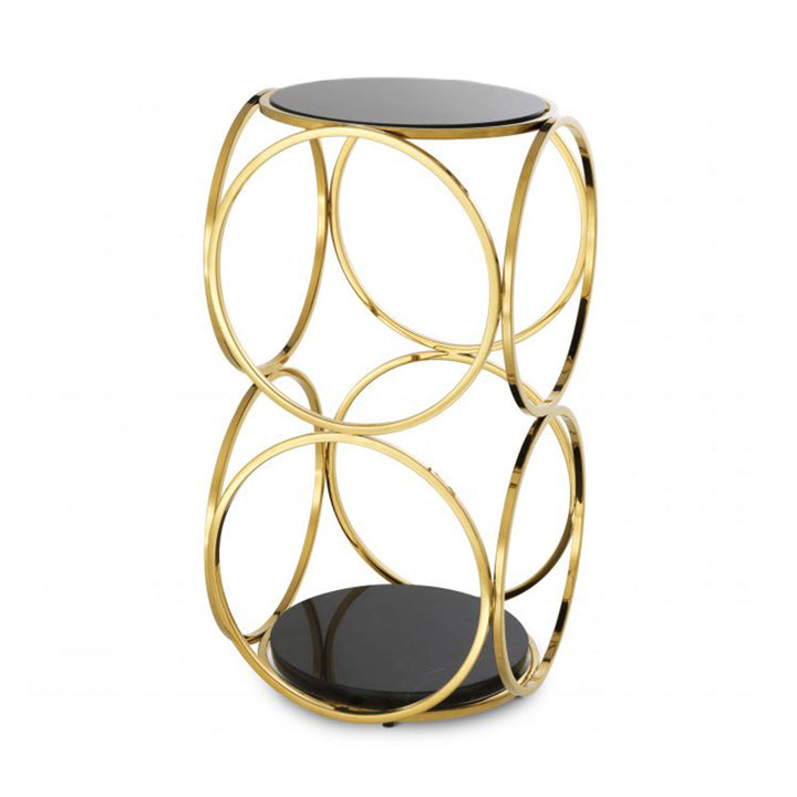 The beautiful arrangement of Gold-finished circlets makes this side table a sight to behold. To complement the intriguing base, it features a Black Marble base and a Black Glass top. Alister adds richness to your living's visual appeal then and there.
