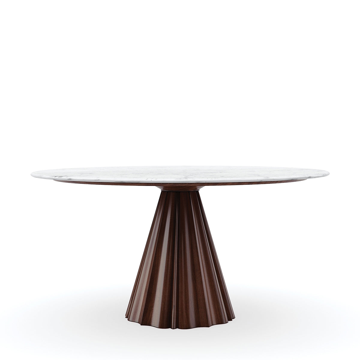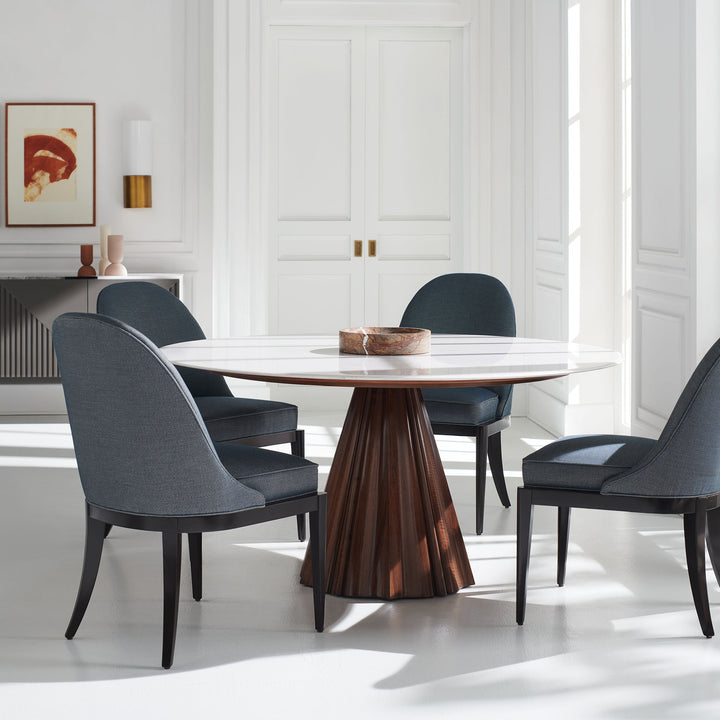 If your home has a minimalist and alfresco vibe, this is the one for you! Mounted on a sculptural conical base finished in Rich Walnut, it offers a striking appearance. Adding to its aesthetics is a round-shaped White Marble top, which oozes timeless beauty. This piece will undoubtedly become your favorite place to gather and enjoy a delicious meal with your loved ones.