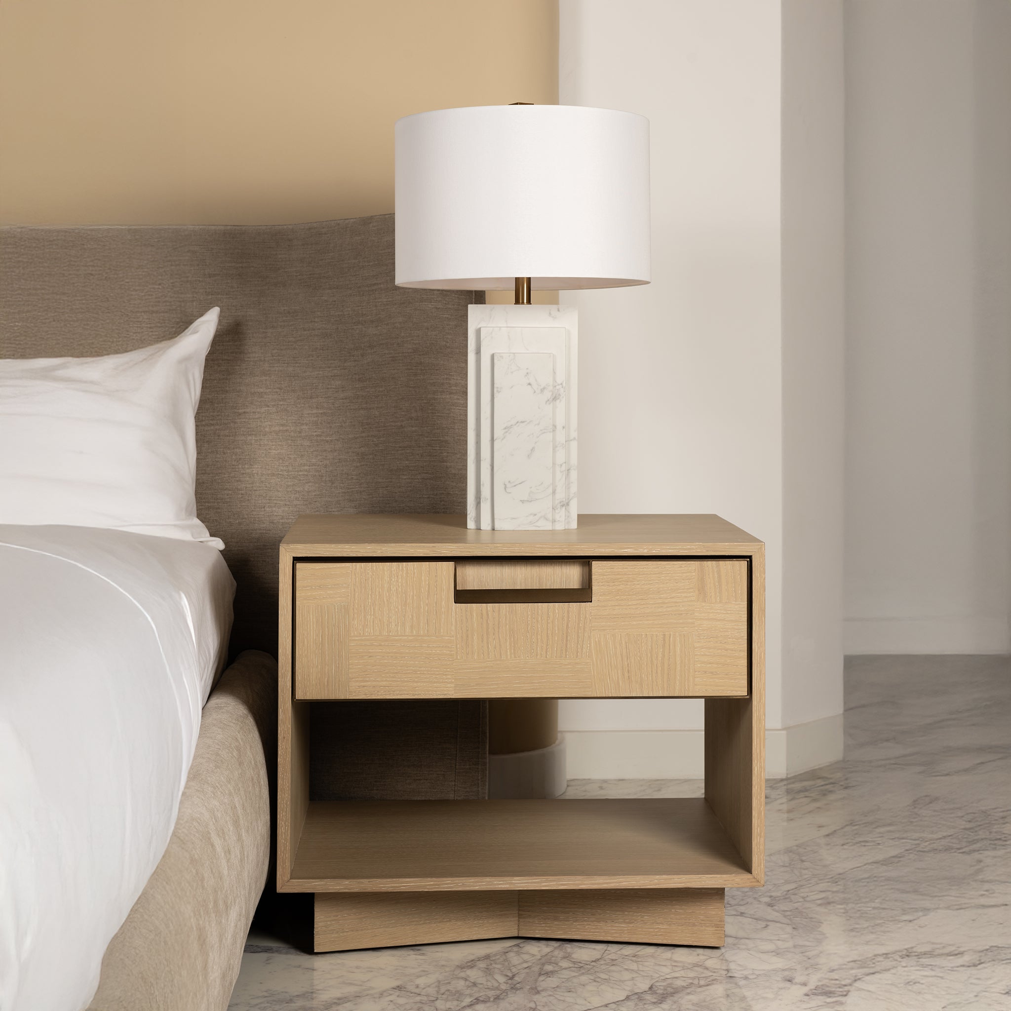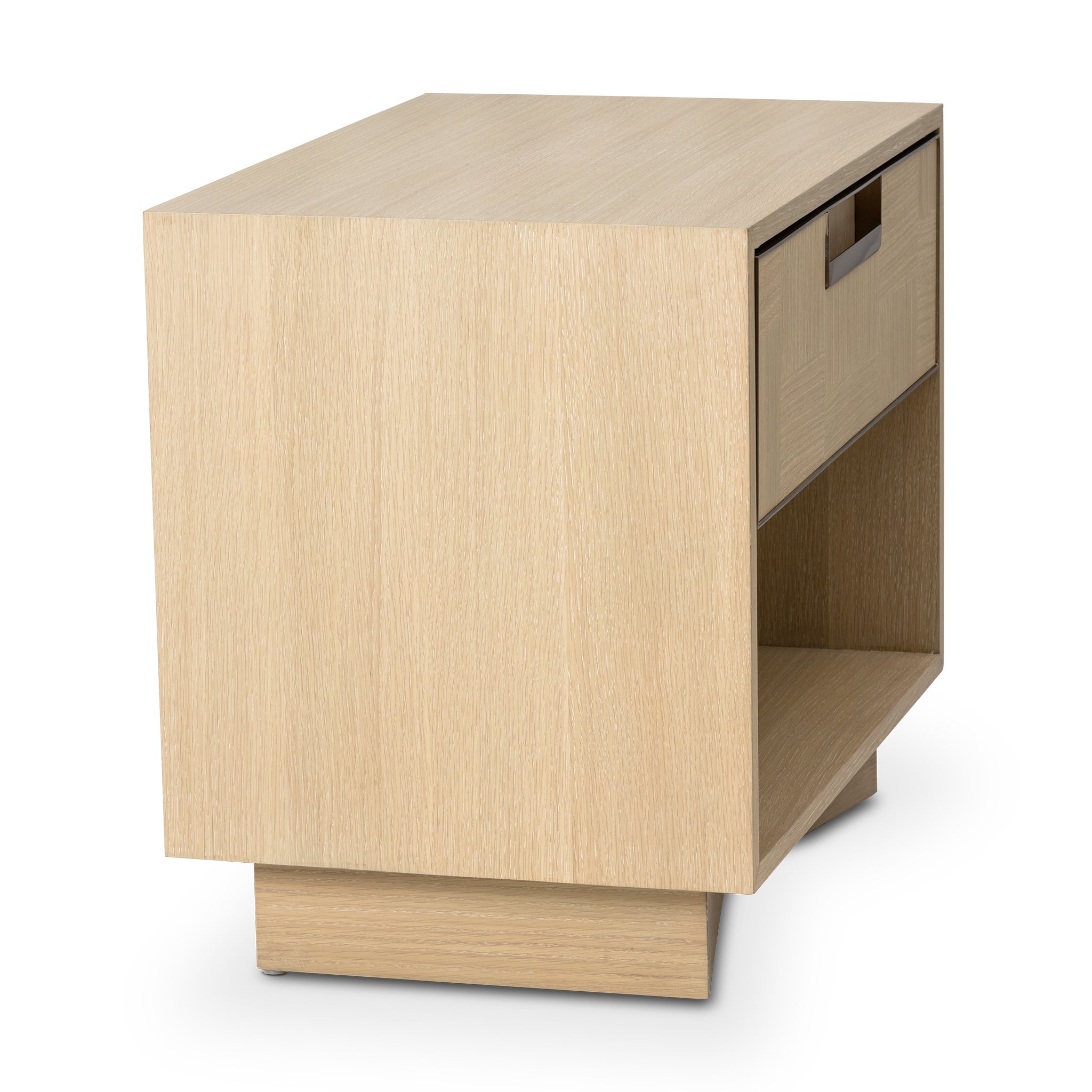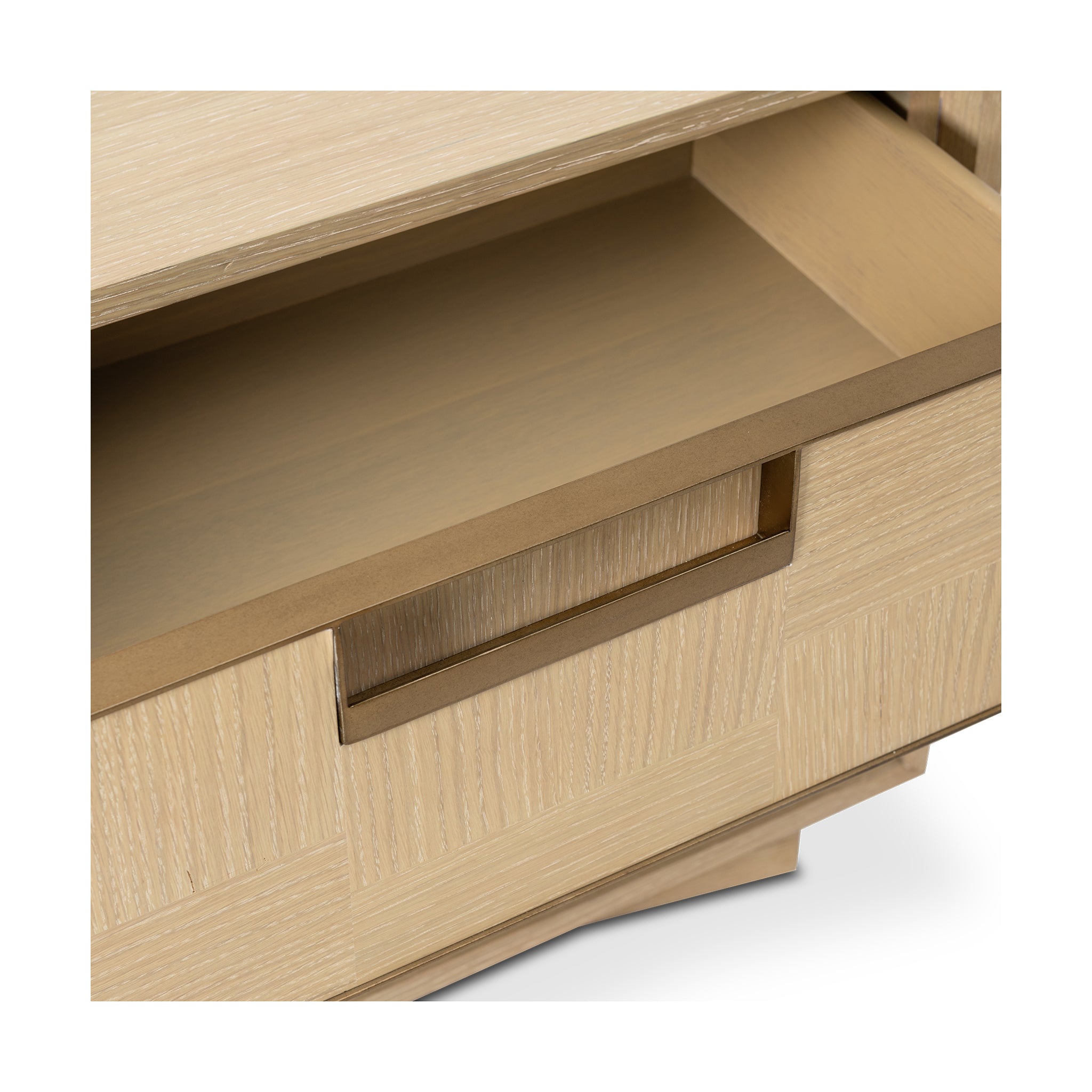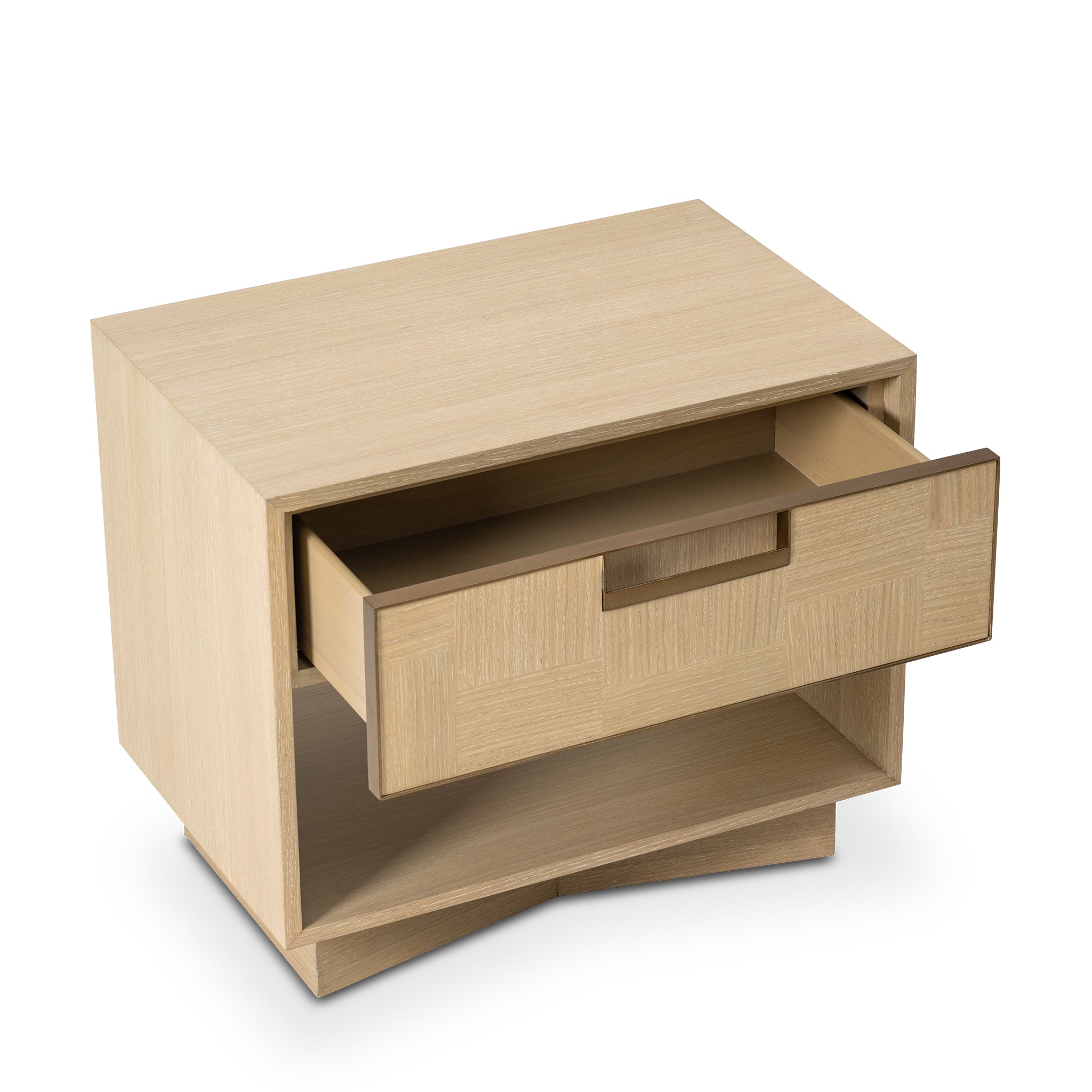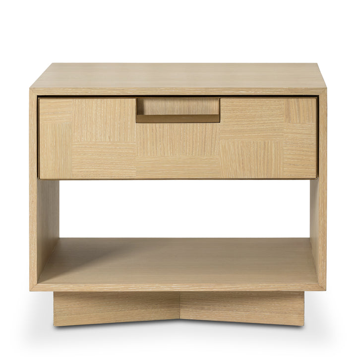 Sleek proportions and a beautifully patterned oak veneer give this nightstand an elevated presence. The front drawer, finished in alternating marquetry and accented with antique brass detailing, offers both function and sophistication. Designed to pair seamlessly with the same collection.