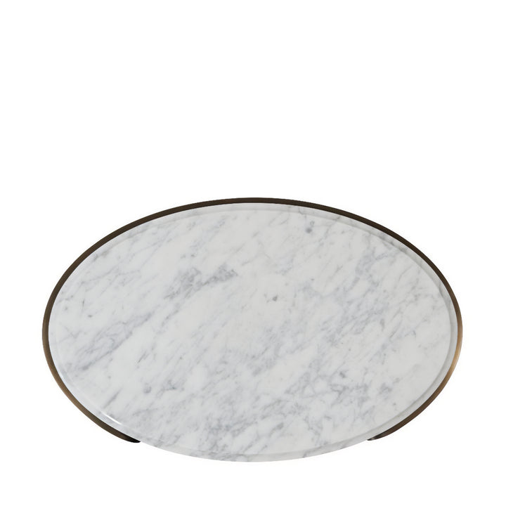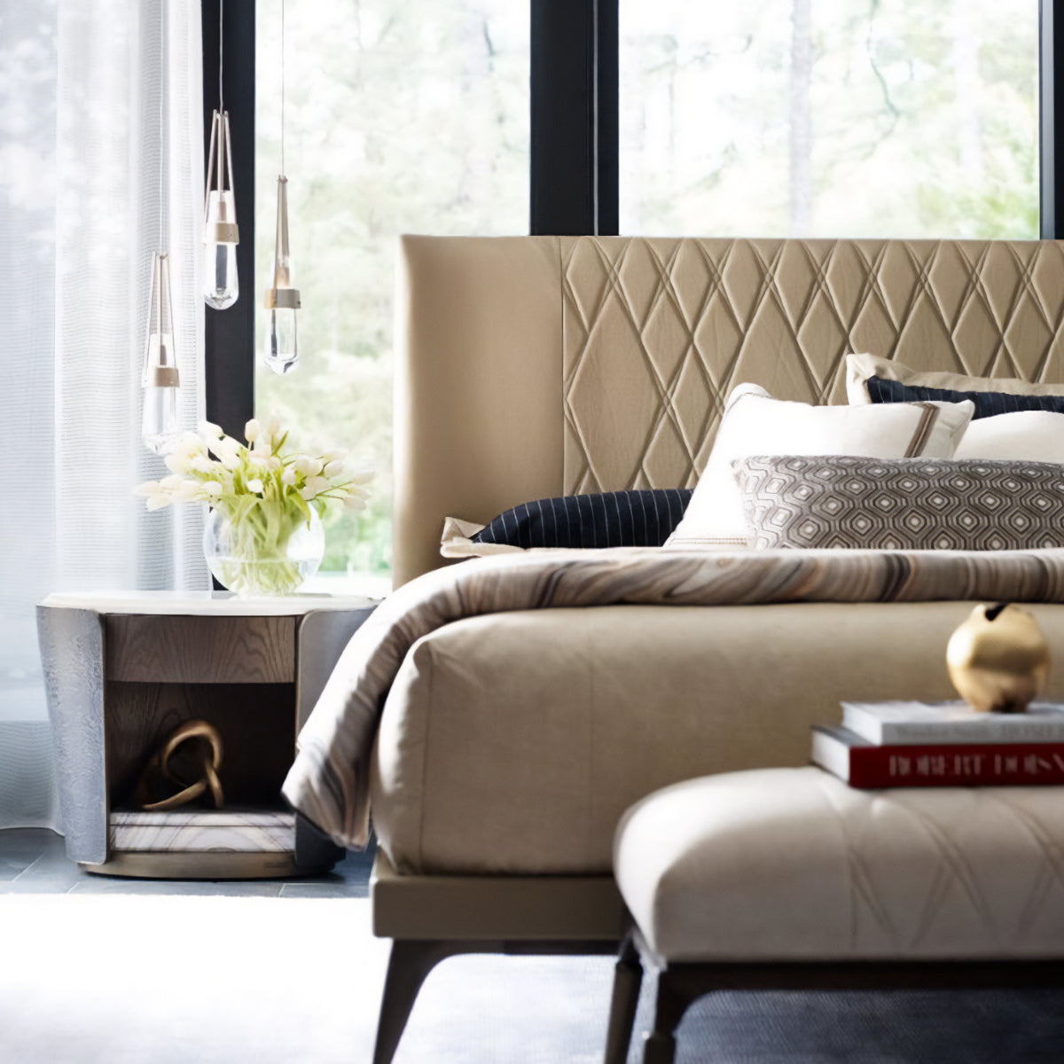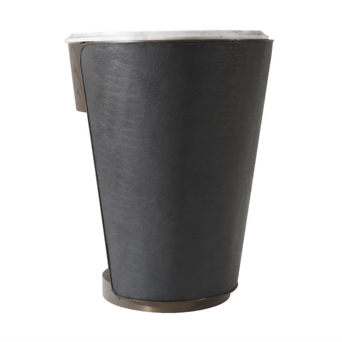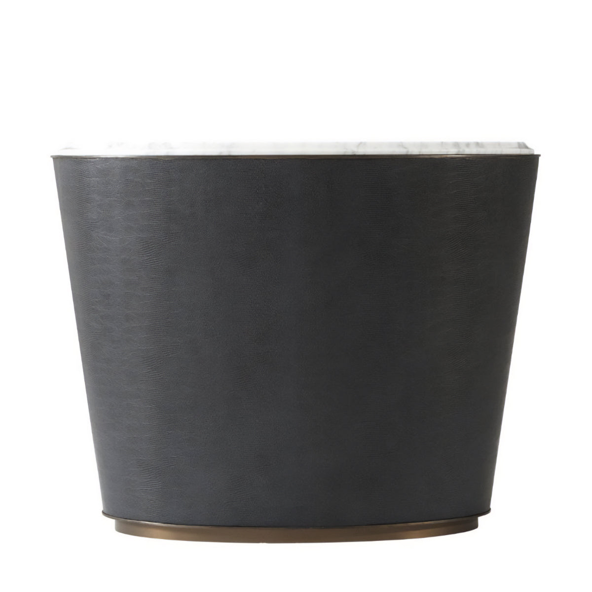Indulge in timeless elegance with the Amour Night Stand. Its Caddy Molded Figured White Marble top adds a luxurious touch, while the Oak frieze drawer and open interior, finished in Cigar Club, exude classic charm. The sophisticated Leather-wrapped & metal-bound collared case elevates the aesthetic, beautifully complemented by the Stainless Steel plinth base in Heritage Bronze finish.