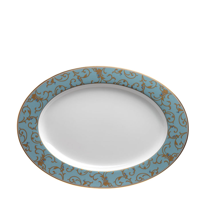 Add this oval platter to your dinner table and set the right mood for luxurious dining. With the arabesques and grapes embossed along the rim, the piece is truly a work of art. The use of a Golden tone on the Turquoise Blue surface is all the more impressive.