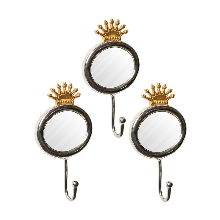 Glam up your interior space with this Anchor Mirror that comes in three pieces—it provides hooks for desired home decor to make it more aesthetically pleasing. The clear circular mirrors are surrounded by Stainless Steel in a Polished Nickel finish, giving it a classic feel. An Iron crown accent on top in Antique Brass finish adds to its allure and beauty. These mirrors are ideal for any setting because they are functional and elegant.