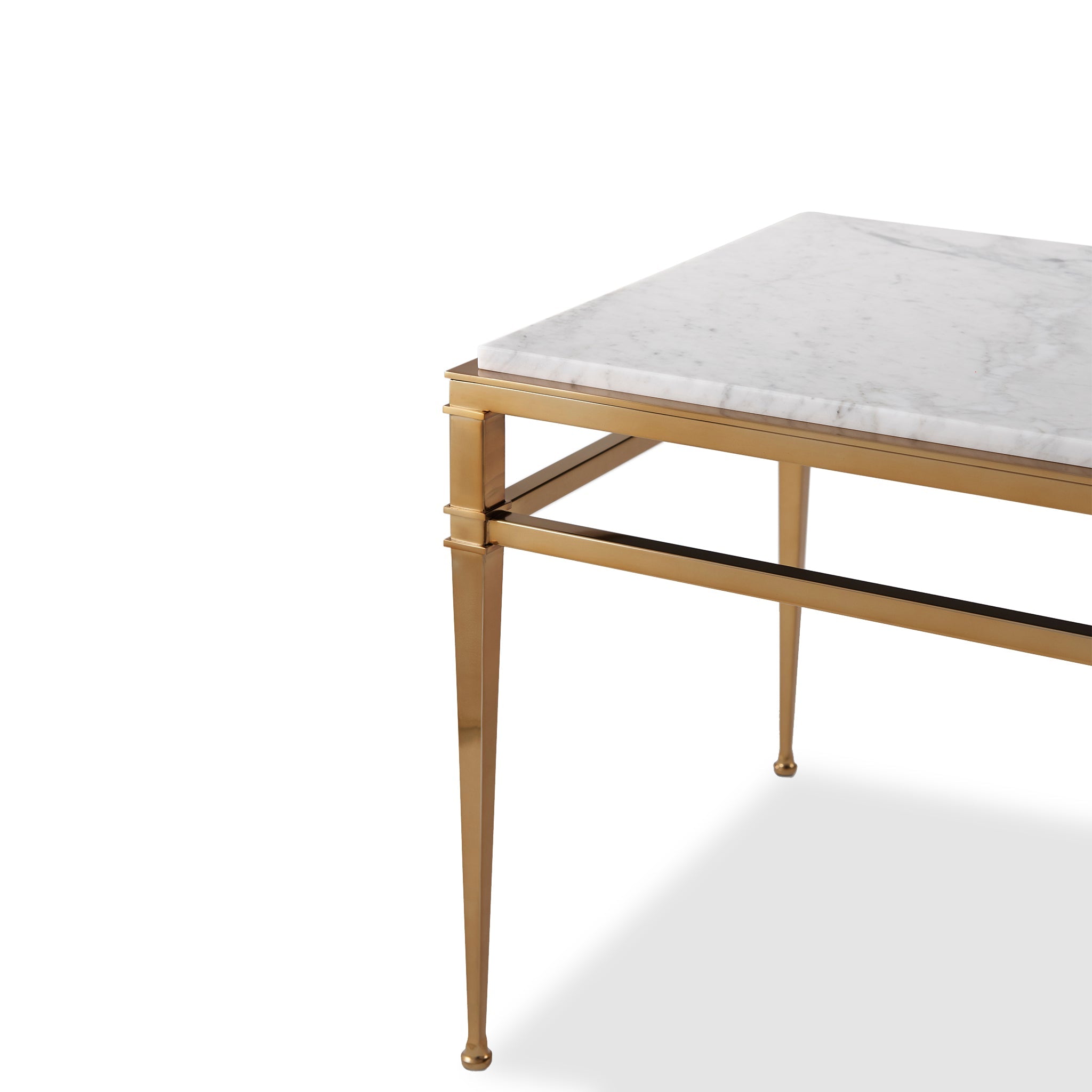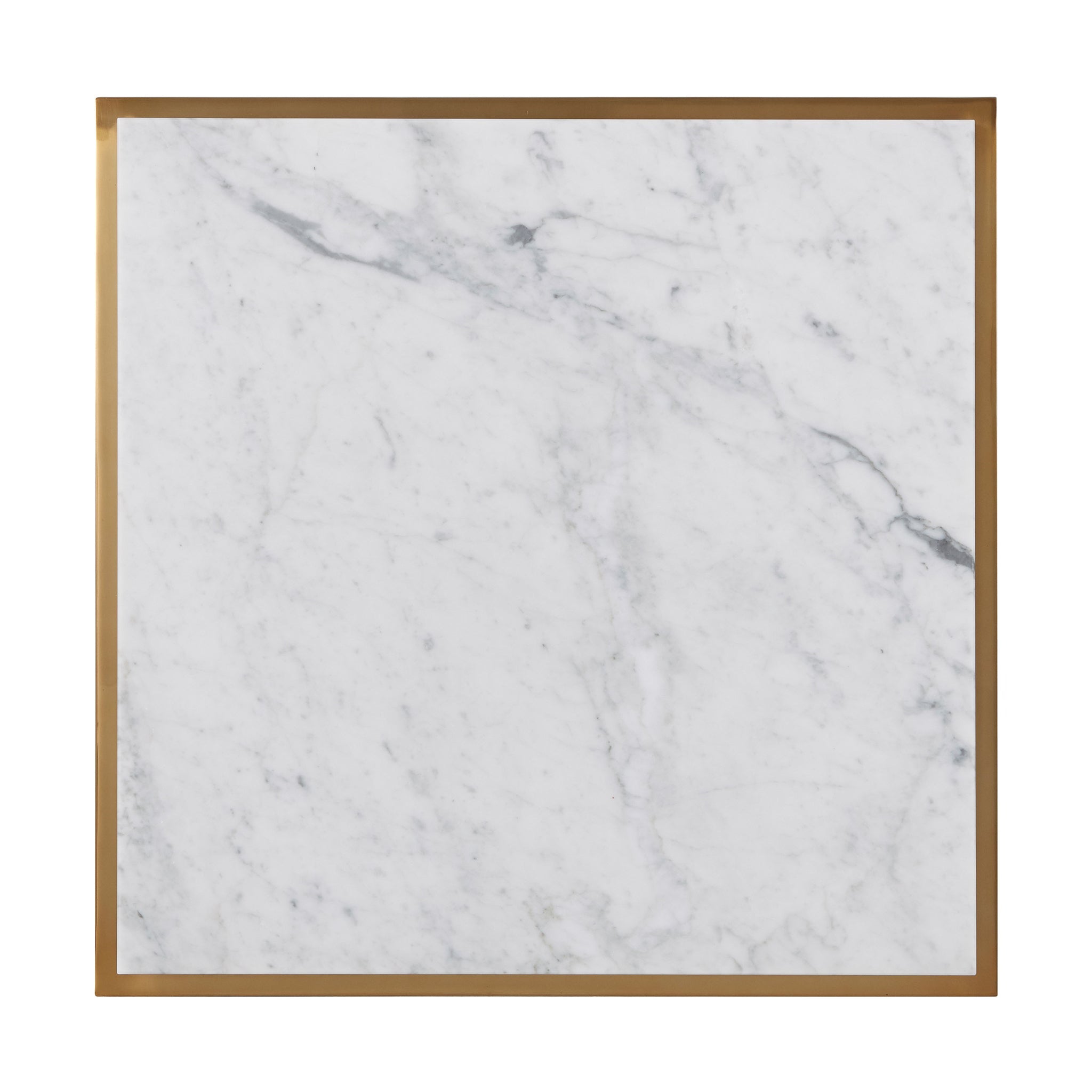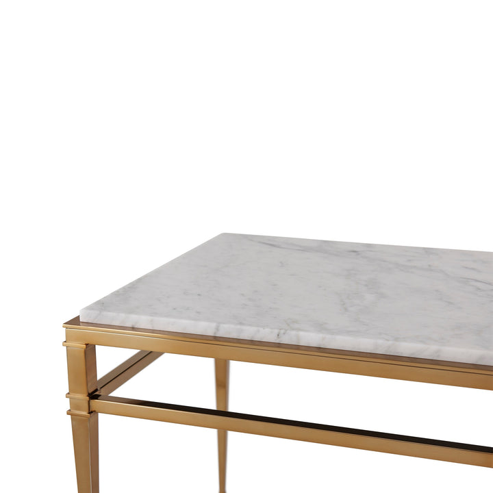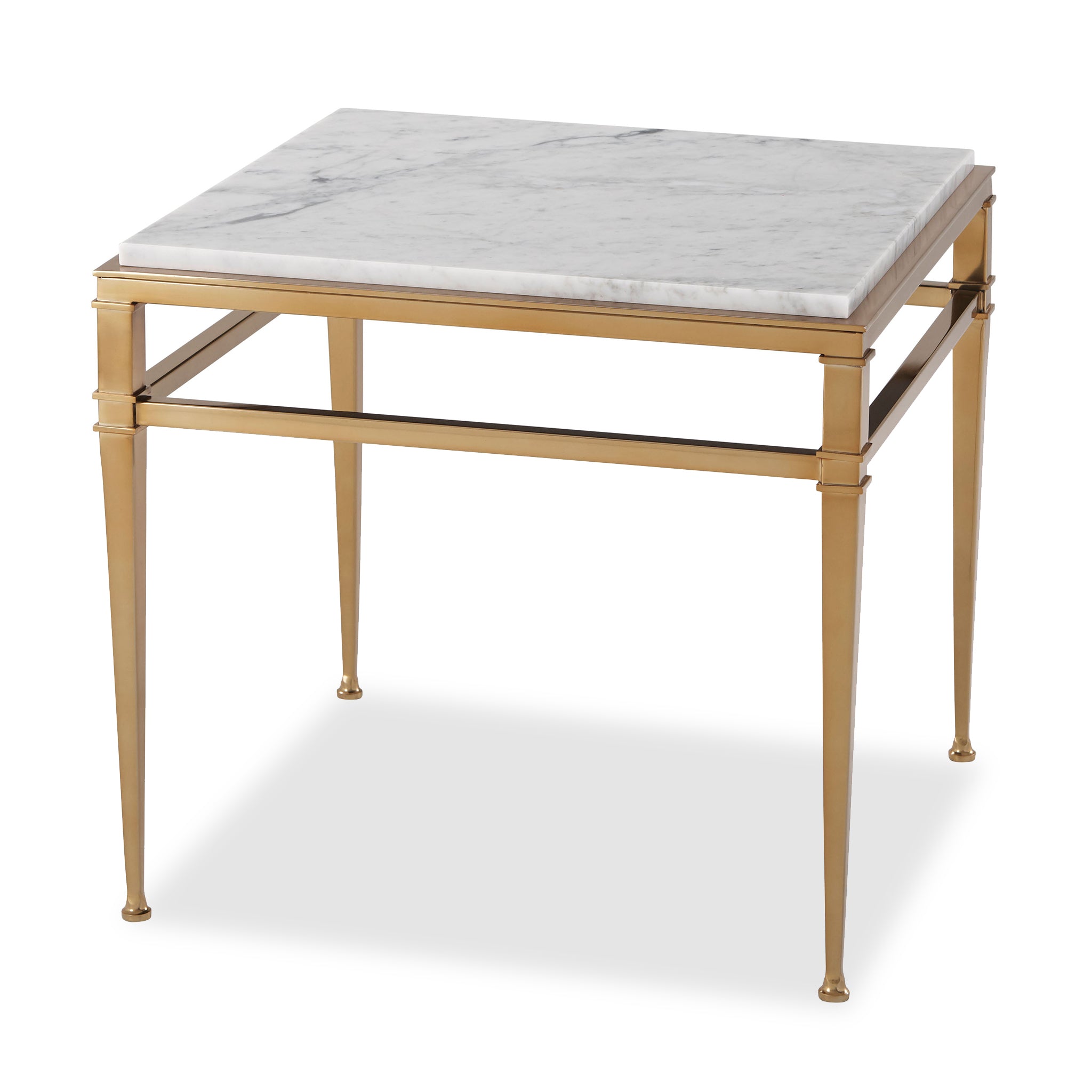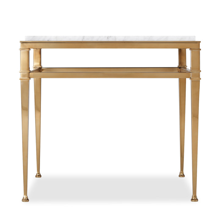 A Bianco Carrara Marble and brass side table, the Overlay Top above a Polished Brass Finish Stainless Steel Base of tapered Columns joined by Stretchers with molding details and Signet Feet.