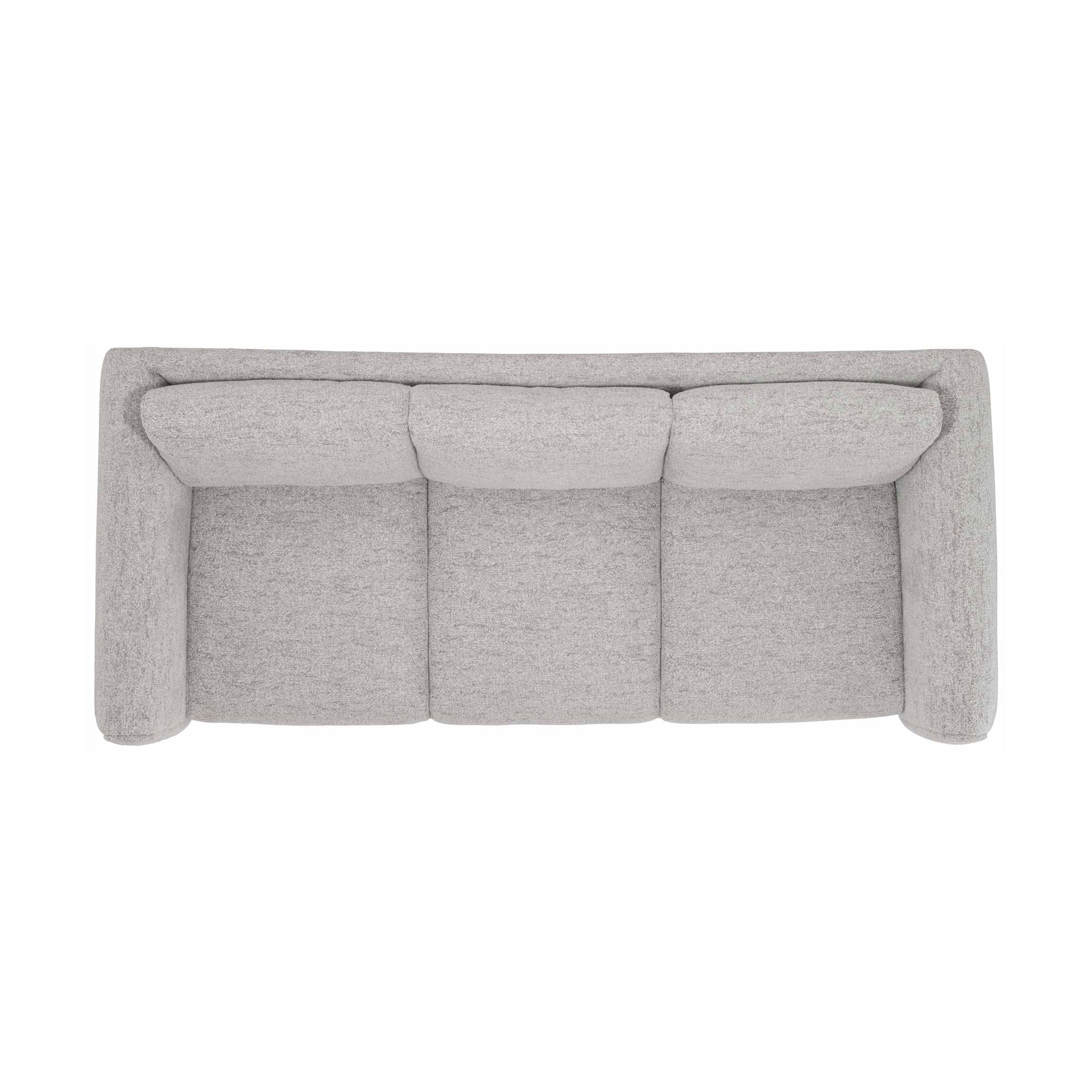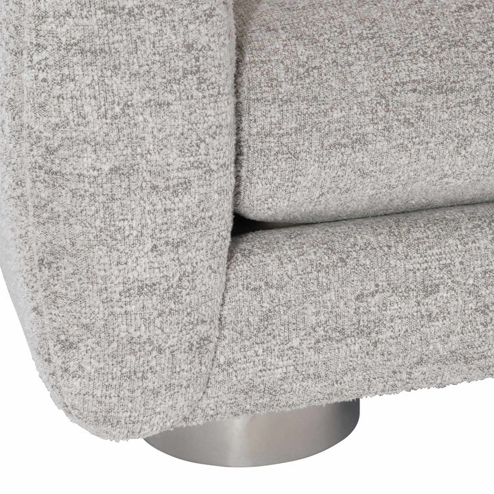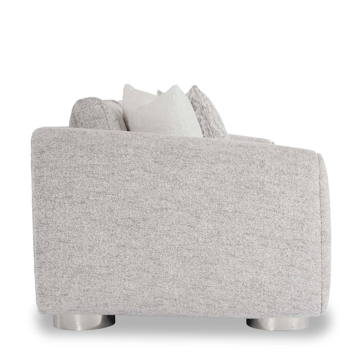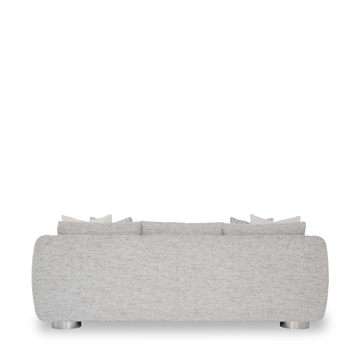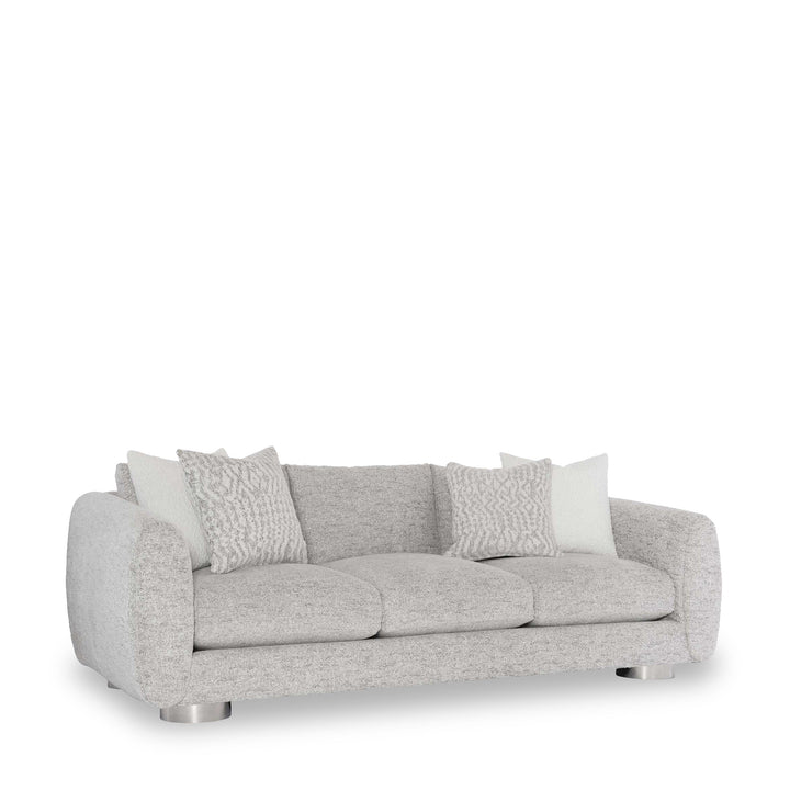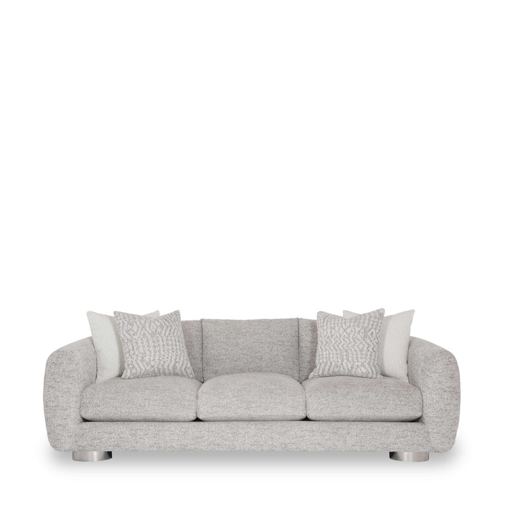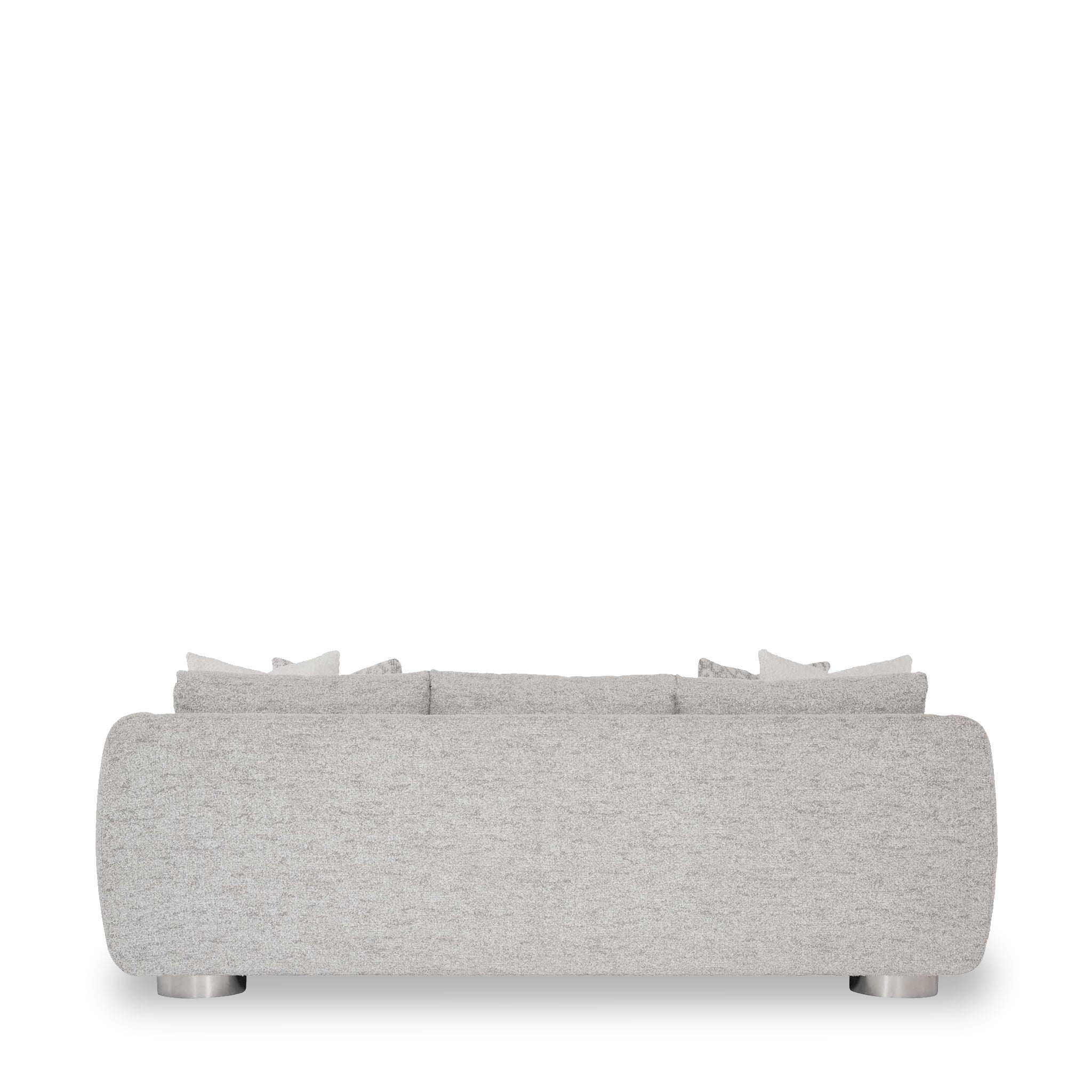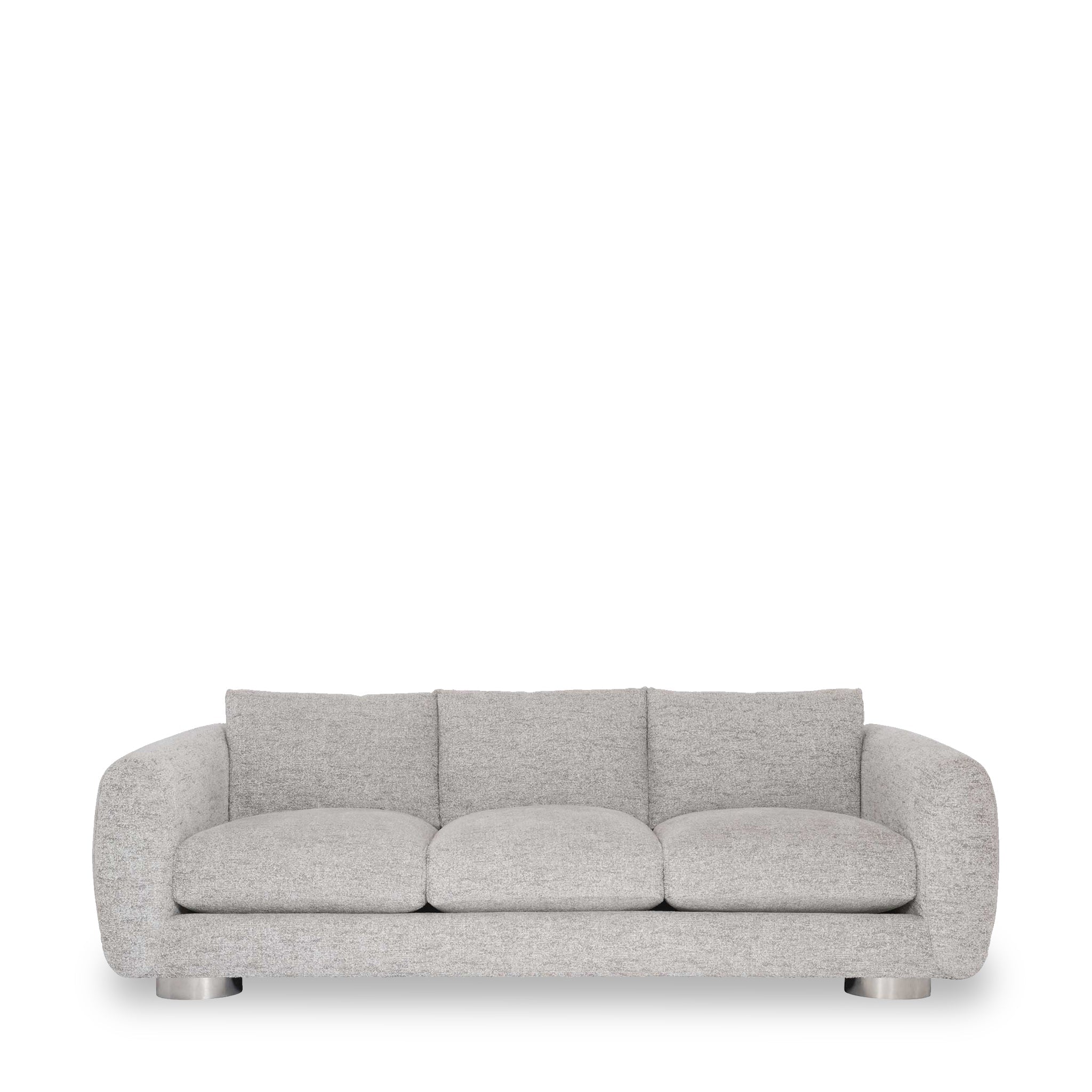 With wide polished stainless steel legs that offer a subtle sheen, the Ansel sofa elevates the aesthetic of a modern living space. It has three, fiber Blend ownback pillows for comfort, along with four feather down throw pillows for an deeply comfortable sit. Shaped arms are the perfect complement to the round feet and square frame.