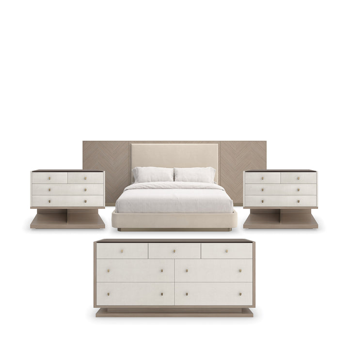 Transform your space into a palace of luxury with the Antholog King w/Wings Bedroom Set. Fit for royalty, the king bed features grand wing panels in Dry Martini, complemented by refined metal trim in Brushed Gold. The dresser and two nightstands, standing on plinth bases in Dry Martini, showcase drawers finished in Ivory Craze, adorned with exquisite metal hardware. Enhance your space with this ensemble of sophistication and style. Reign over your domain in comfort and sophistication.