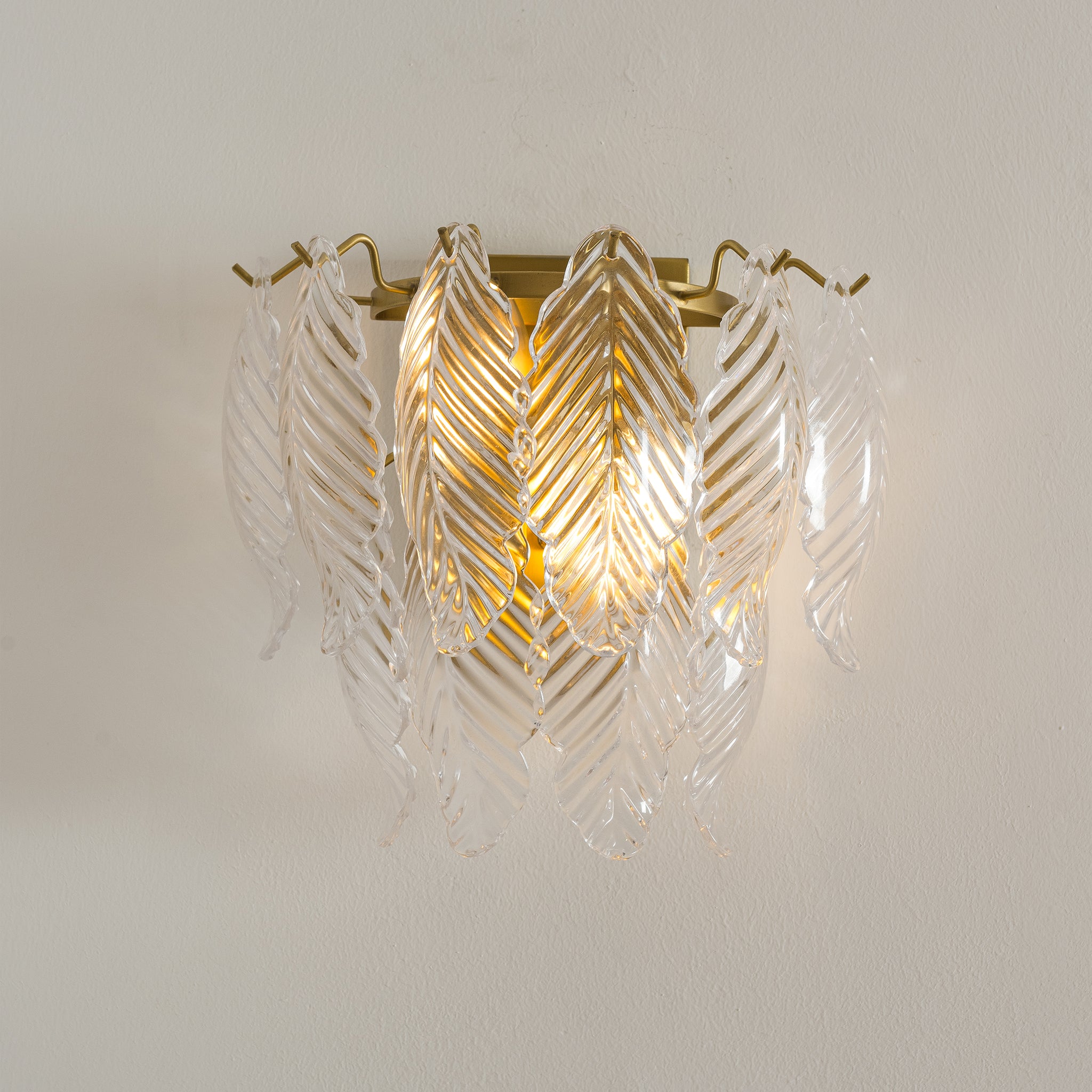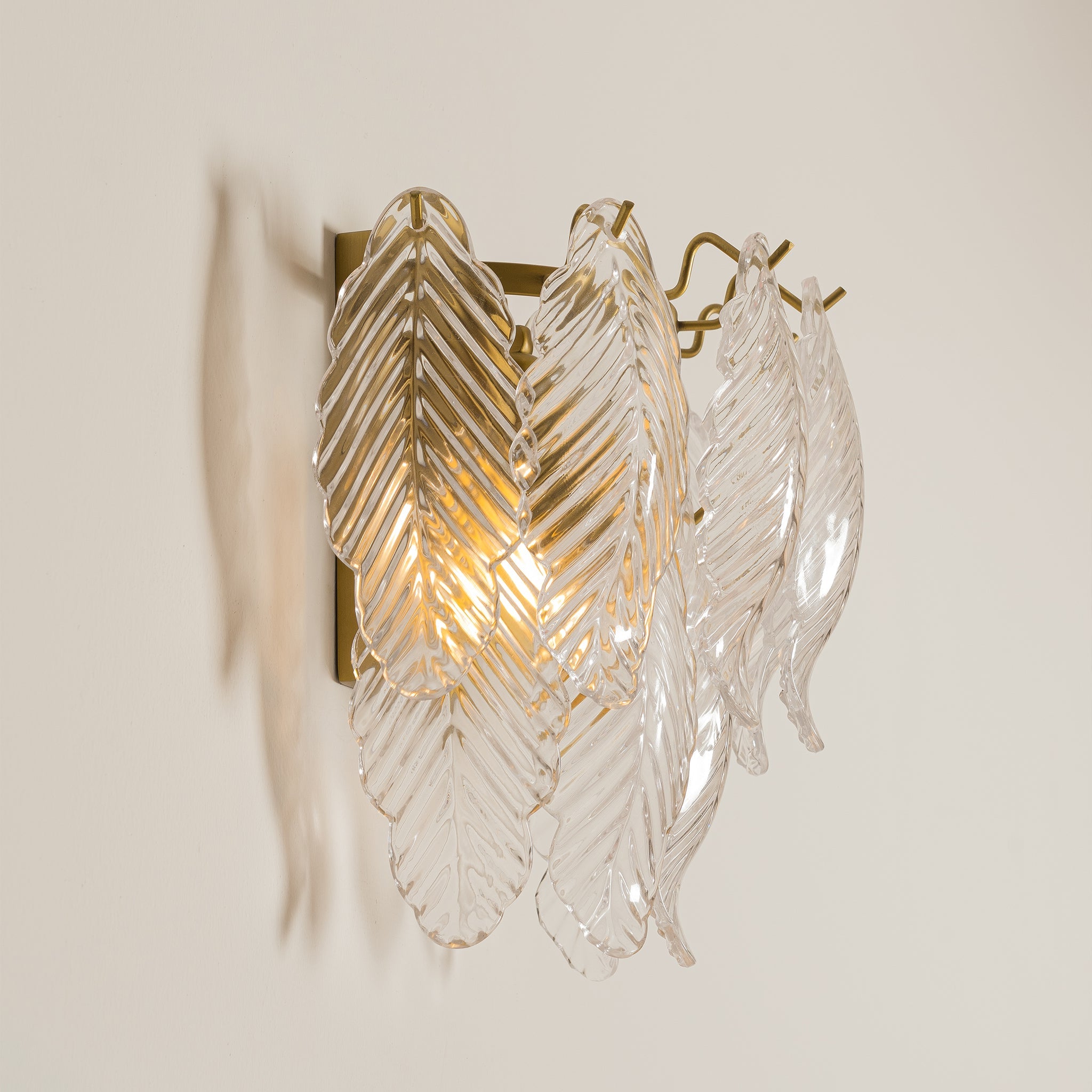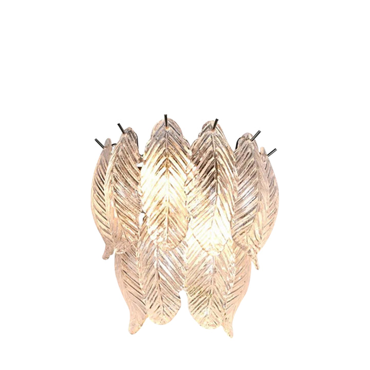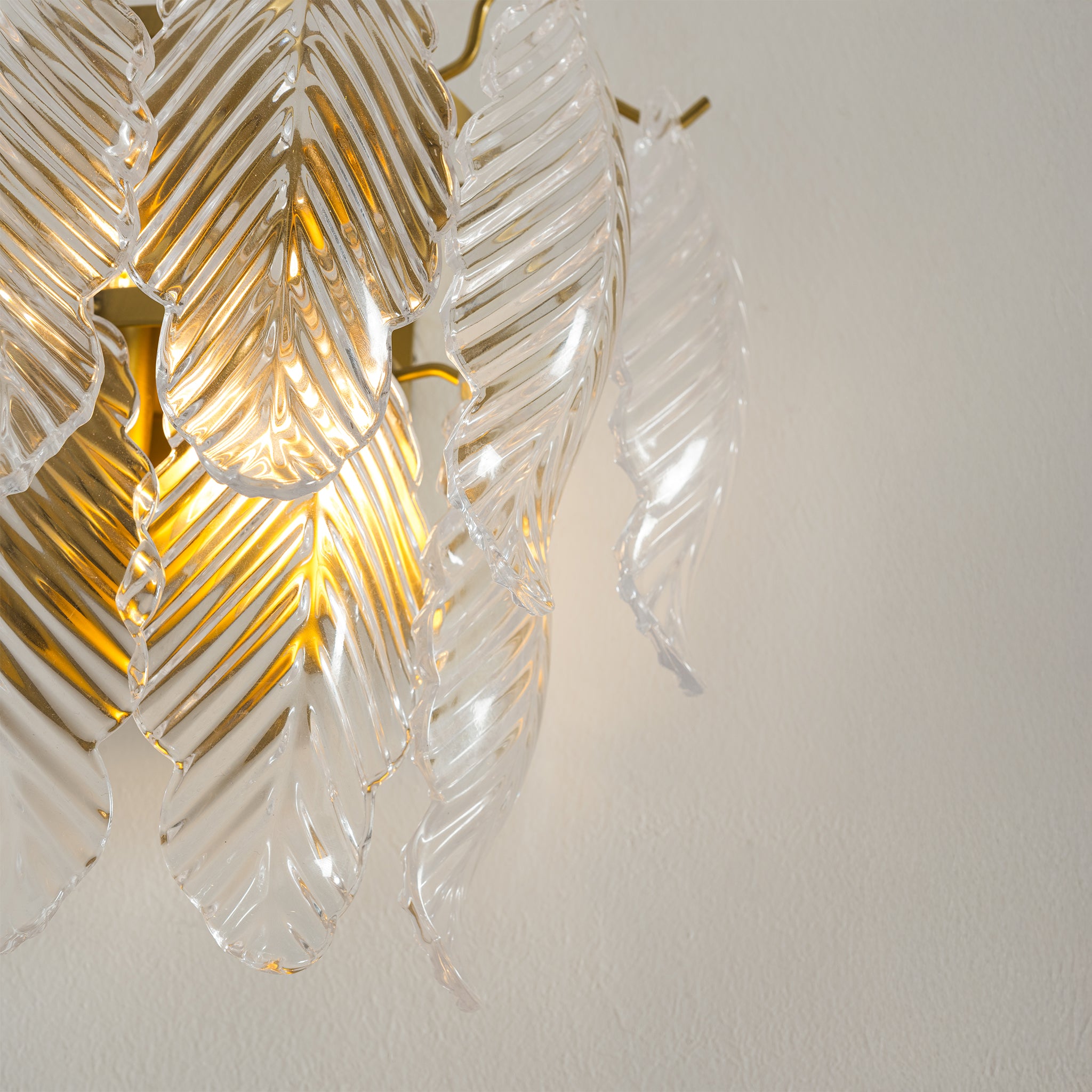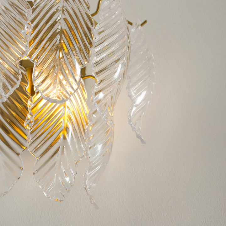 Inspired by the glamour of art deco design, this wall lamp features delicately sculpted glass leaves arranged in a layered composition. The luminous glow highlights the leaf-like pattern, creating depth and elegance on any wall.
