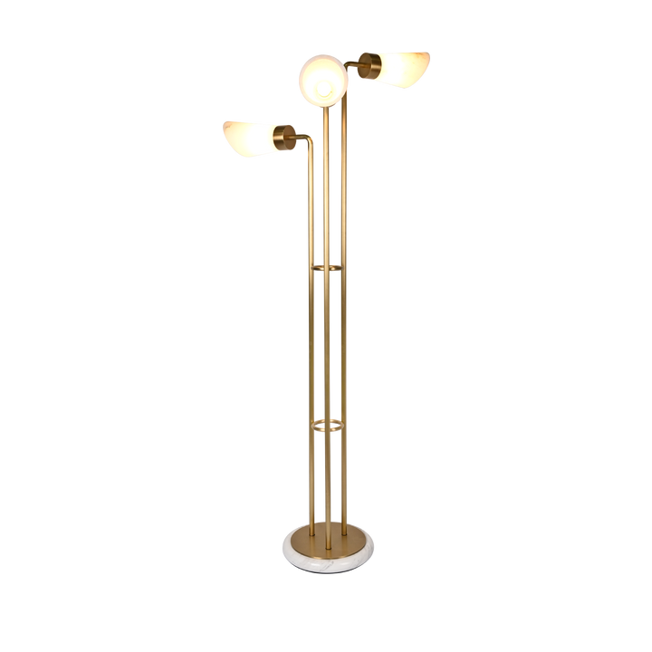 The curved natural alabaster defines this art deco–inspired floor lamp, revealing the stone’s soft translucence and depth. The vertical brass frame enhances its sculptural presence, creating a refined expression of timeless elegance.