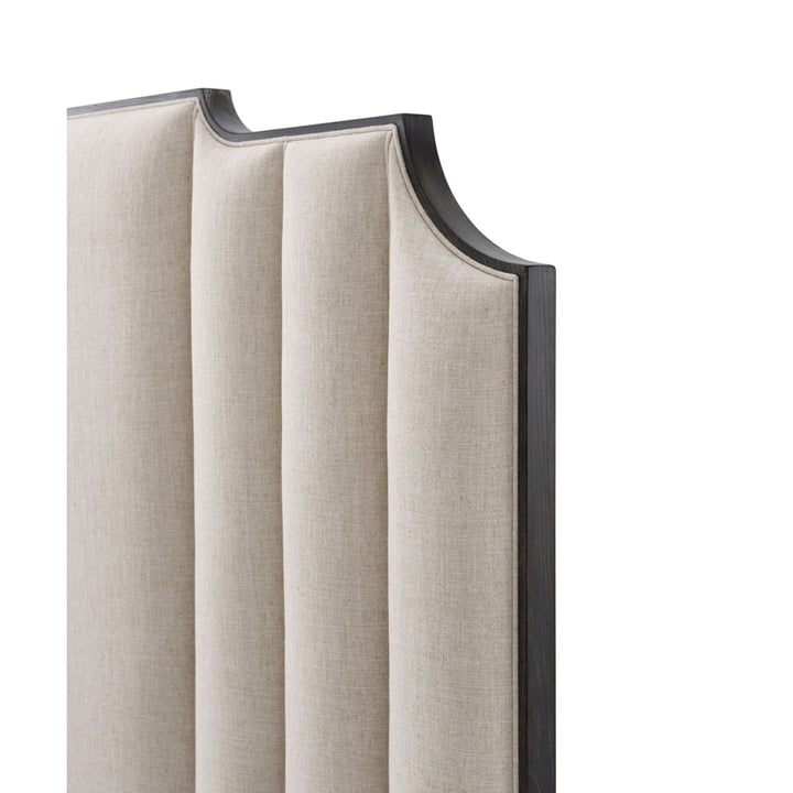 - Beige linen upholstery binds the headboard/footboard