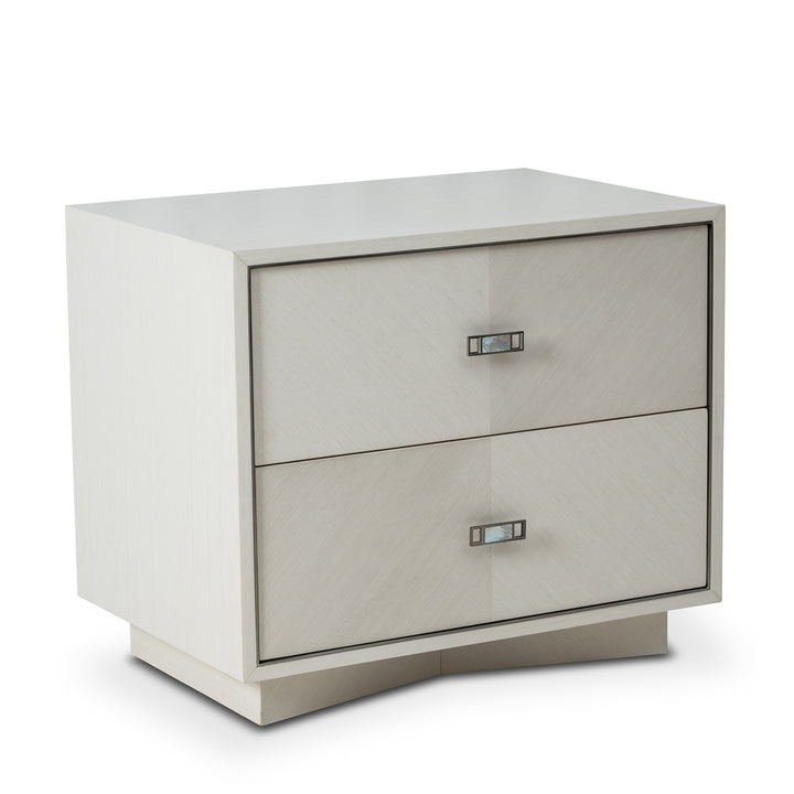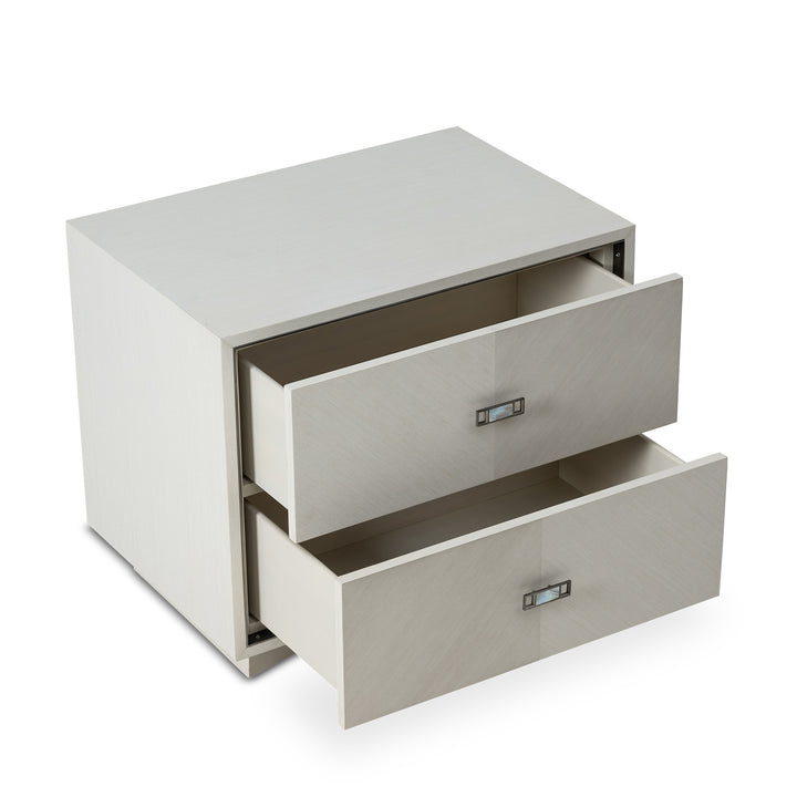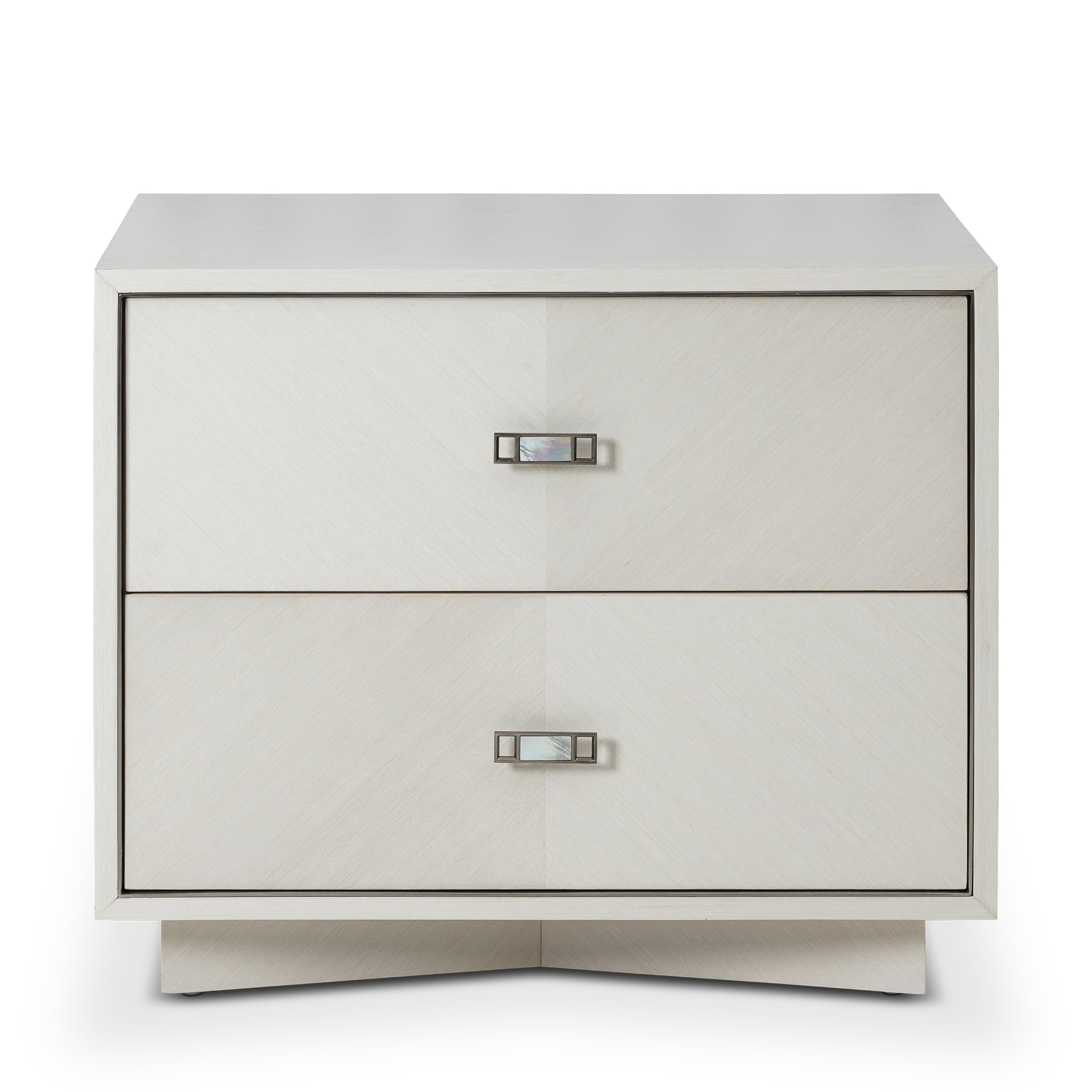 Chevron marquetry in a pearl oak finish lends this nightstand a refined, modern look. Brushed pewter trim and mother-of-pearl inlaid knobs bring a touch of luxury. With two drawers for bedside essentials, it pairs elegance with everyday function.