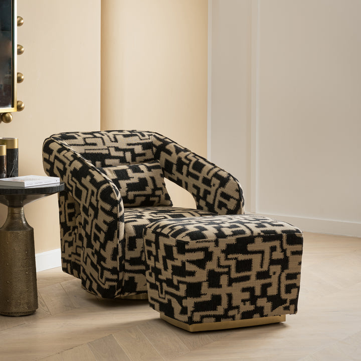 Radiating sophisticated simplicity, this ottoman captivates with its clean lines and minimalist allure, effortlessly complementing any modern interior. Its box-shaped silhouette, swathed in Maze fabric, epitomizes aesthetic appeal. Resting atop a plinth metal base finished in Brushed Champagne, it not only ensures sturdy support but also infuses a subtle touch of glamour into your home.