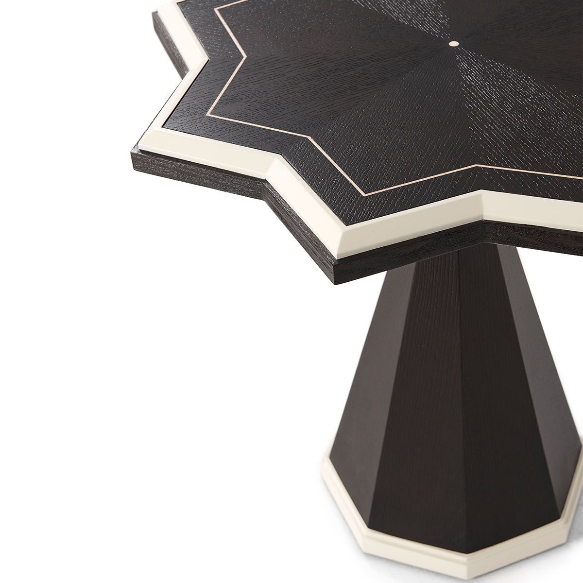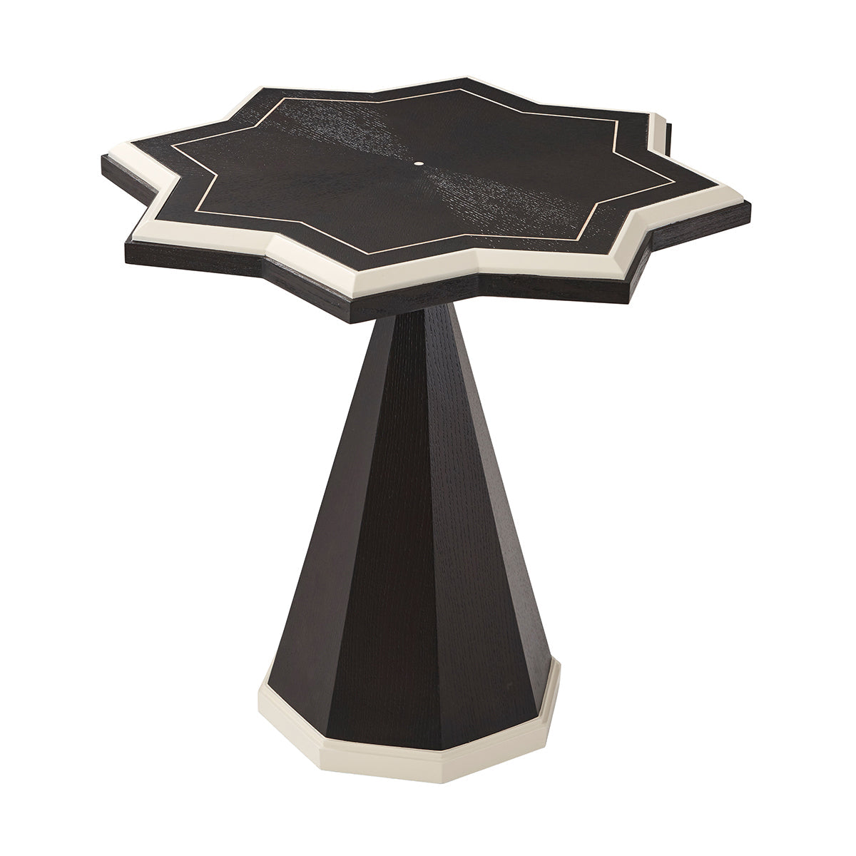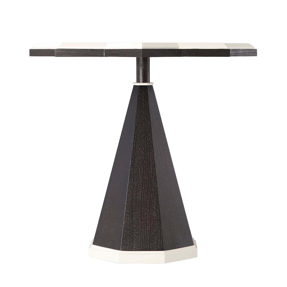 The eye-catching side table is a shining star choice for your living area. The sturdy textured Ebonized Oak veneered table is a highlight of artisan craft. White hued contrasting Ivory lacquering canted edges and line detailed base edges are significant. Abstract deco octagonal column tapered base pattern offers outstanding visuals.