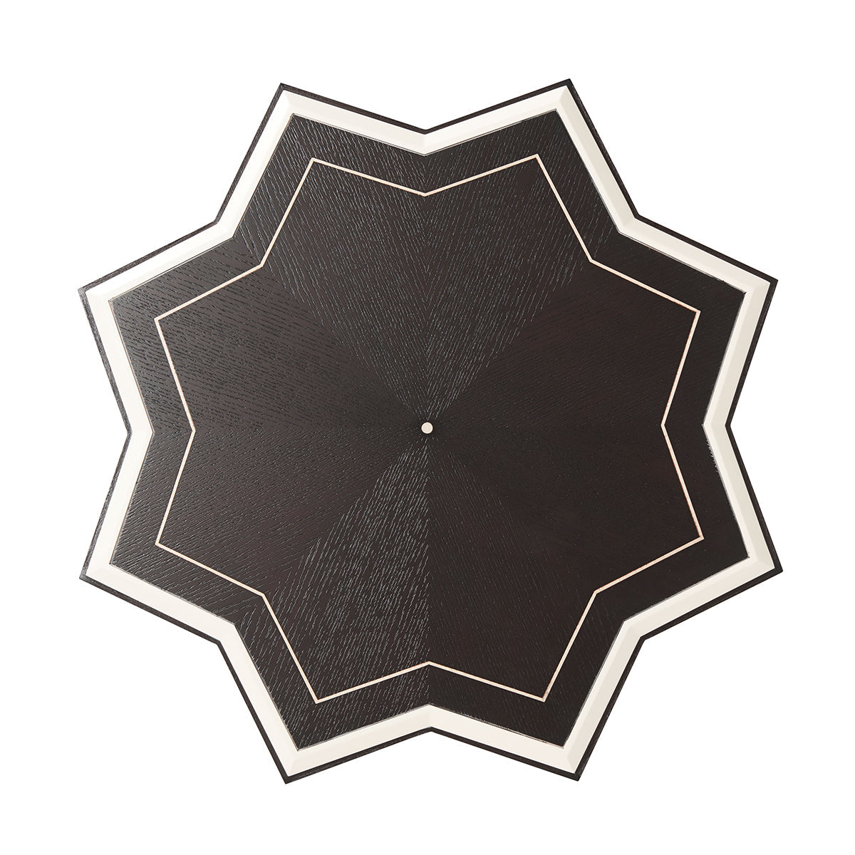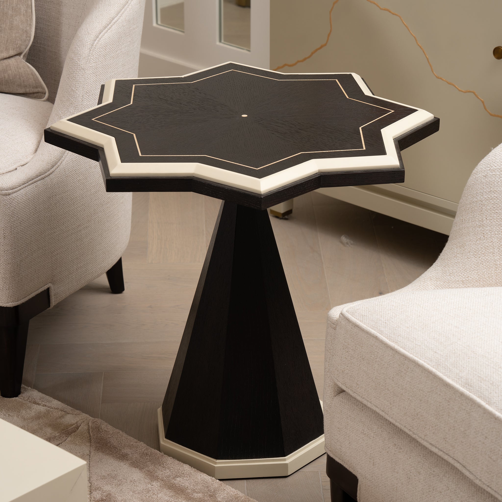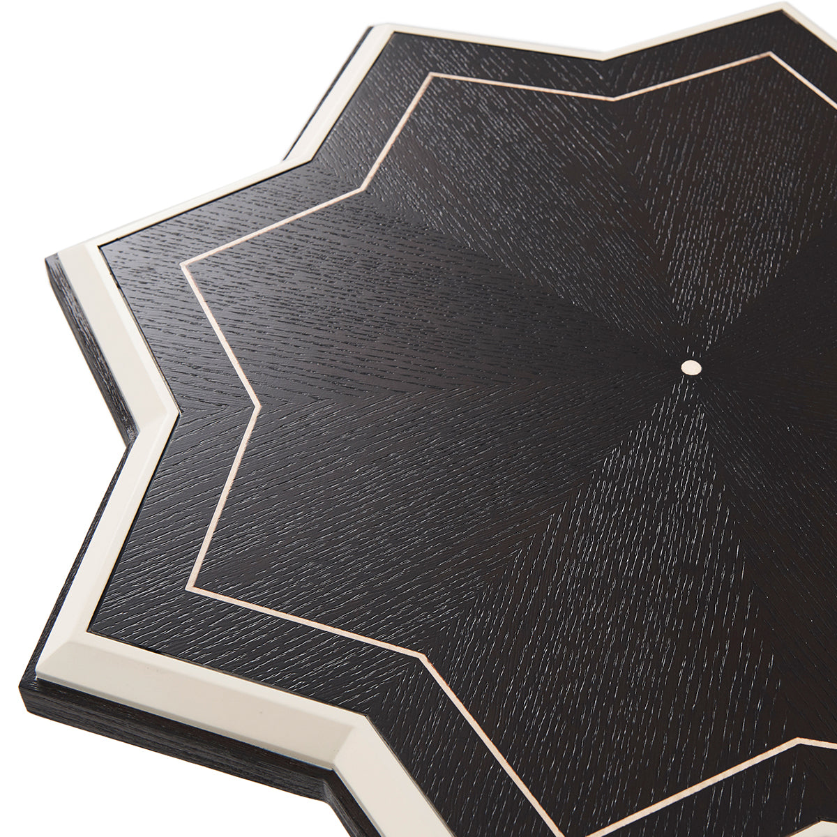 The eye-catching side table is a shining star choice for your living area. The sturdy textured Ebonized Oak veneered table is a highlight of artisan craft. White hued contrasting Ivory lacquering canted edges and line detailed base edges are significant. Abstract deco octagonal column tapered base pattern offers outstanding visuals.