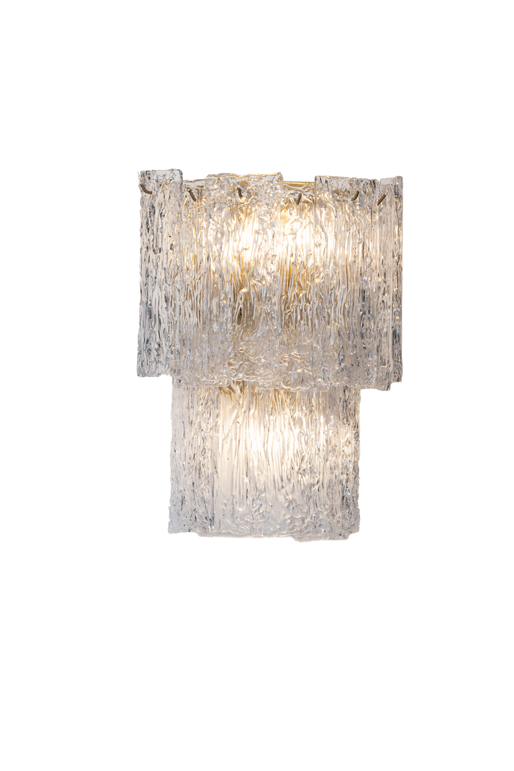 Part of the ava Collection, this wall lamp embodies art deco–inspired grandeur with its tiered form and intricate glass detailing. Crafted from clear textured glass with an antique brass finish, it exudes timeless elegance.