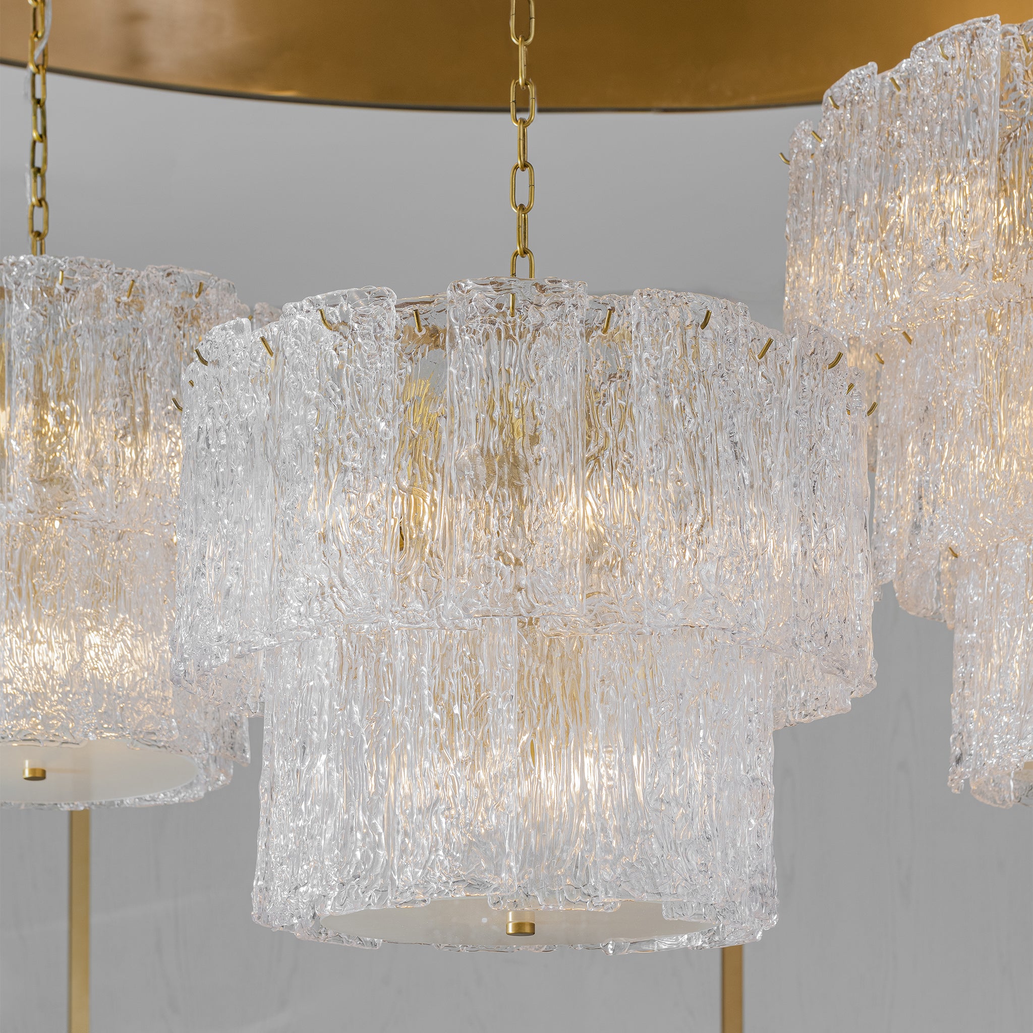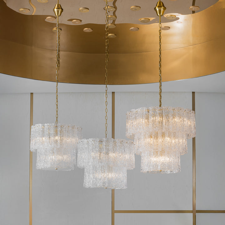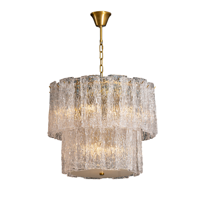 Art deco-inspired grandeur defines this chandelier with its tiered form and intricate glass detailing. Crafted from clear textured glass and antique brass finish. Pair it with the ava collection for a cohesive look.