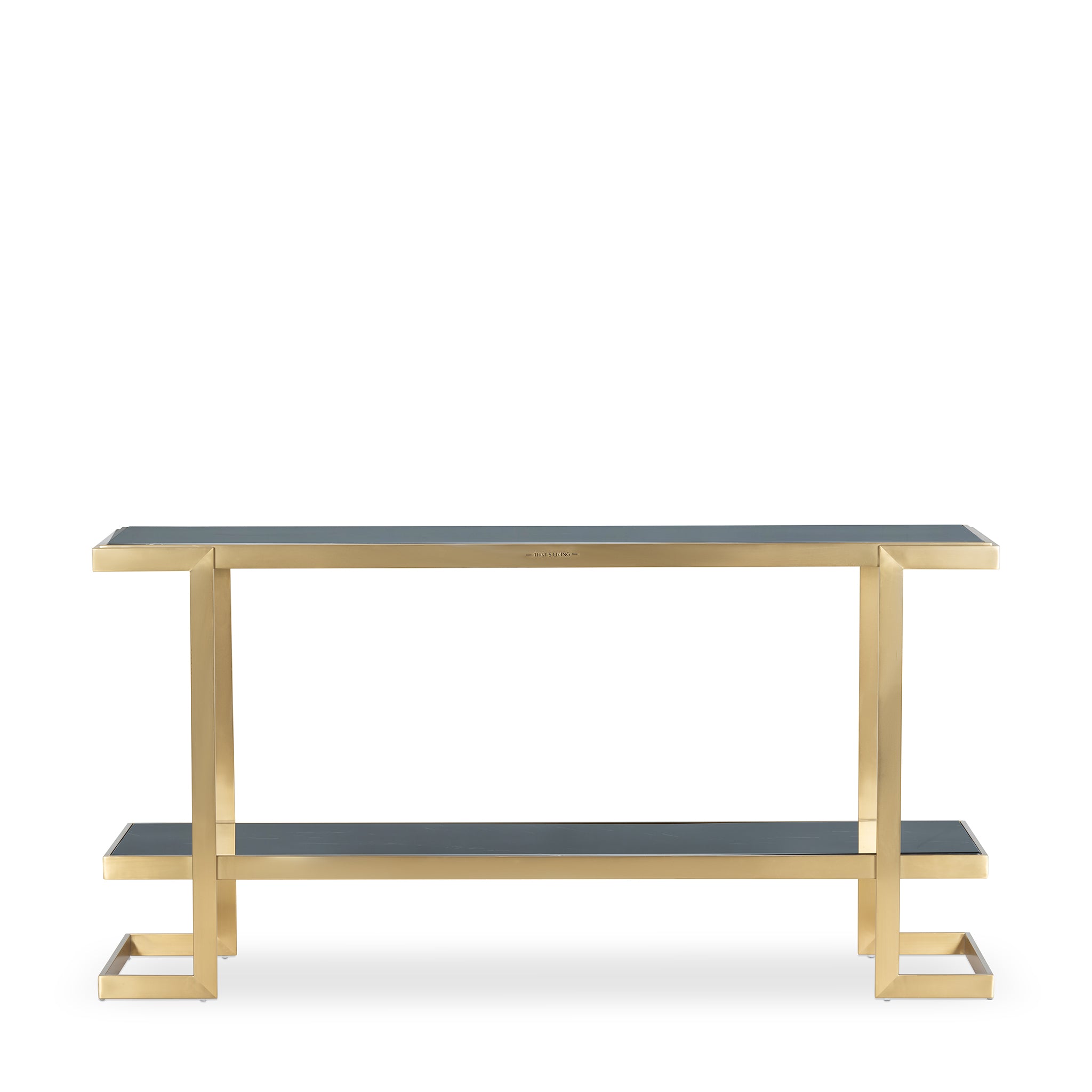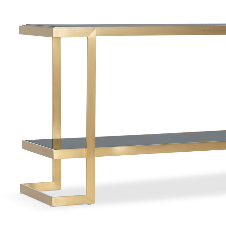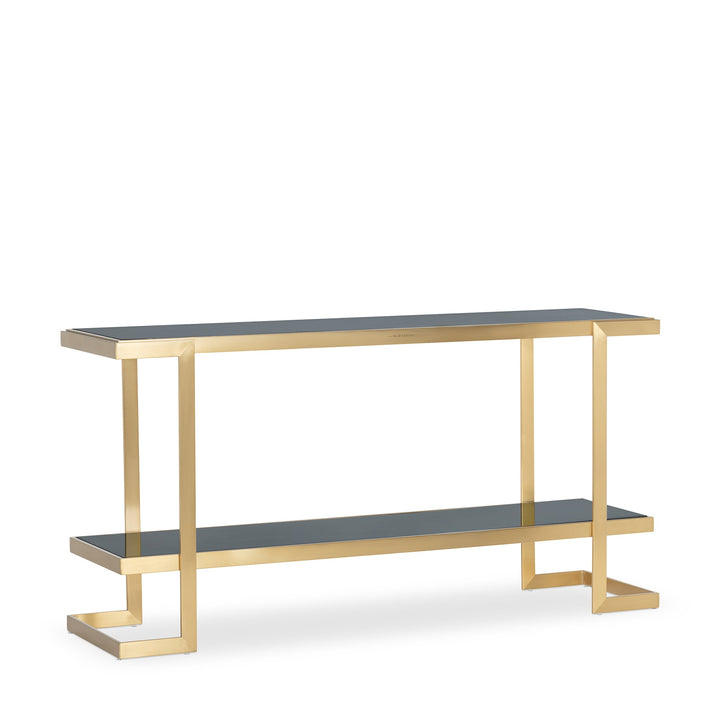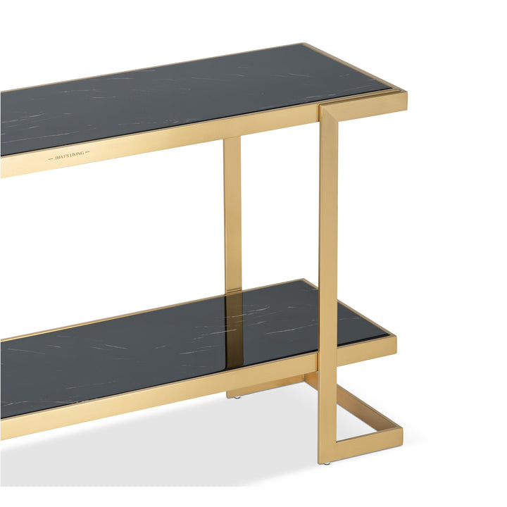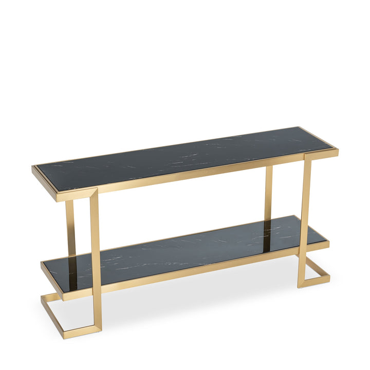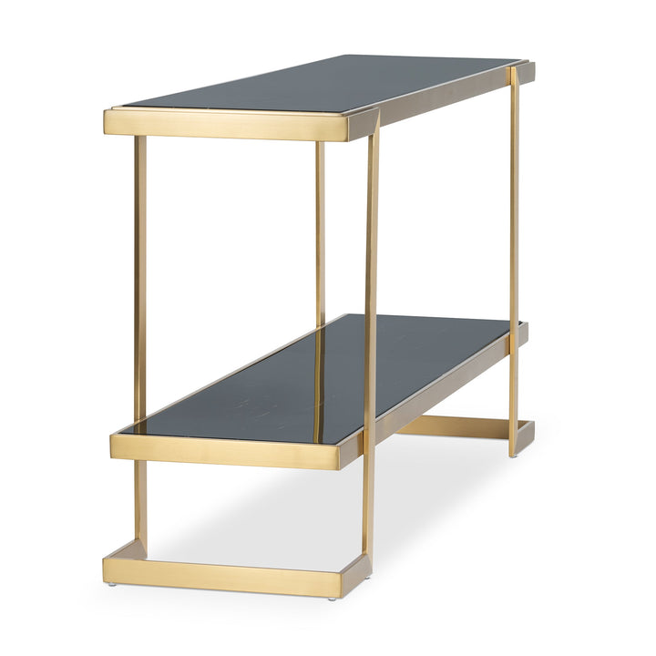Showcasing your prized collections on the Barclay II Console will leave your guests amazed. Braced in a Stainless Steel base in a Brushed Brass finish, it lends an appealing and classy aesthetic. It is crowned with a Dark Marble on top and a Black one on the lower shelf for an overall seamless look. This piece adds a contemporary flair to your home decor.