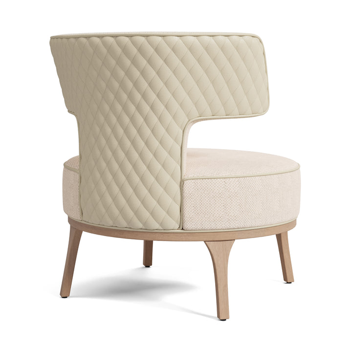 Upholstered in luminous moonbeam fabric, this chair showcases a sculptural curved form that embodies modern sophistication. The diamond-quilted greige leatherette on the outer back adds refined contrast and visual depth. Supported by solid oak wood legs in a miami finish.