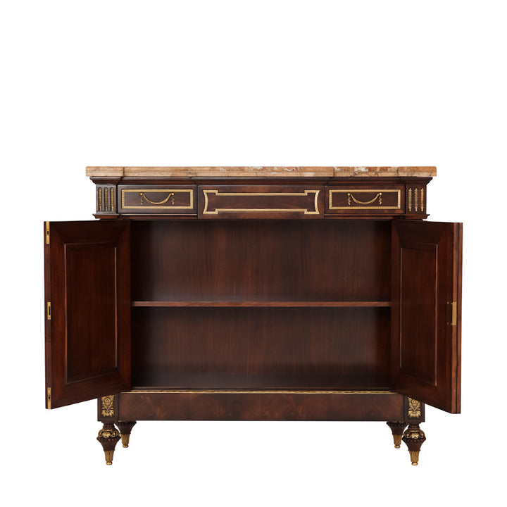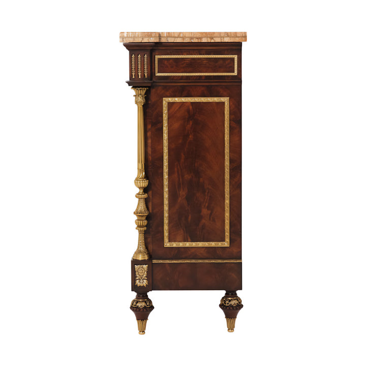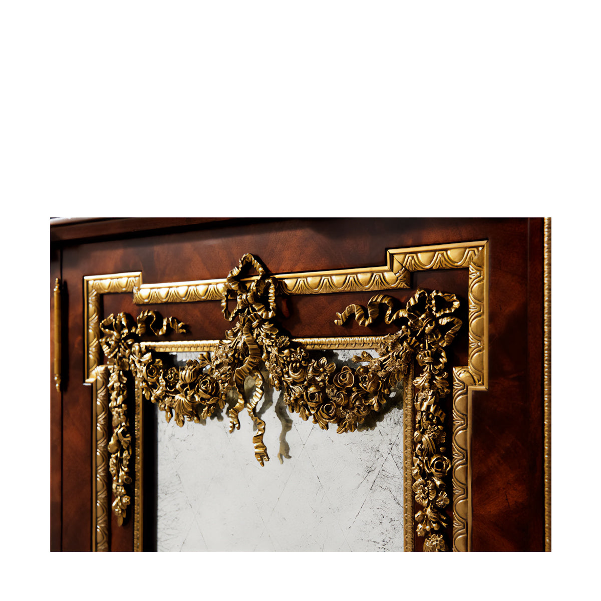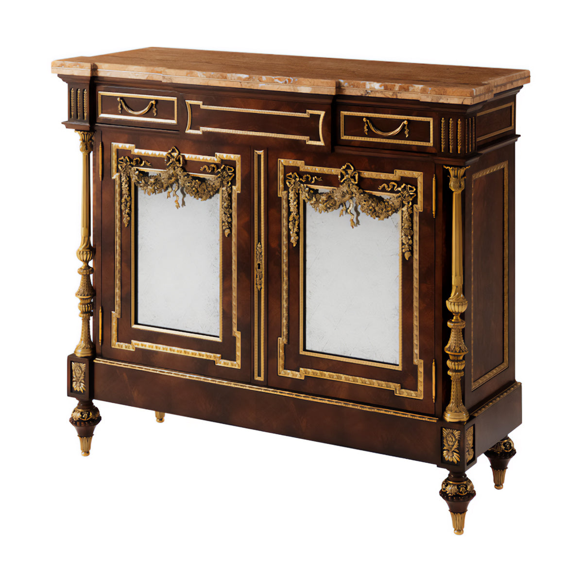 Showcasing the Bold as Brass Decorative Chest, is an eye-catching piece that screams grandeur and luxury. This side cabinet is made of luxurious Flame Veneer and Mahogany, and it has beautiful Brass mounts. The ornate Brass molding on its breakfront Sahara Marble top sets the tone for three frieze drawers and antiqued mirror panel doors adorned with striking Brass floral swags. This sculpture is a tasteful fusion of traditional elegance and cutting-edge modernism, surrounded by cast columns and supported by graceful peg feet.
