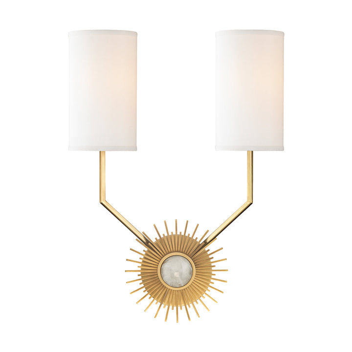 This luminaire features two sconces attached to a single central piece in a sunburst design. A Rock Crystal bejeweled on this artistic creation further elevates the visual aspect. The Aged Brass finish is beautifully complemented by the Silk Shade in Off-White color, diffusing ambient light into your lavish room.