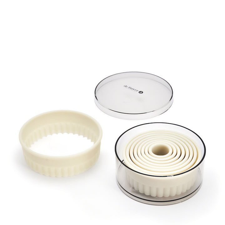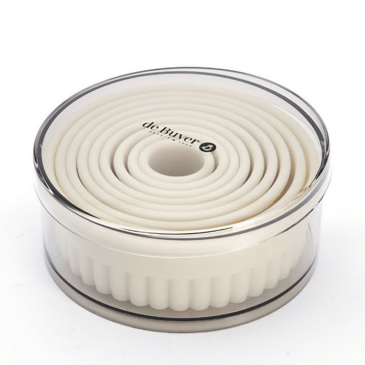 Revolutionize your baking with our Box of 9 Fluted Round Cutters, expertly crafted from durable Composite Polymer. The fluted round form adds a touch of elegance to your creations, while the thick top rim ensures easy handling and safer cutting, preventing injuries. Ideal for shaping cookies, pastries, and more, this versatile set seamlessly blends style and functionality.