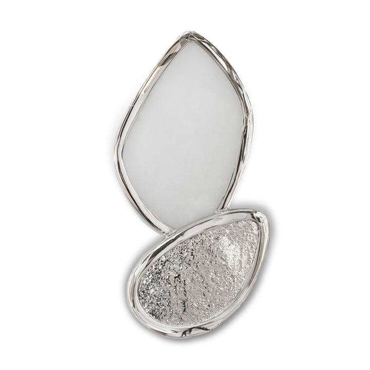 The Brass Ring Wall Sconce provides ample illumination alongside charming visuals to brighten up your home. A subtle curve to its metal scaffolding in Polished Nickel finish creates a smooth and clean outline. Take a look at its lower structure, boasting a Hand-hammered texture made of a Metal Sheet in Nickel finish. The addition of a White Alabaster Stone shade on top perfectly harmonizes its design.
