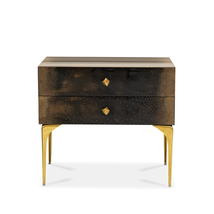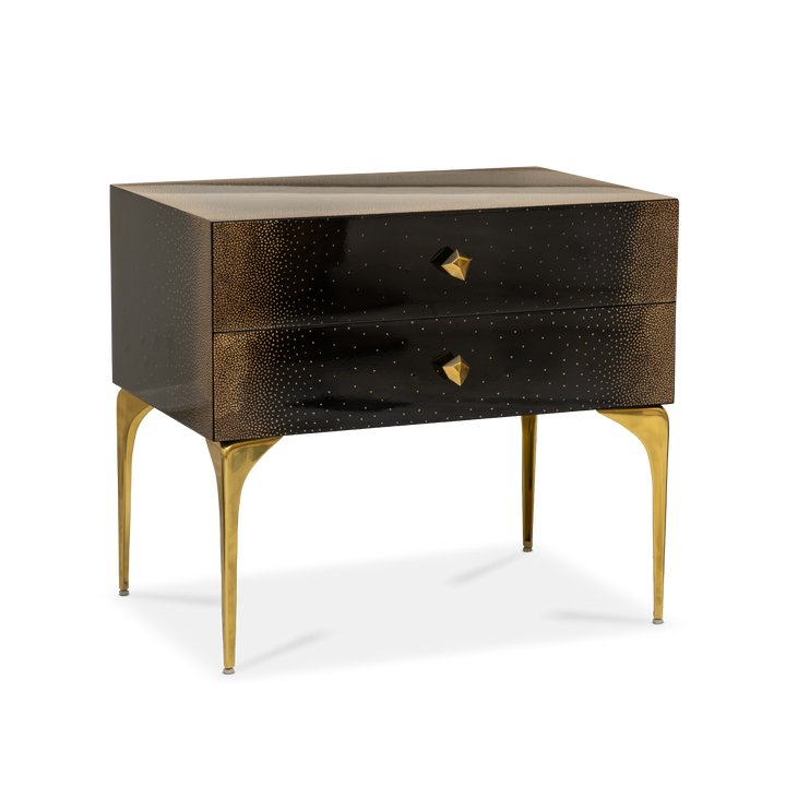 The body showcases exquisite hand-applied eggshell inlay, a true expression of artisan craftsmanship, brought to life through a meticulous 10-step lacquer finish that creates a luminous surface with depth and character. Two spacious drawers offer refined storage, accented by polished brass knobs and tapered brass legs that elevate the modern silhouette with timeless sophistication.