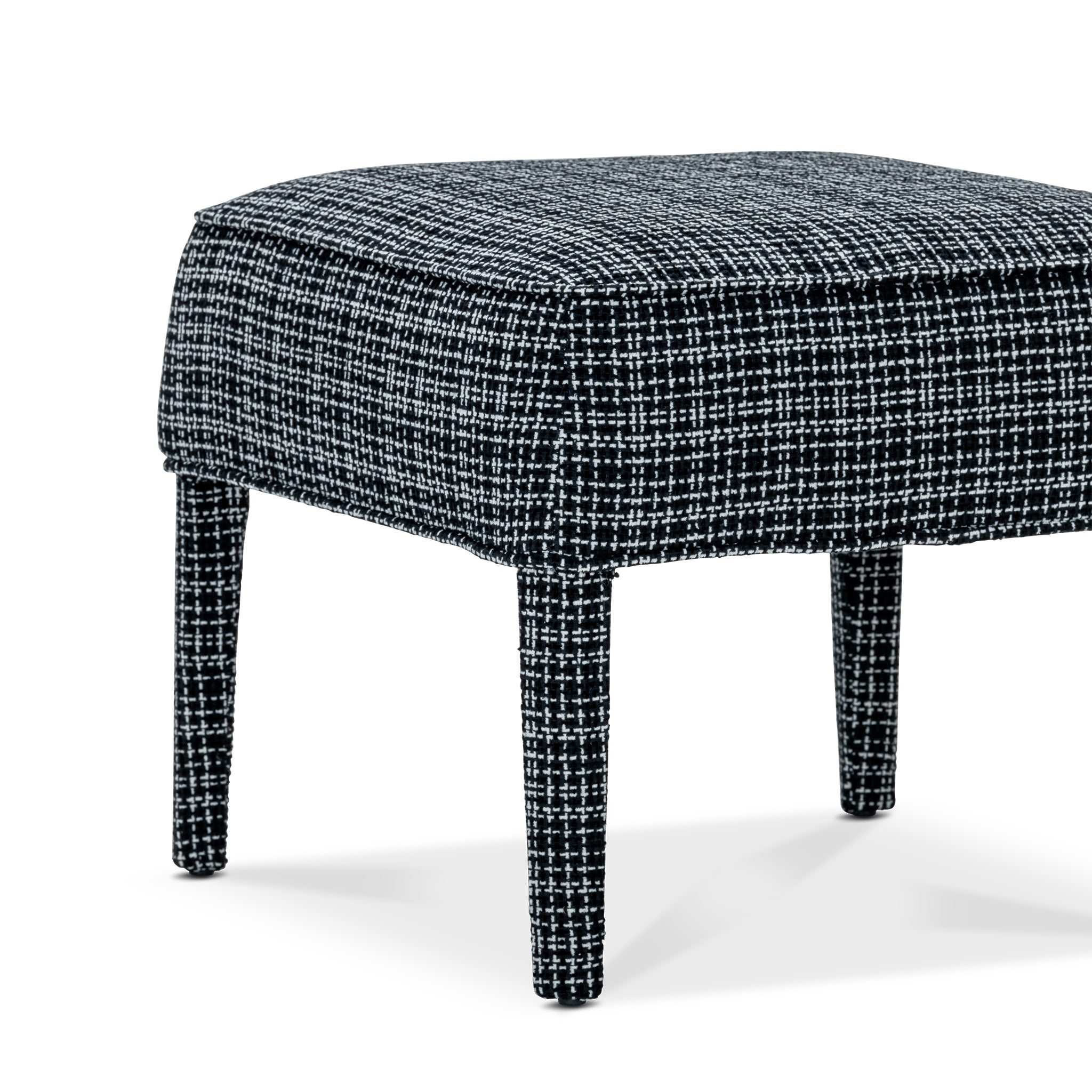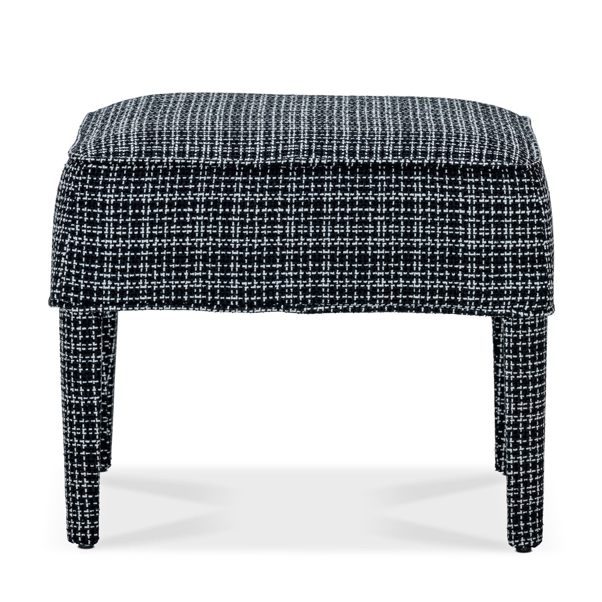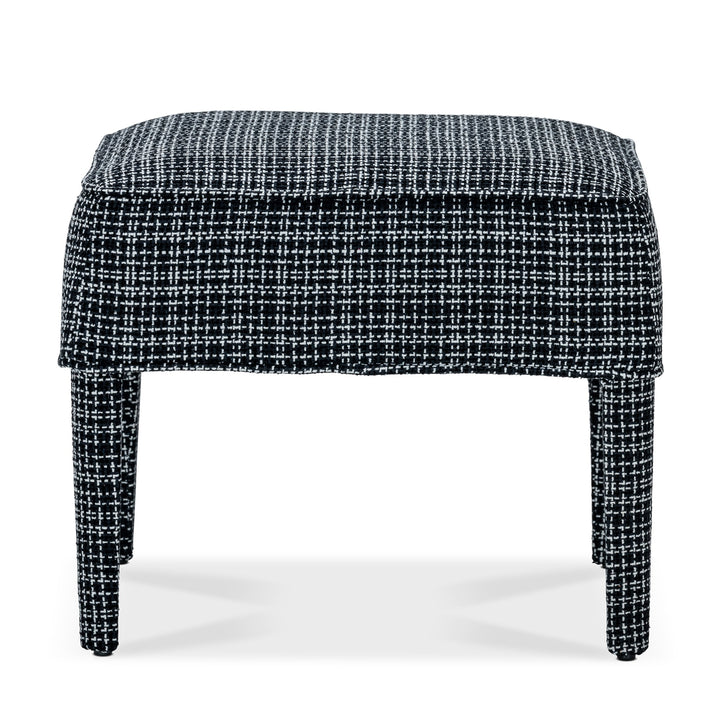 Whether you want to sit on it or lay your feet on it, this ottoman can do it all in style! It is dolled up in Chenille fabric in a fusion of Chroma Black and White shades for a flattering arrangement. Four tapered legs accented in the same fabric support this piece for an overall seamless look.