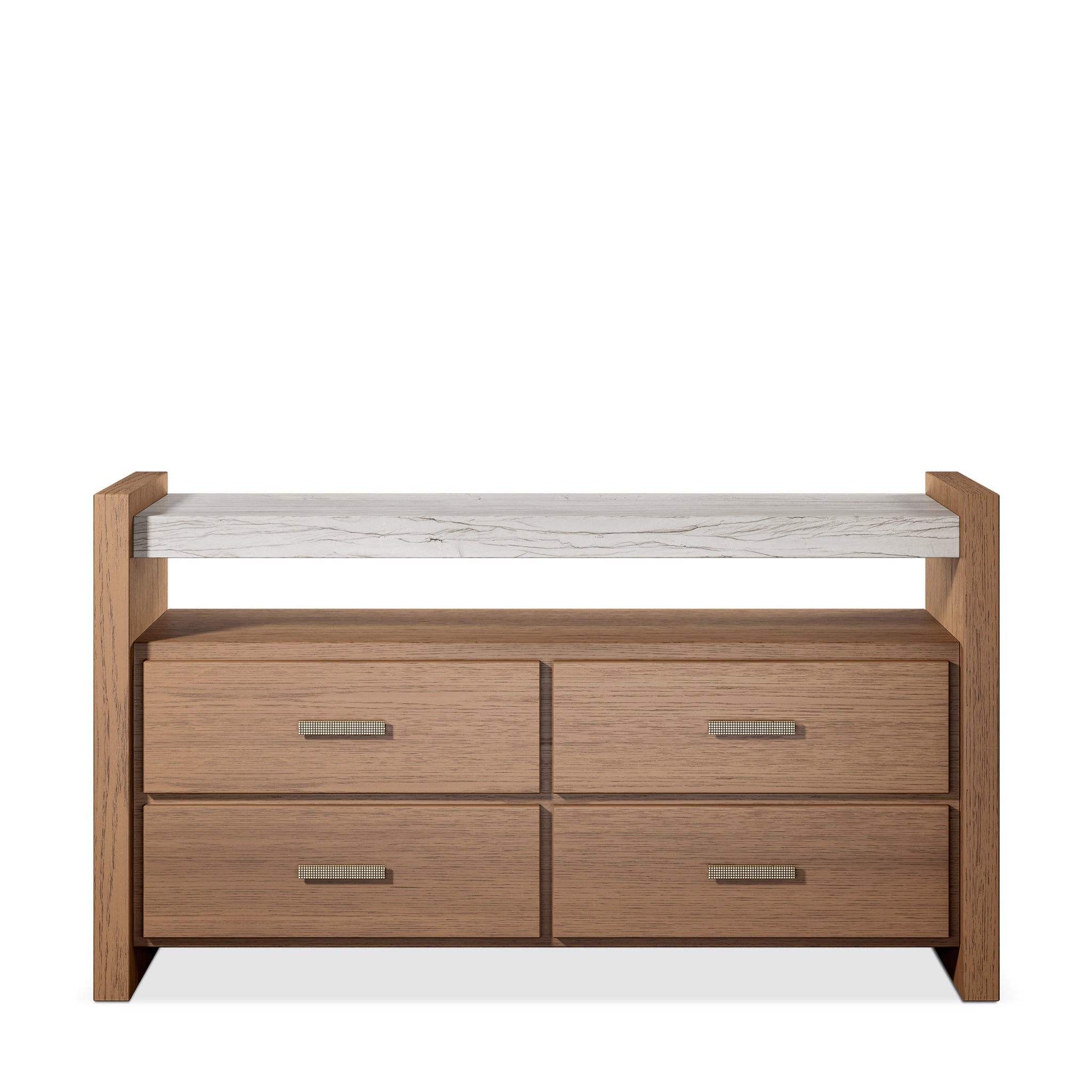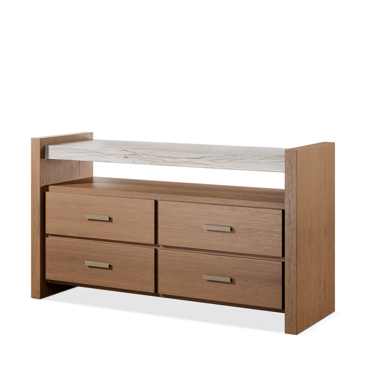 This piece from the Café Collection features a Bahia wood finish to give it a timeless look. Offering its linear framework pleasing aesthetics are the Mocca stone top and decorated hardware pulls. Spacious with four drawers with two racks, this piece makes the best of form and function.