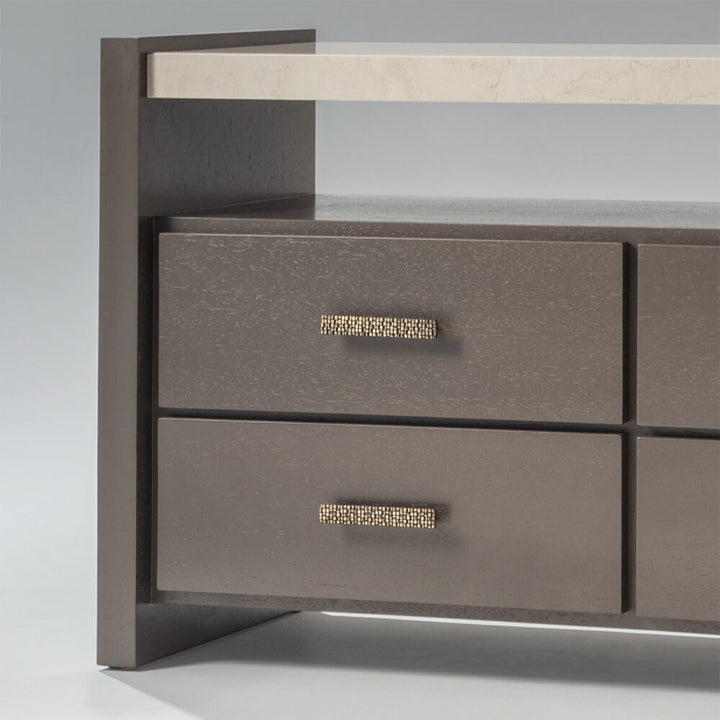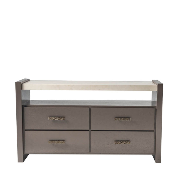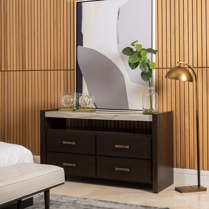 Conveying a big and luxe style, the Cafe Dresser offers four drawers and a mid shelf for a clutter-free space. A robust wooden form clad in Palma finish blends perfectly with the Cuarcita White Fog top. Decorative linear hardware inlays make it easier to tuck away your clothing.