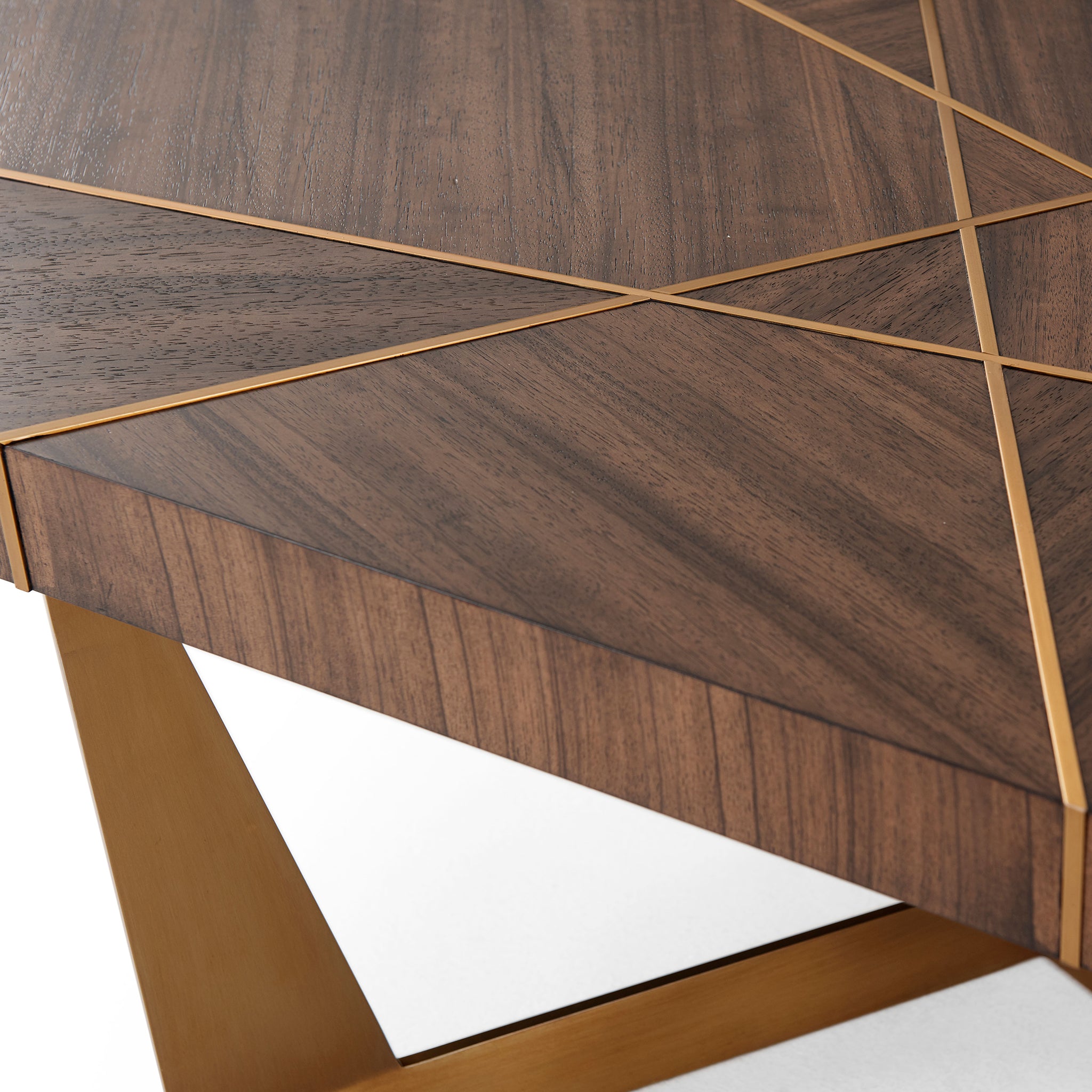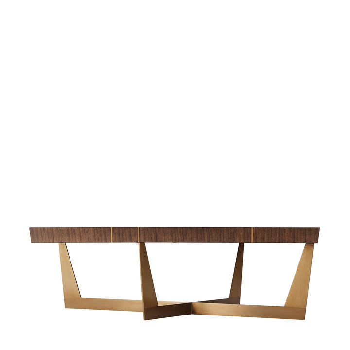 Add sleek sophistication to your living room with the Calais Rectangular Cocktail Table. Its angled-edge rectangular slab top, featuring Paldao Veneer, offers a luxurious and refined aesthetic. The intersecting Brass inlaid relief lines provide a unique and eye-catching detail that sets this table apart. Supported by an angled Brass finish Steel base, this cocktail table exudes both style and stability, making it an on-trend choice for any modern home.