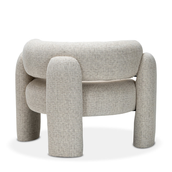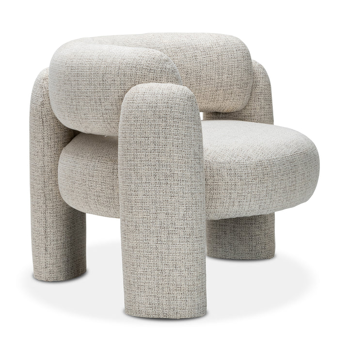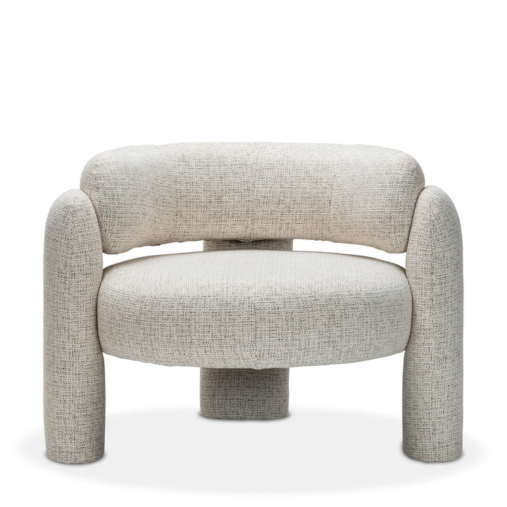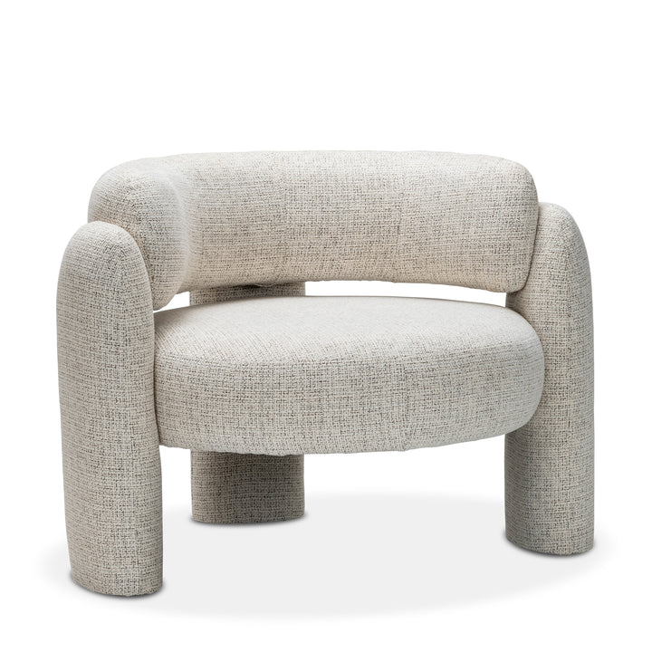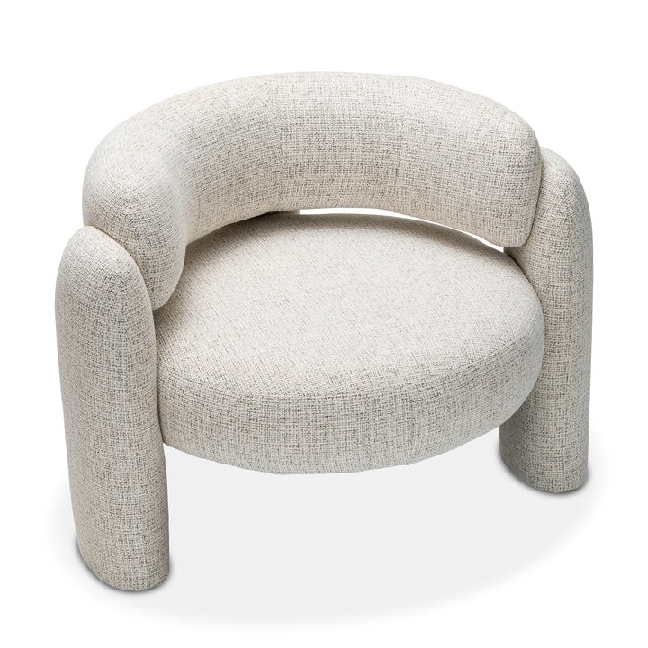 Upholstered in gabrielle oatmeal fabric, this chair stands out with its distinctive silhouette and eye-catching form. The round seat is separated from the curved backrest, creating a sculptural profile that adds a sense of lightness and modernity. The legs enhances the visual appeal while providing stability.