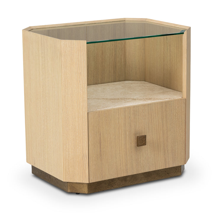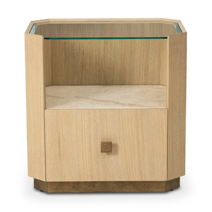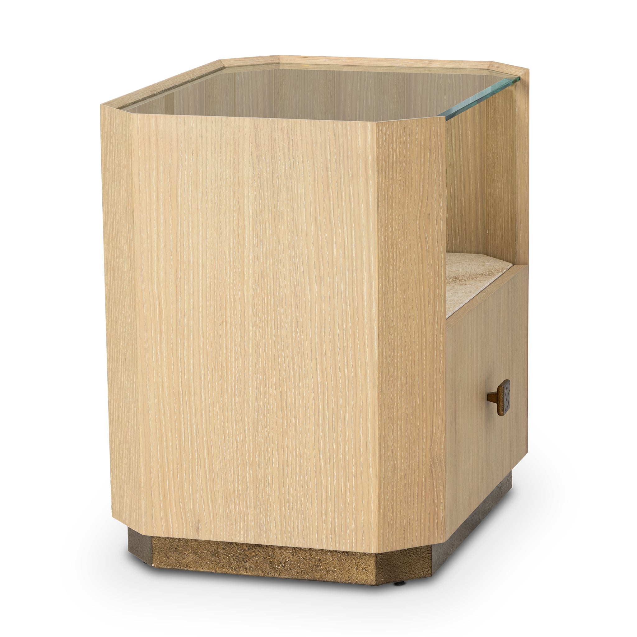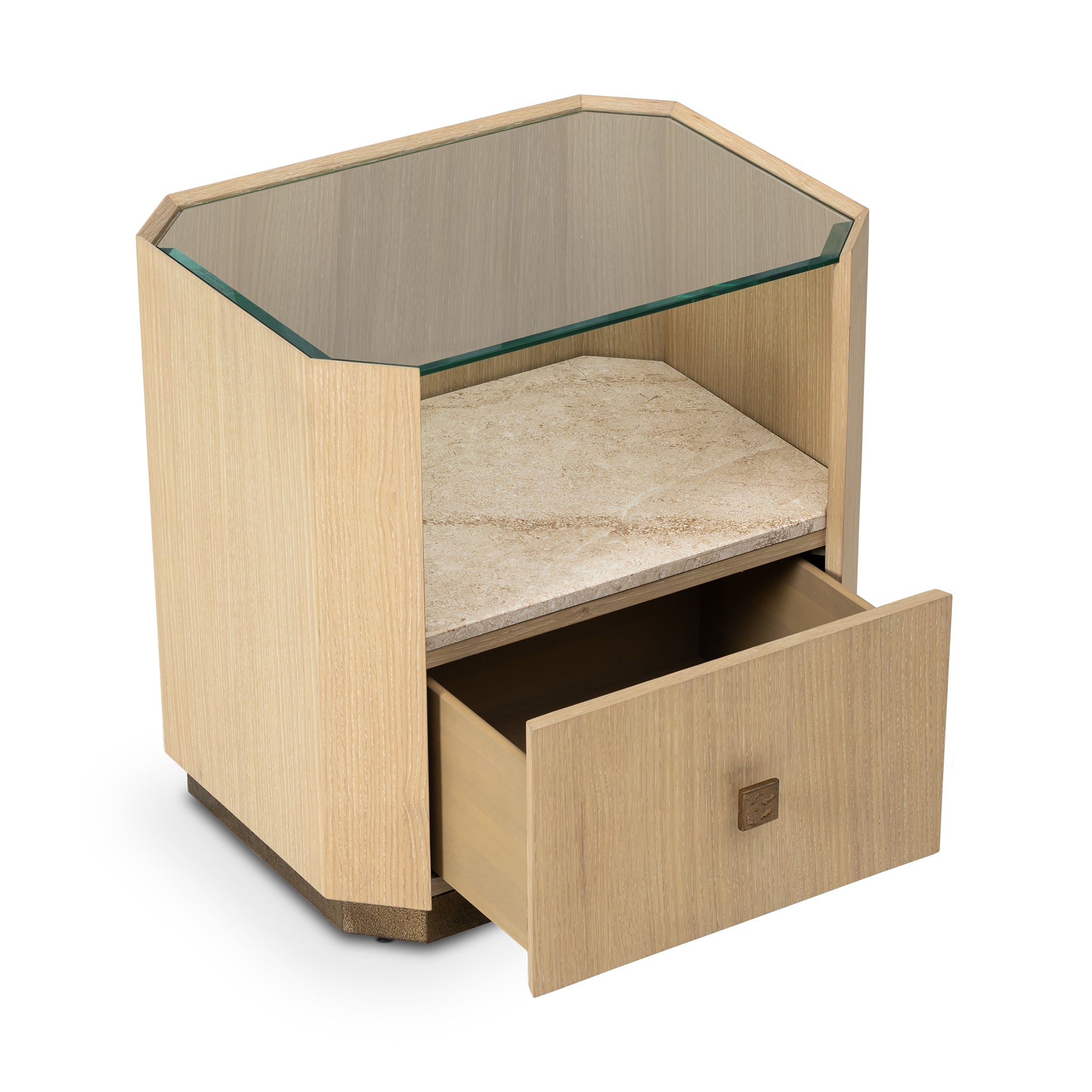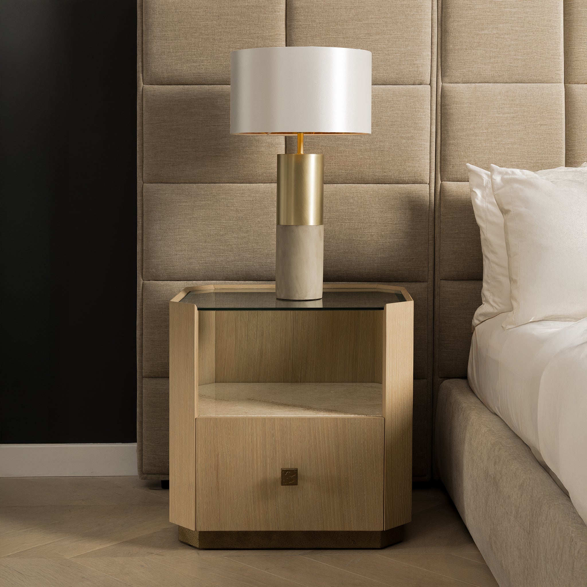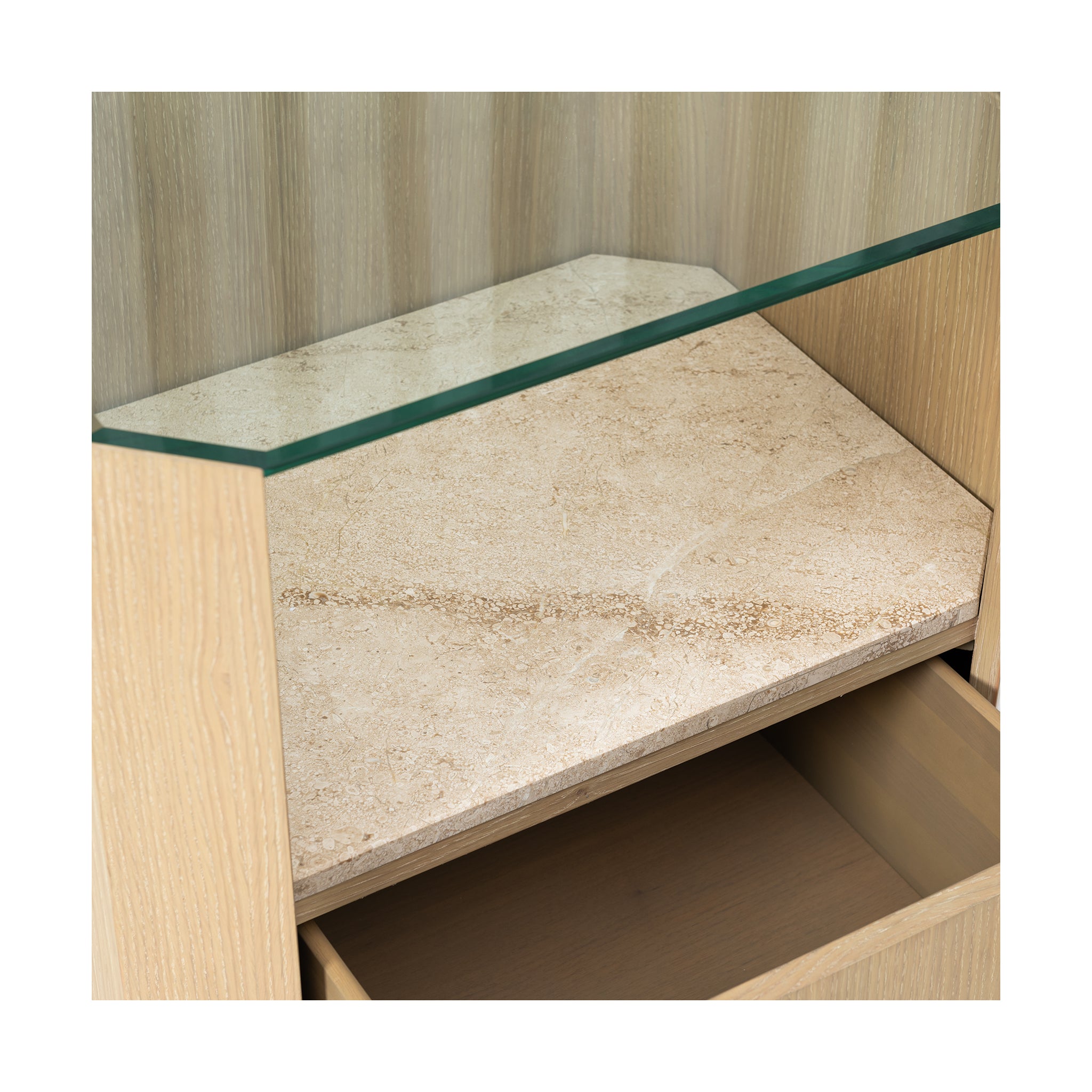 Quartered oak veneer in a hampton oak finish pairs with marquetry fronts. Inside, a solid wood drawer features a UV finish, while the top shelf is set with polished beige marble to bring a touch of elegance to the design.