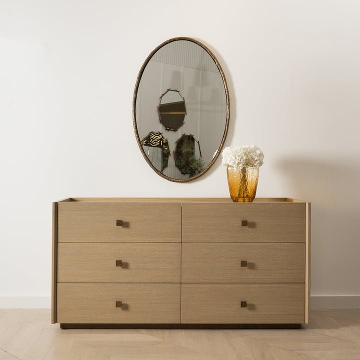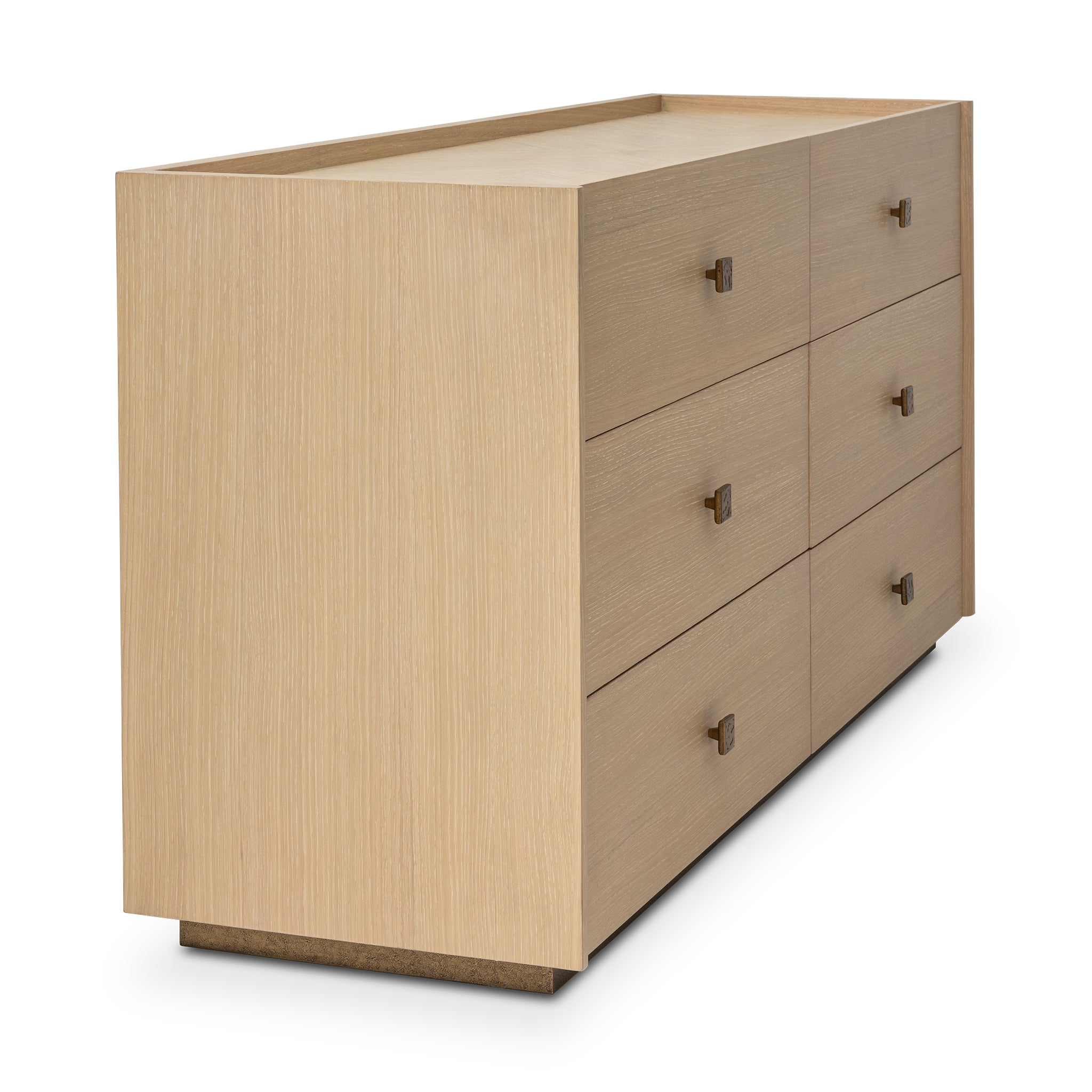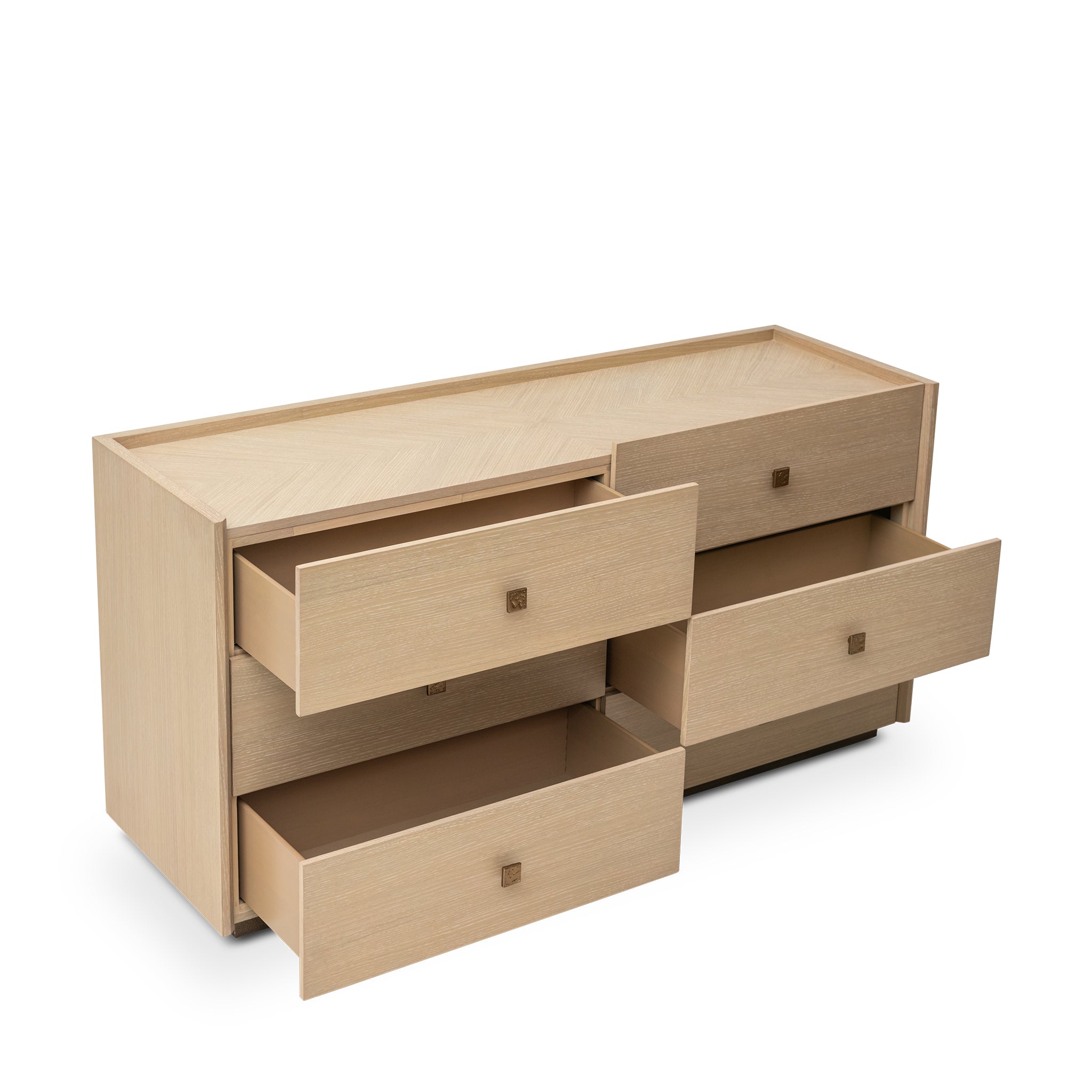 Quartered oak veneer in a hampton oak finish pairs with alternating marquetry fronts, creating a detail that is both striking and subtle. Six drawers open to reveal solid wood interiors. Textured antique brass knobs complete the piece with an elegant touch.