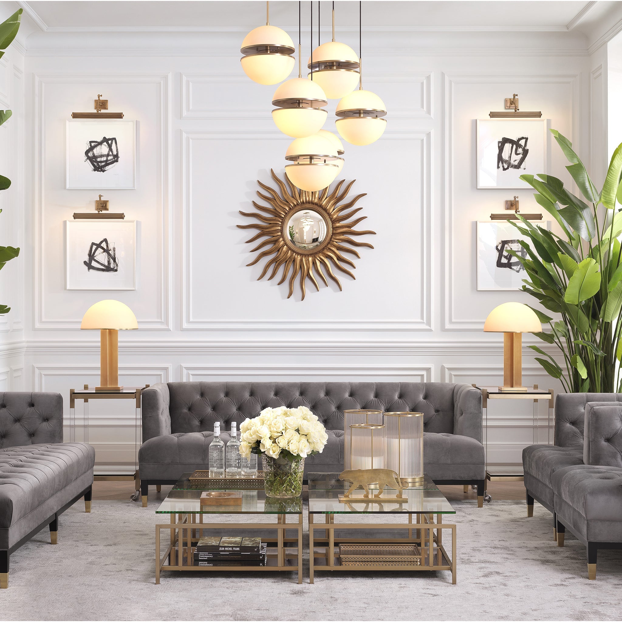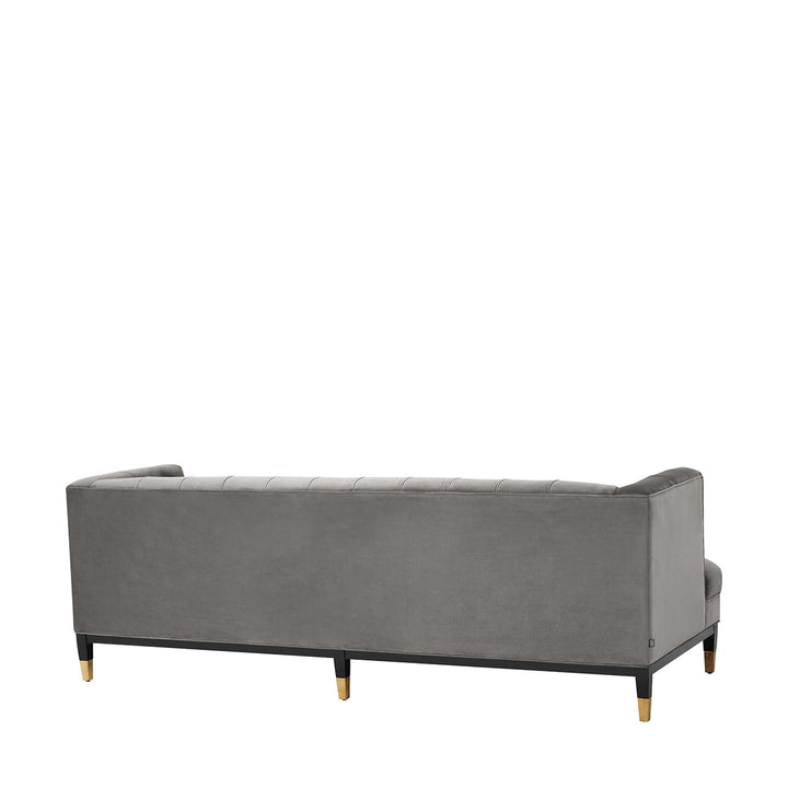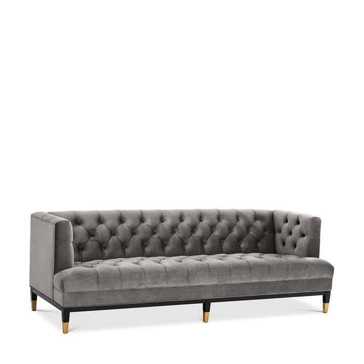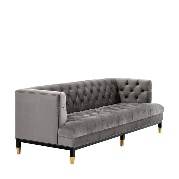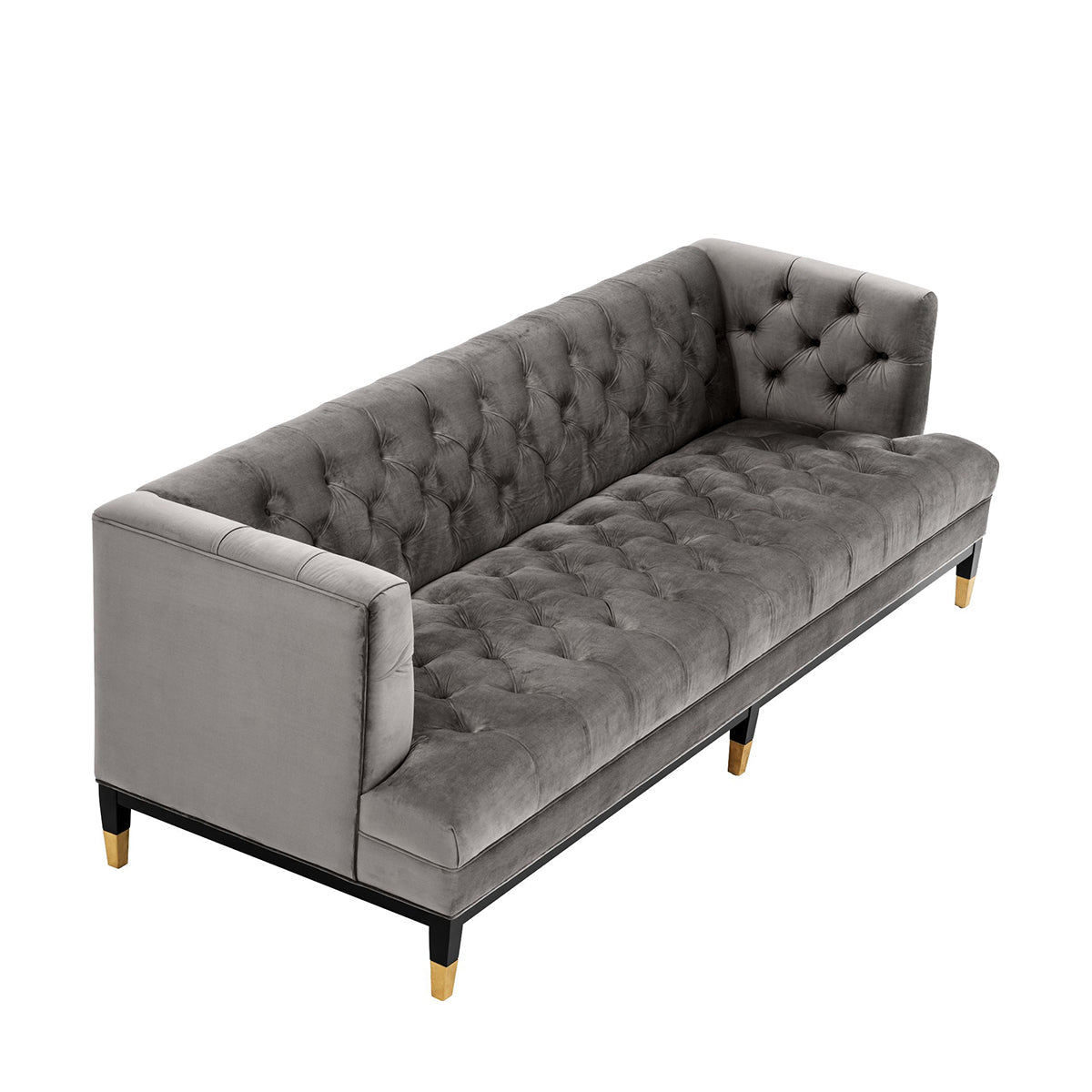 Grey Velvet upholstery with Deep-Buttoned tufting offers elegance and ageless appeal. This Chesterfield-style sofa chair will give your home a mid-century feel. Its tapered legs and Gold-plated metal ferrules add a sense of luxury and glitz.