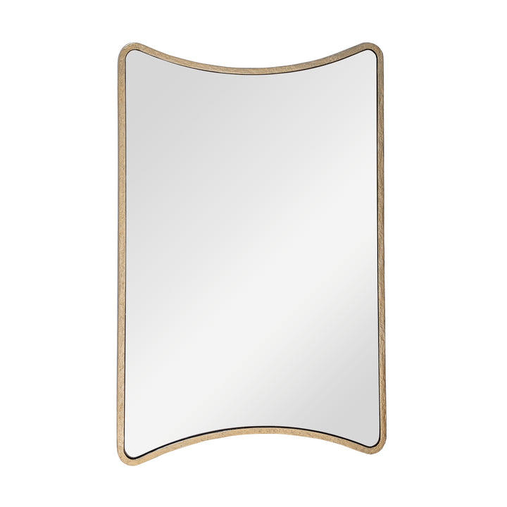 This mirror features casted metal frame finished in textured antique brass. The curved form creates a sculptural look that feels unique. A bevelled clear mirror enhances the design and makes it both functional and decorative.