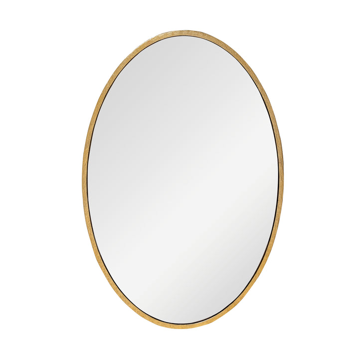 An elongated oval frame in textured antique brass finish gives this mirror a sleek profile. The smooth form brings balance and elegance to the wall. With its bevelled clear mirror, it adds a refined detail to any space.