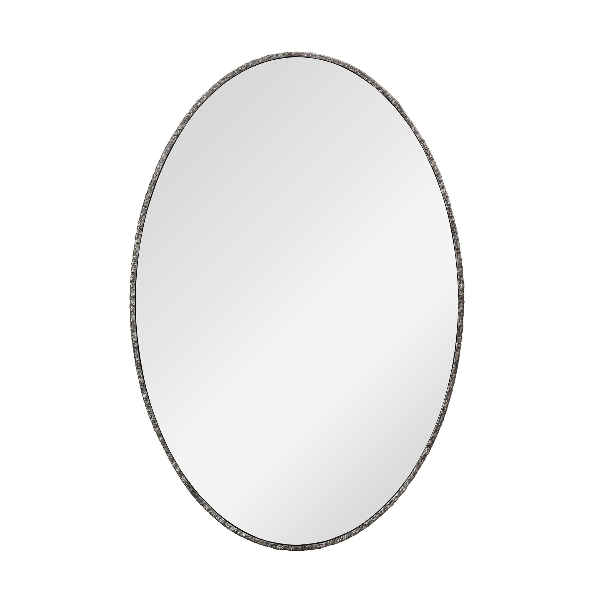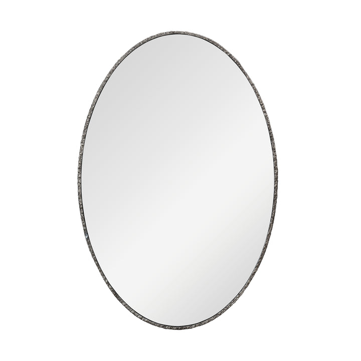 The casted metal frame in textured pewter adds depth and sophistication with its artisanal finish. A beveled clear mirror amplifies light and dimension, bringing both function and timeless beauty to the wall.