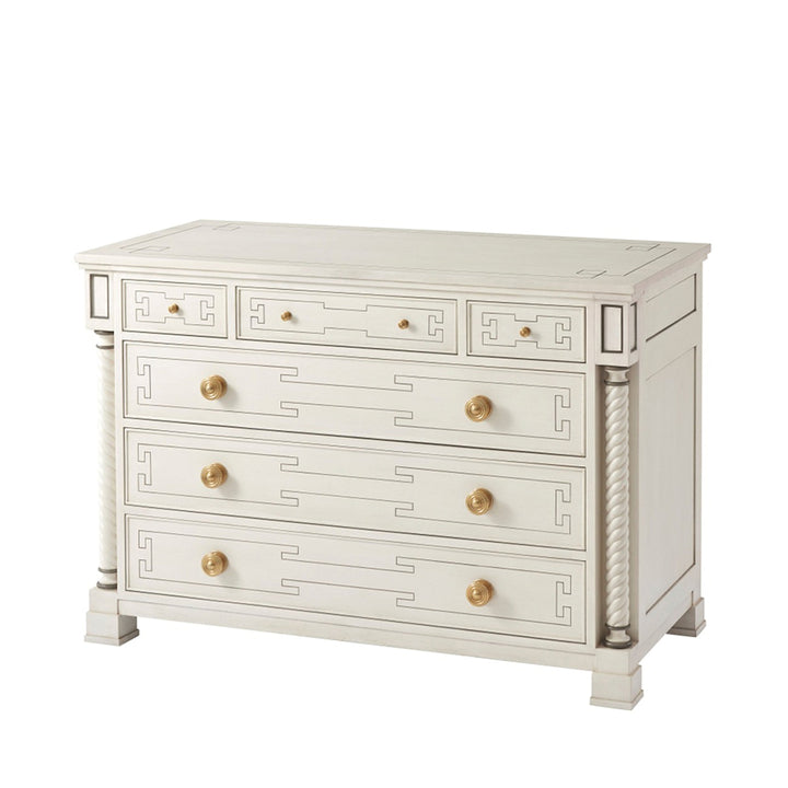 Resting on sturdy block feet, the Cecil Chest Of Drawers exudes a sense of solidity and durability, ensuring it will withstand time. A vintage-inspired silhouette clad in Salted White finishes with delicate Hipster Grey Striping for a captivating look. It provides three frieze drawers that sit atop three more long drawers accentuated by Brass handles for easy access. This piece brings a touch of elegance and functionality to any setting.