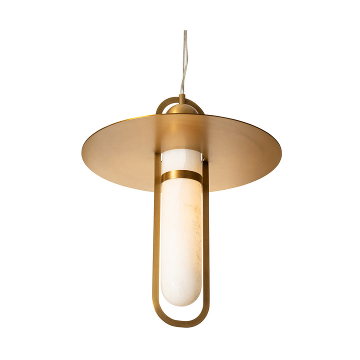 Echoing art deco’s glamour and structured elegance, this pendant showcases natural alabaster framed in an antique brass finish. Its elongated form brings timeless sophistication to any space.