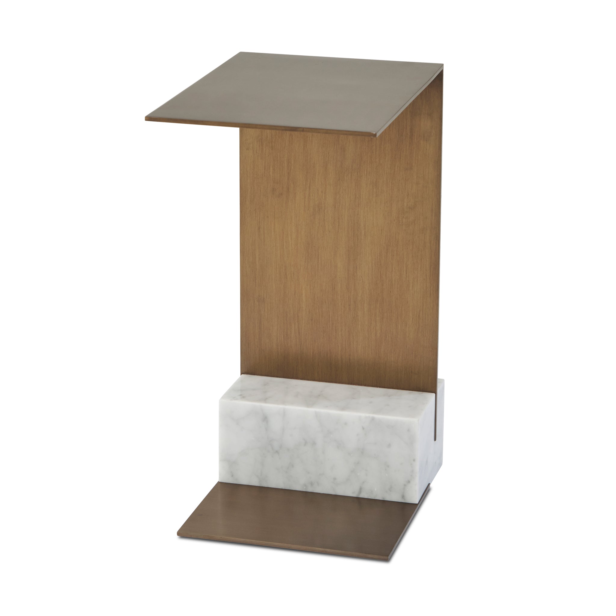 Beauty at its best! The Chaney Cantilever Table boasts an understated yet lavish aesthetic. A slim, rectangular metal top and support are highlighted by a Brushed Brass finish, lending a chic appearance. It is mounted on a Bianco Carrara Marble plinth base for a visual uplift. This piece is easy to grab and place beside your favorite sofa for holding your belongings or beverages.