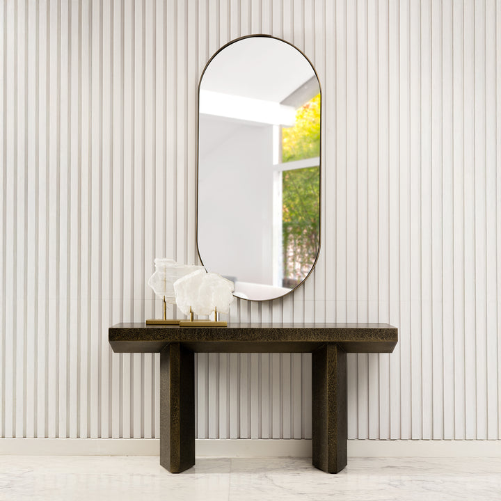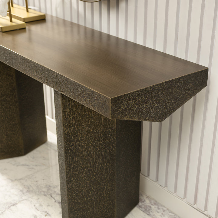 This console features a simple structure with a patinated brushed hairline brass top paired with a sturdy base in patinated textured brass. The contrast between the refined surface and the textured foundation adds visual depth and timeless character.