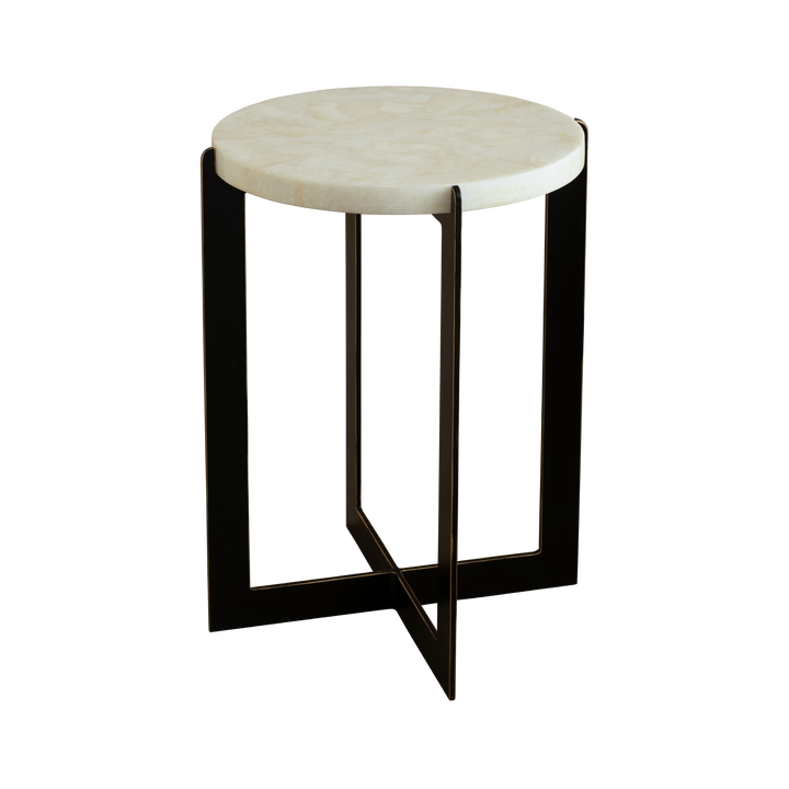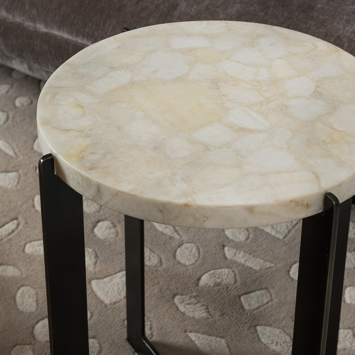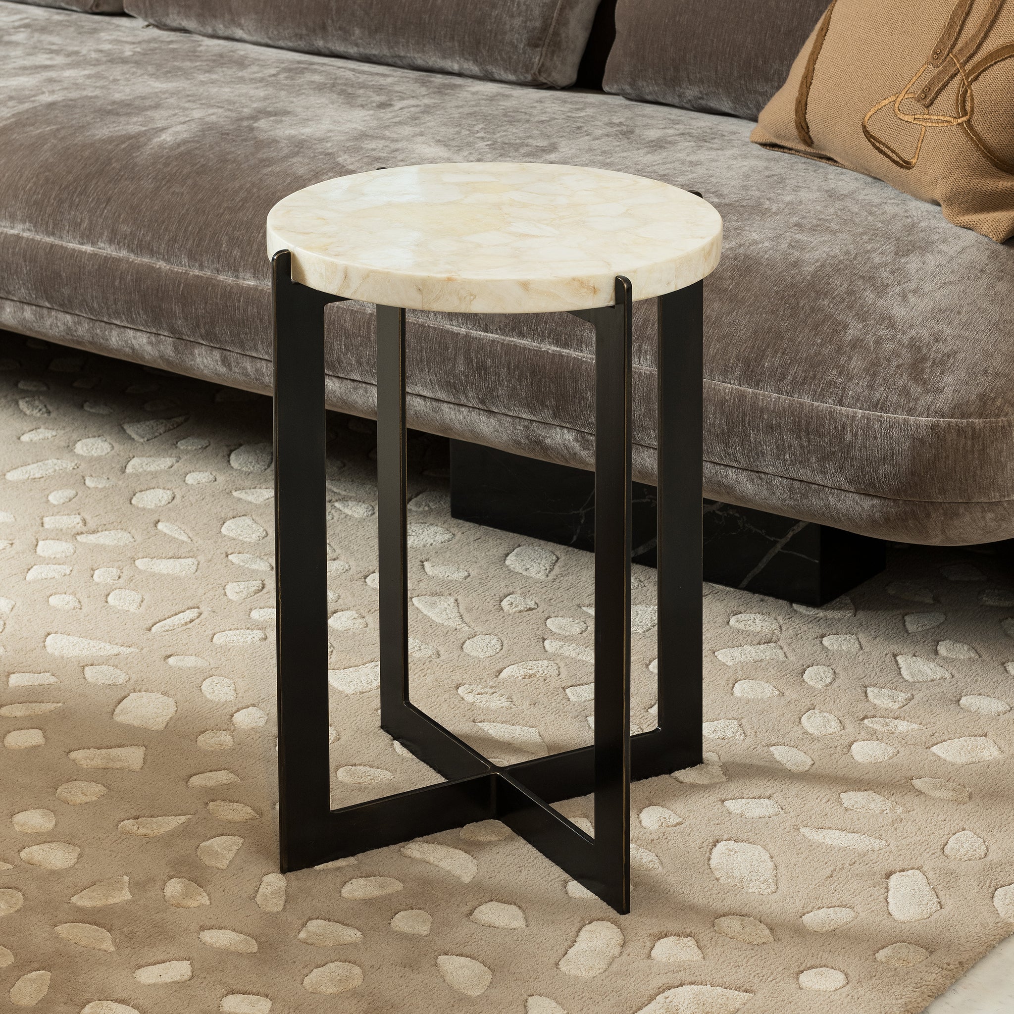 Elevate your space with this stunning piece featuring a crazy cut crystal stone top in a polished finish, sourced from the southern part of the Philippines. Its rich, oil-rubbed bronze steel base provides durability and style.