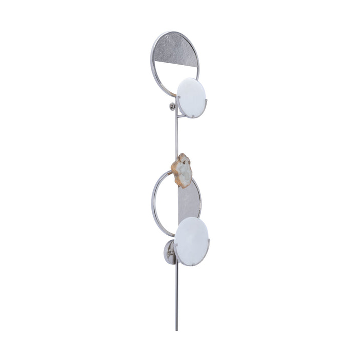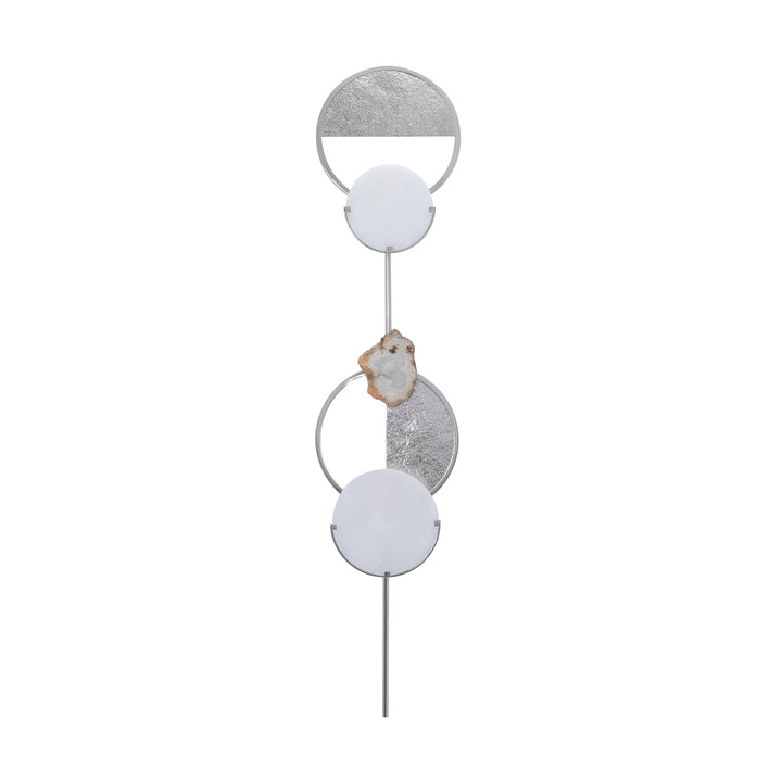 Amp up your home decor with our Circlet Wall Sconce that boasts a metal frame in a Nickel finish for a dapper look. It also adds a metal cover to its circular form with a hand-hammered texture in a Nickel finish to create the perfect balance. Its 2-PC White Alabaster Stone shade provides a soft glow to your space. The one-of-a-kind sconce is enhanced by an embedded Natural Agate Stone in the center.