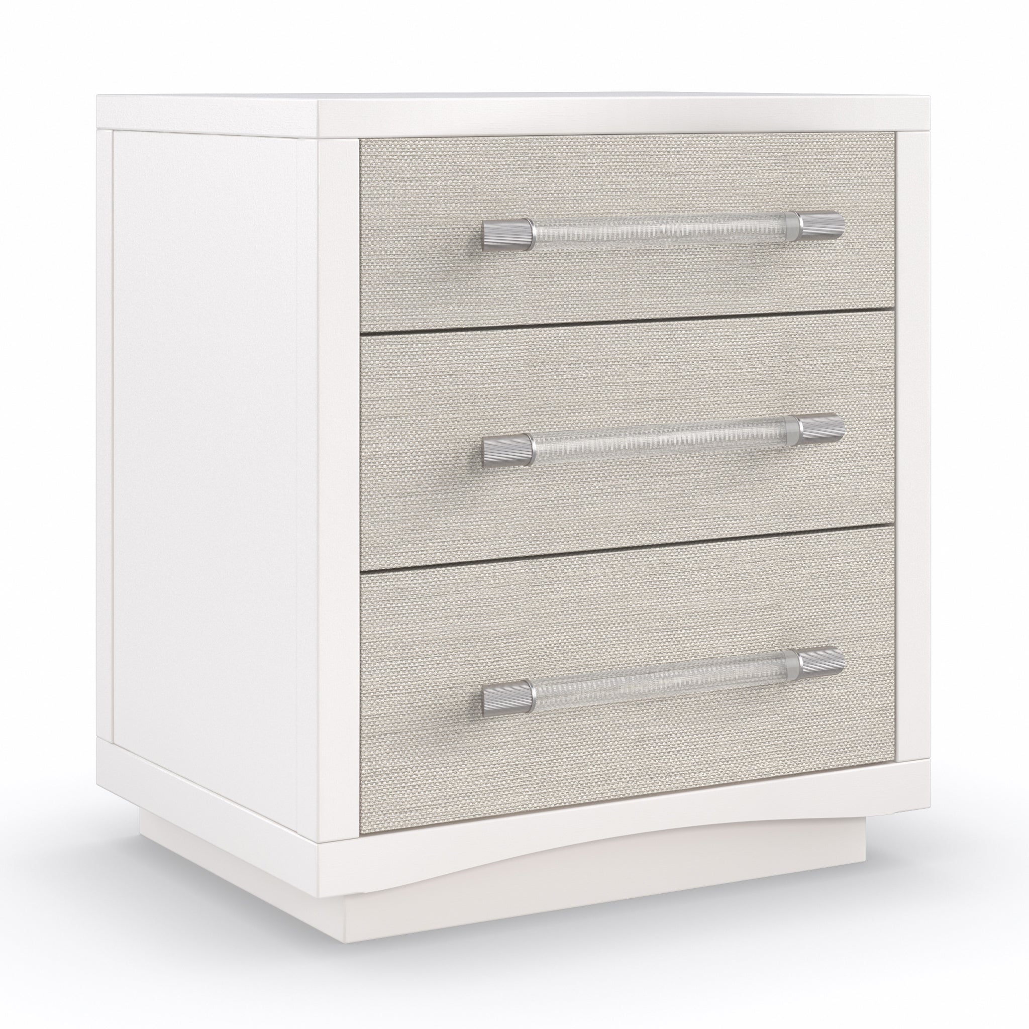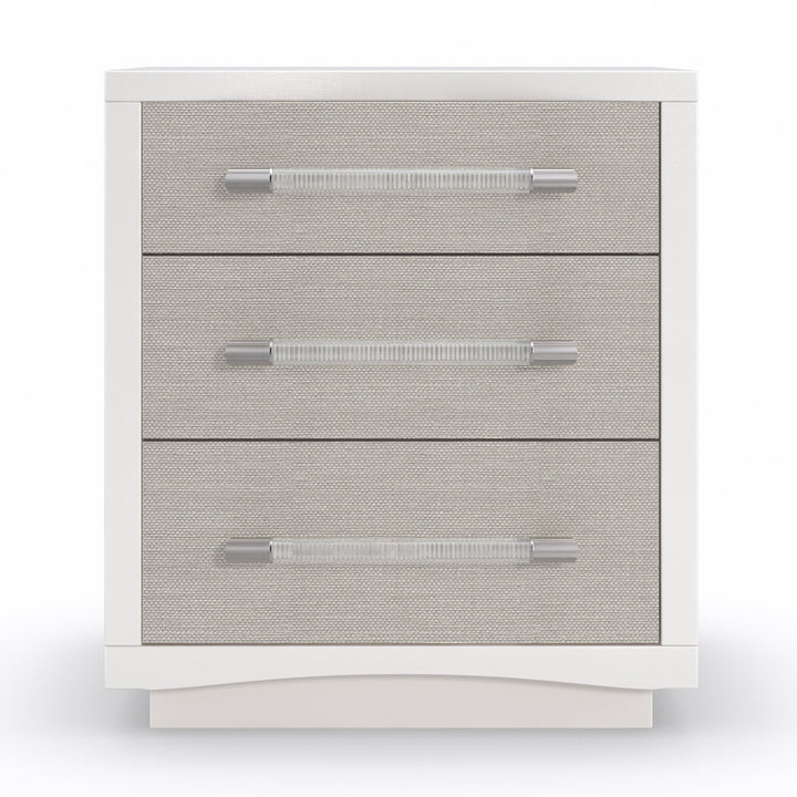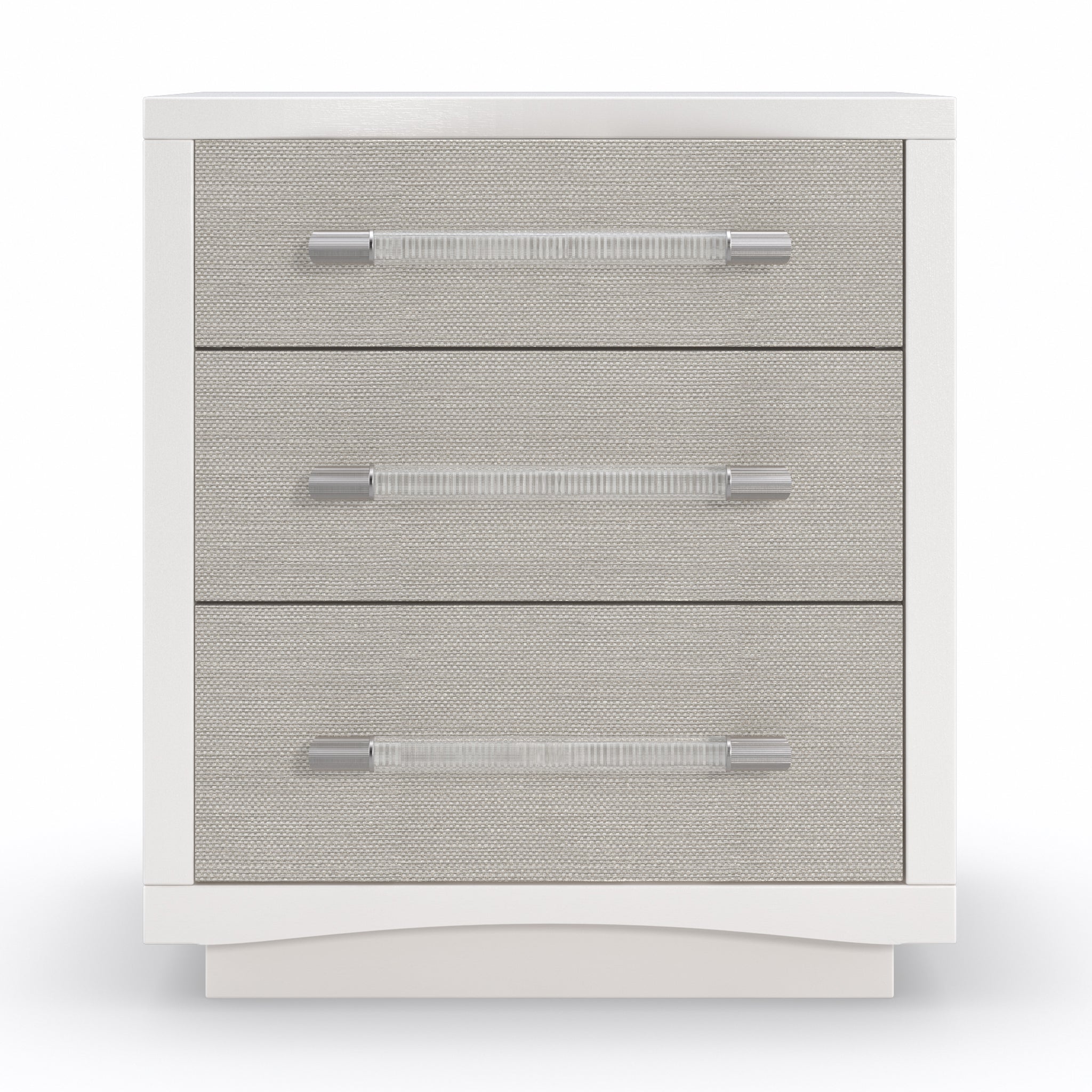This nightstand boasts crisp lines highlighted in a Pearly White finish to provide a sophisticated touch to your bedside. It has three drawers with Woven Rafia fronts done in Sunkissed Silver finish to compliment the whole aesthetics. Three Acrylic handles capped in ribbed Stainless Steel allow you to store your stuff effortlessly.